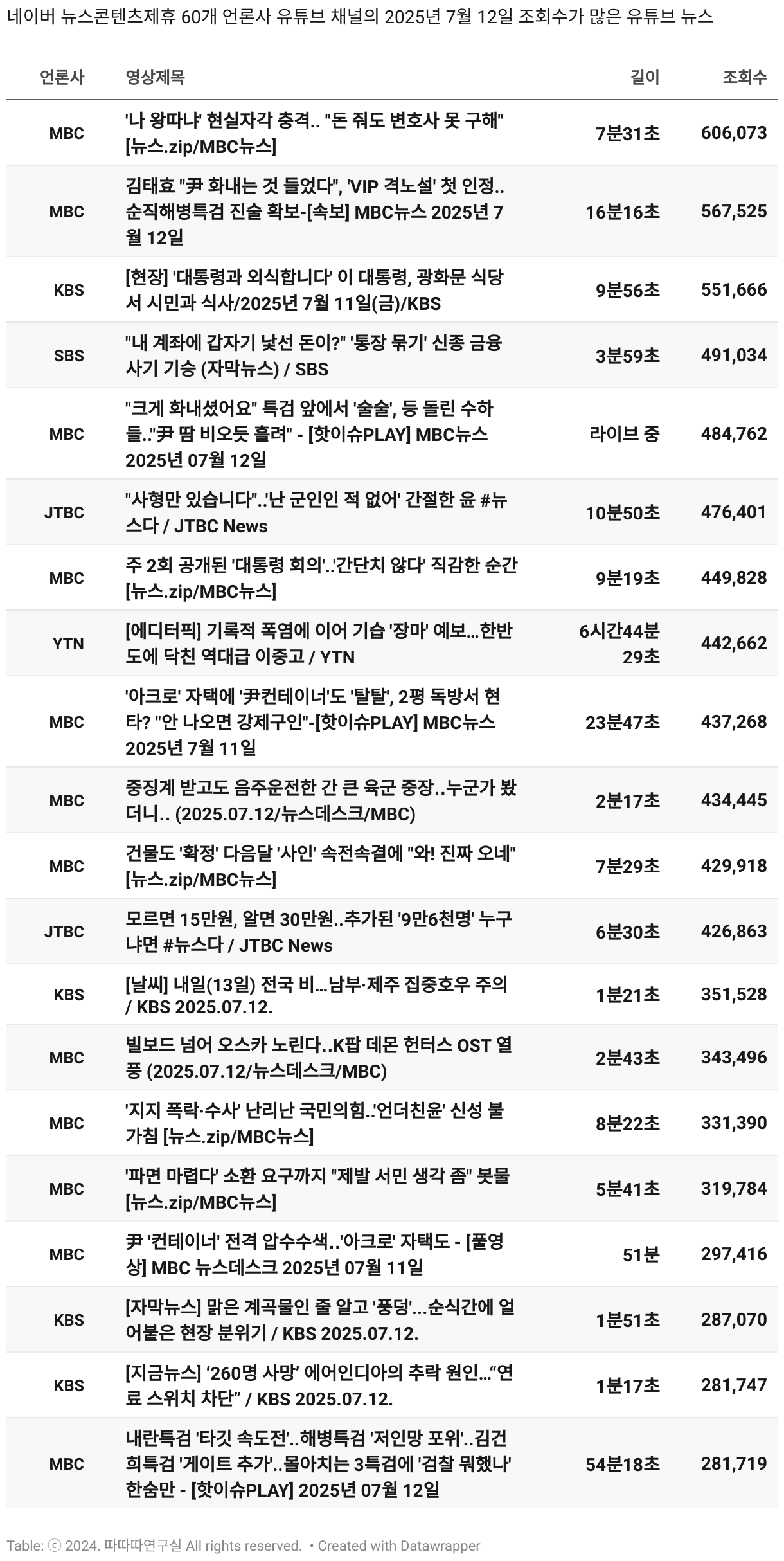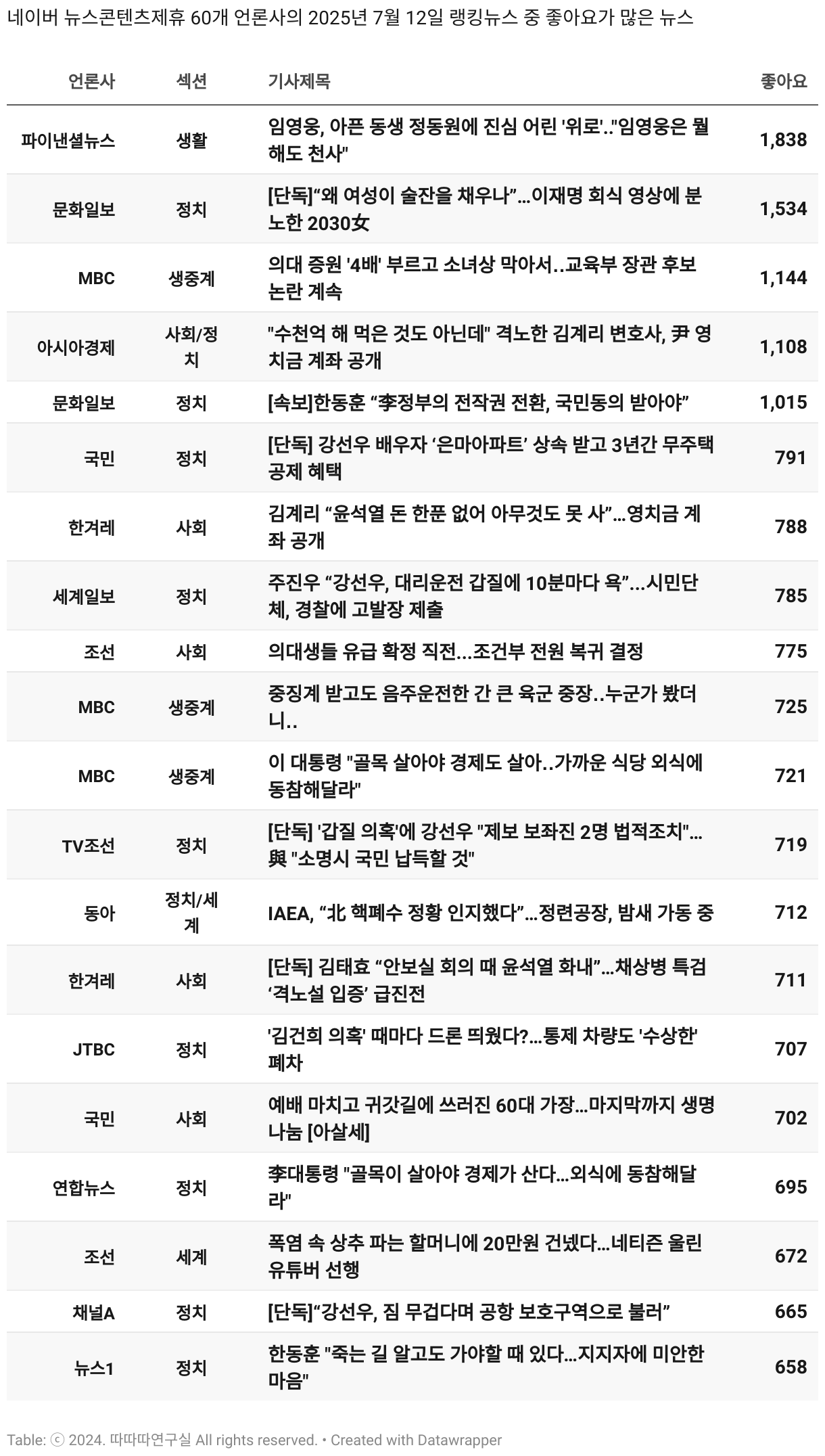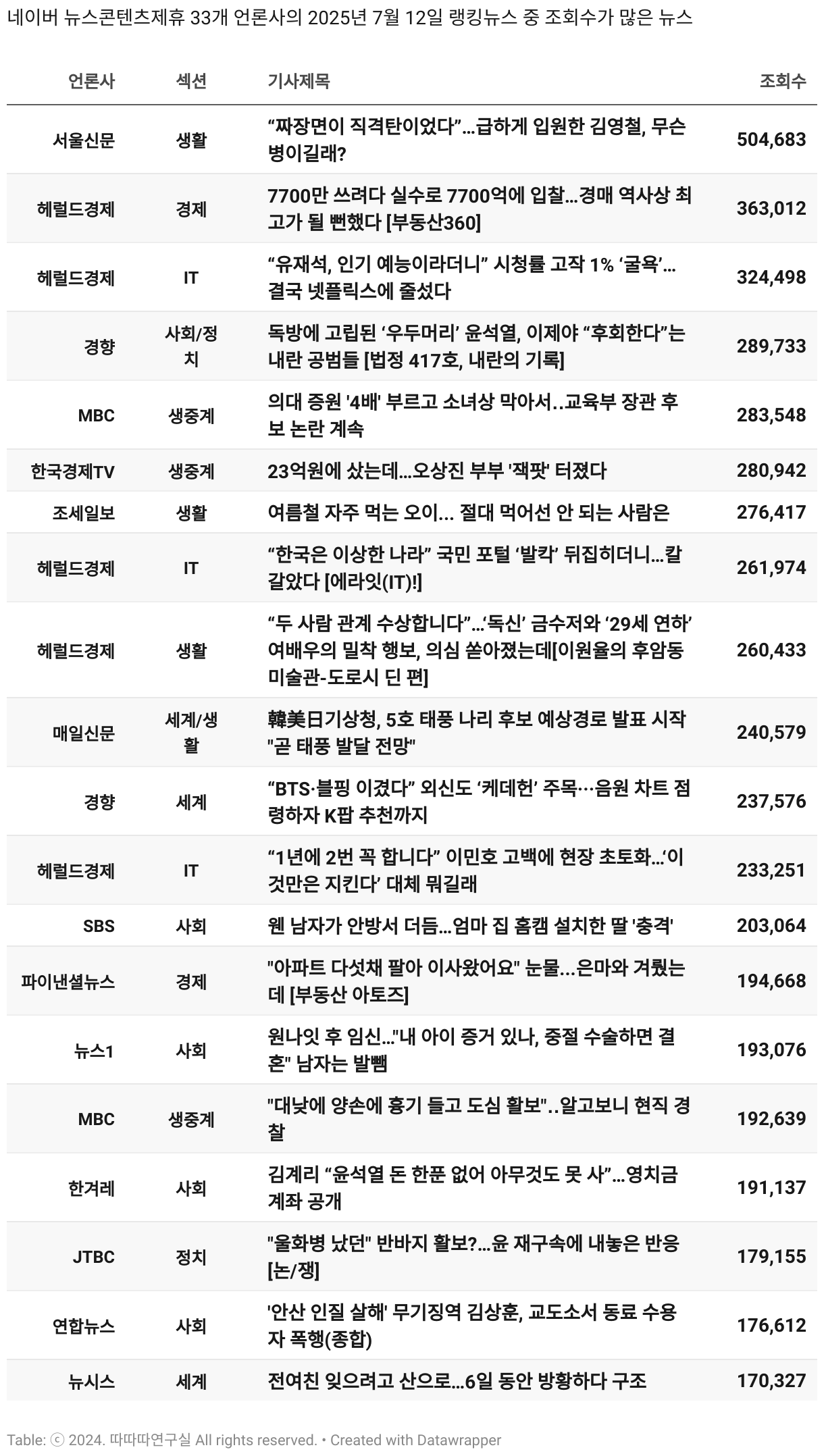 *데이터 수집 기간 : 2024년 6월 10일 *데이터 수집 대상 : 네이버 뉴스콘텐츠제휴 60개 언론사. 종합일간지 10개(경향신문, 국민일보, 동아일보, 문화일보, 서울신문, 세계일보, 조선일보, 중앙일보, 한겨레신문, 한국일보), 방송/통신사 14개(뉴스1, 뉴시스, 연합뉴스, 연합뉴스TV, 채널A, 한국경제TV, JTBC, KBS, MBC, MBN, SBS, SBS BIZ, TV조선, YTN), 경제지 11개(매일경제, 머니투데이, 비즈워치, 서울경제, 아시아경제, 이데일리, 조선비즈, 조세일보, 파이낸셜뉴스, 한국경제(유튜브제외), 헤럴드경제) 인터넷 8개(노컷뉴스, 더팩트, 데일리안, 머니S, 미디어오늘, 아이뉴스24, 오마이뉴스, 프레시안), IT 5개(디지털데일리,디지털타임스, 블로터, 전자신문, 지디넷코리아), 지역 12개(강원도민일보, 강원일보, 경기일보, 국제신문, 대구MBC, 대전일보, 매일신문, 부산일보, 전주MBC, CJB청주방송, JIBS, kbc광주방송)