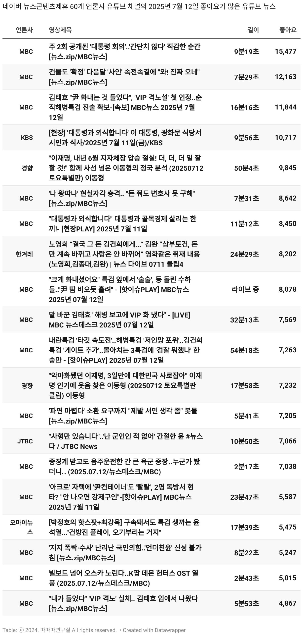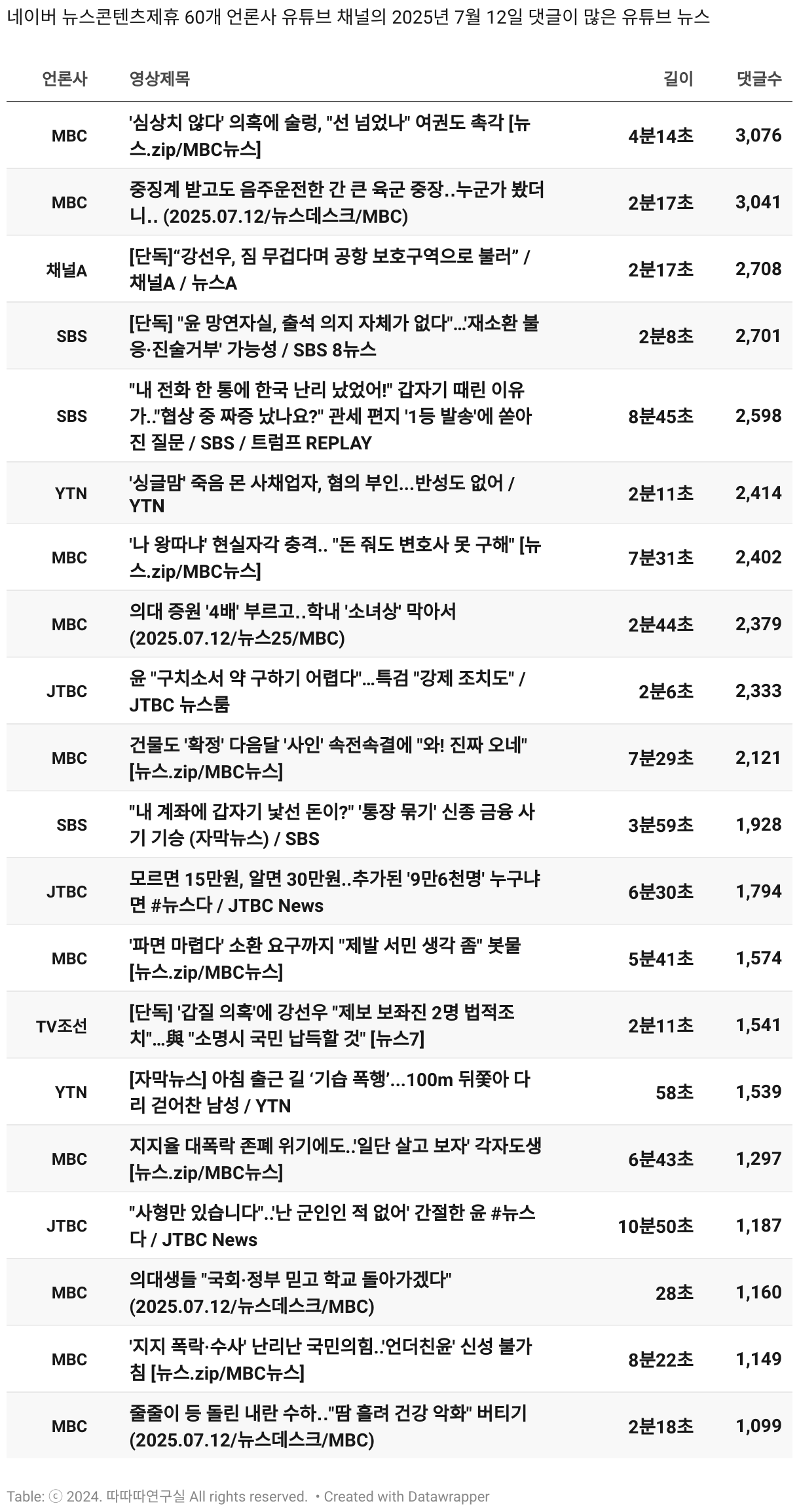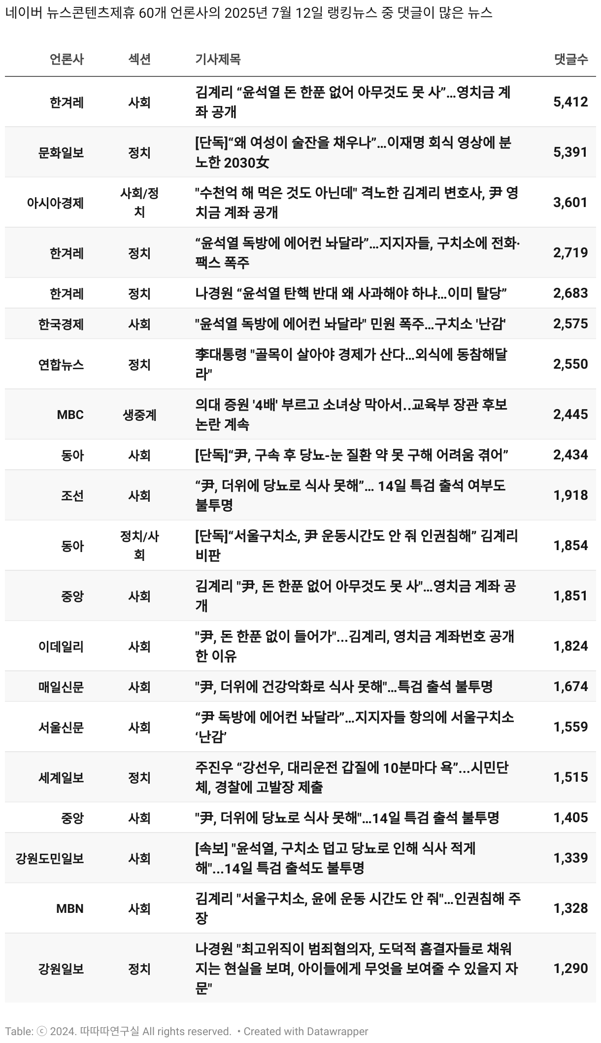 *데이터 수집 기간 : 2024년 6월 10일 *데이터 수집 대상 : 네이버 뉴스콘텐츠제휴 60개 언론사. 종합일간지 10개(경향신문, 국민일보, 동아일보, 문화일보, 서울신문, 세계일보, 조선일보, 중앙일보, 한겨레신문, 한국일보), 방송/통신사 14개(뉴스1, 뉴시스, 연합뉴스, 연합뉴스TV, 채널A, 한국경제TV, JTBC, KBS, MBC, MBN, SBS, SBS BIZ, TV조선, YTN), 경제지 11개(매일경제, 머니투데이, 비즈워치, 서울경제, 아시아경제, 이데일리, 조선비즈, 조세일보, 파이낸셜뉴스, 한국경제(유튜브제외), 헤럴드경제) 인터넷 8개(노컷뉴스, 더팩트, 데일리안, 머니S, 미디어오늘, 아이뉴스24, 오마이뉴스, 프레시안), IT 5개(디지털데일리,디지털타임스, 블로터, 전자신문, 지디넷코리아), 지역 12개(강원도민일보, 강원일보, 경기일보, 국제신문, 대구MBC, 대전일보, 매일신문, 부산일보, 전주MBC, CJB청주방송, JIBS, kbc광주방송)
