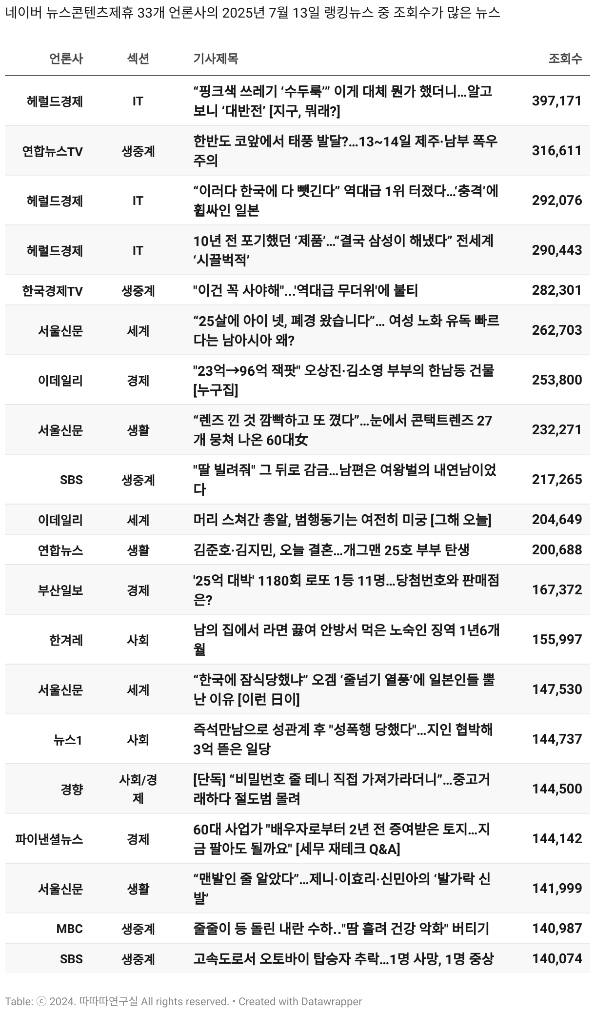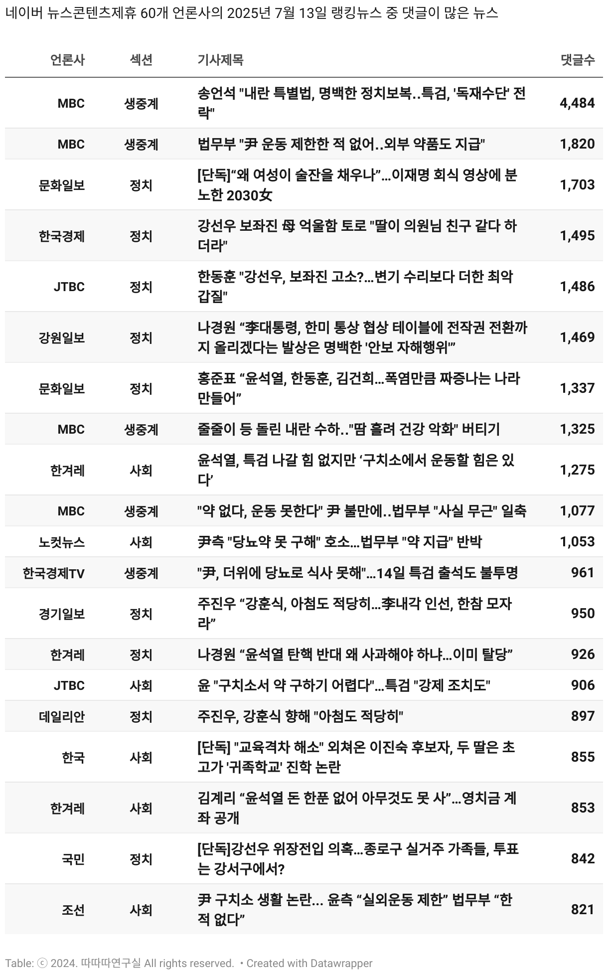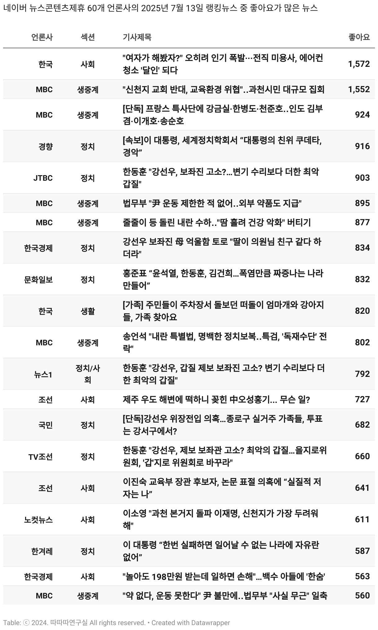 *데이터 수집 기간 : 2024년 6월 10일 *데이터 수집 대상 : 네이버 뉴스콘텐츠제휴 60개 언론사. 종합일간지 10개(경향신문, 국민일보, 동아일보, 문화일보, 서울신문, 세계일보, 조선일보, 중앙일보, 한겨레신문, 한국일보), 방송/통신사 14개(뉴스1, 뉴시스, 연합뉴스, 연합뉴스TV, 채널A, 한국경제TV, JTBC, KBS, MBC, MBN, SBS, SBS BIZ, TV조선, YTN), 경제지 11개(매일경제, 머니투데이, 비즈워치, 서울경제, 아시아경제, 이데일리, 조선비즈, 조세일보, 파이낸셜뉴스, 한국경제(유튜브제외), 헤럴드경제) 인터넷 8개(노컷뉴스, 더팩트, 데일리안, 머니S, 미디어오늘, 아이뉴스24, 오마이뉴스, 프레시안), IT 5개(디지털데일리,디지털타임스, 블로터, 전자신문, 지디넷코리아), 지역 12개(강원도민일보, 강원일보, 경기일보, 국제신문, 대구MBC, 대전일보, 매일신문, 부산일보, 전주MBC, CJB청주방송, JIBS, kbc광주방송)