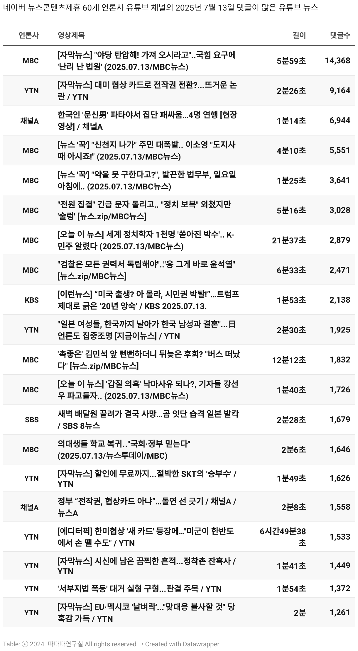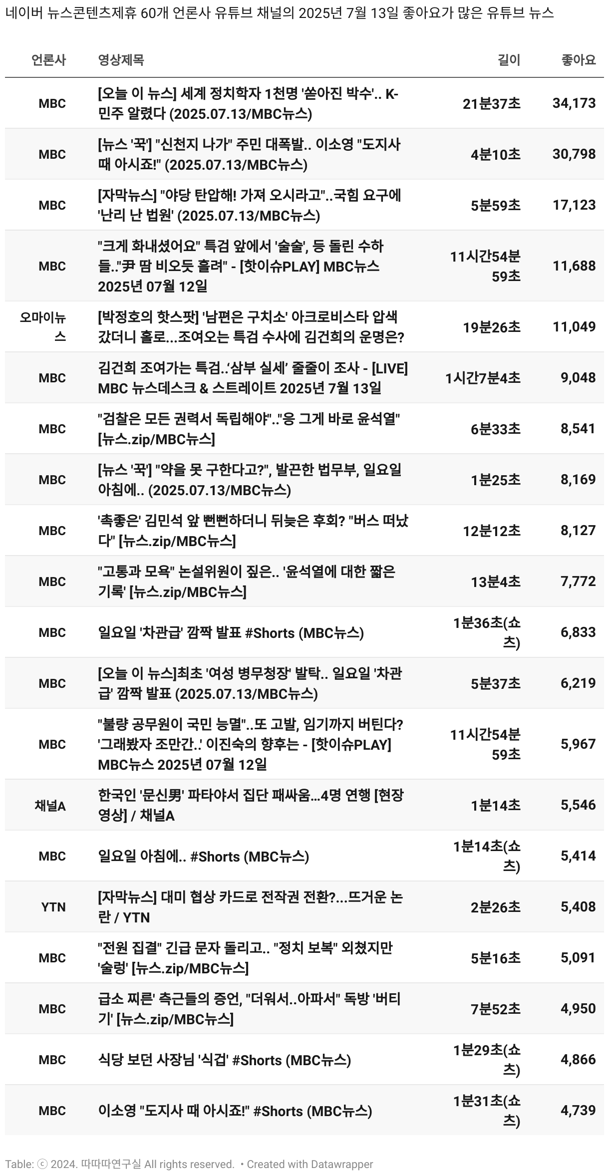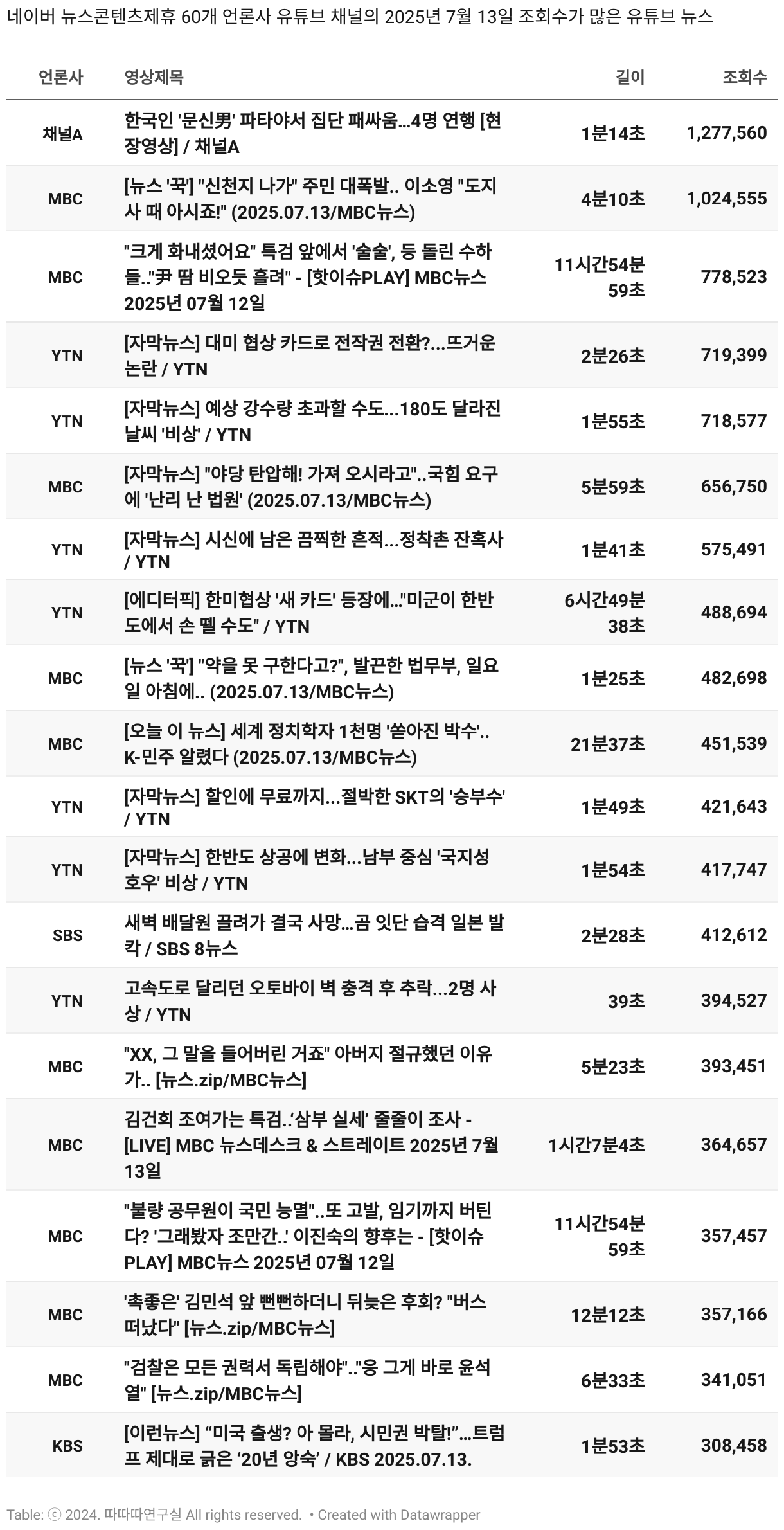 *데이터 수집 기간 : 2024년 6월 10일 *데이터 수집 대상 : 네이버 뉴스콘텐츠제휴 60개 언론사. 종합일간지 10개(경향신문, 국민일보, 동아일보, 문화일보, 서울신문, 세계일보, 조선일보, 중앙일보, 한겨레신문, 한국일보), 방송/통신사 14개(뉴스1, 뉴시스, 연합뉴스, 연합뉴스TV, 채널A, 한국경제TV, JTBC, KBS, MBC, MBN, SBS, SBS BIZ, TV조선, YTN), 경제지 11개(매일경제, 머니투데이, 비즈워치, 서울경제, 아시아경제, 이데일리, 조선비즈, 조세일보, 파이낸셜뉴스, 한국경제(유튜브제외), 헤럴드경제) 인터넷 8개(노컷뉴스, 더팩트, 데일리안, 머니S, 미디어오늘, 아이뉴스24, 오마이뉴스, 프레시안), IT 5개(디지털데일리,디지털타임스, 블로터, 전자신문, 지디넷코리아), 지역 12개(강원도민일보, 강원일보, 경기일보, 국제신문, 대구MBC, 대전일보, 매일신문, 부산일보, 전주MBC, CJB청주방송, JIBS, kbc광주방송)