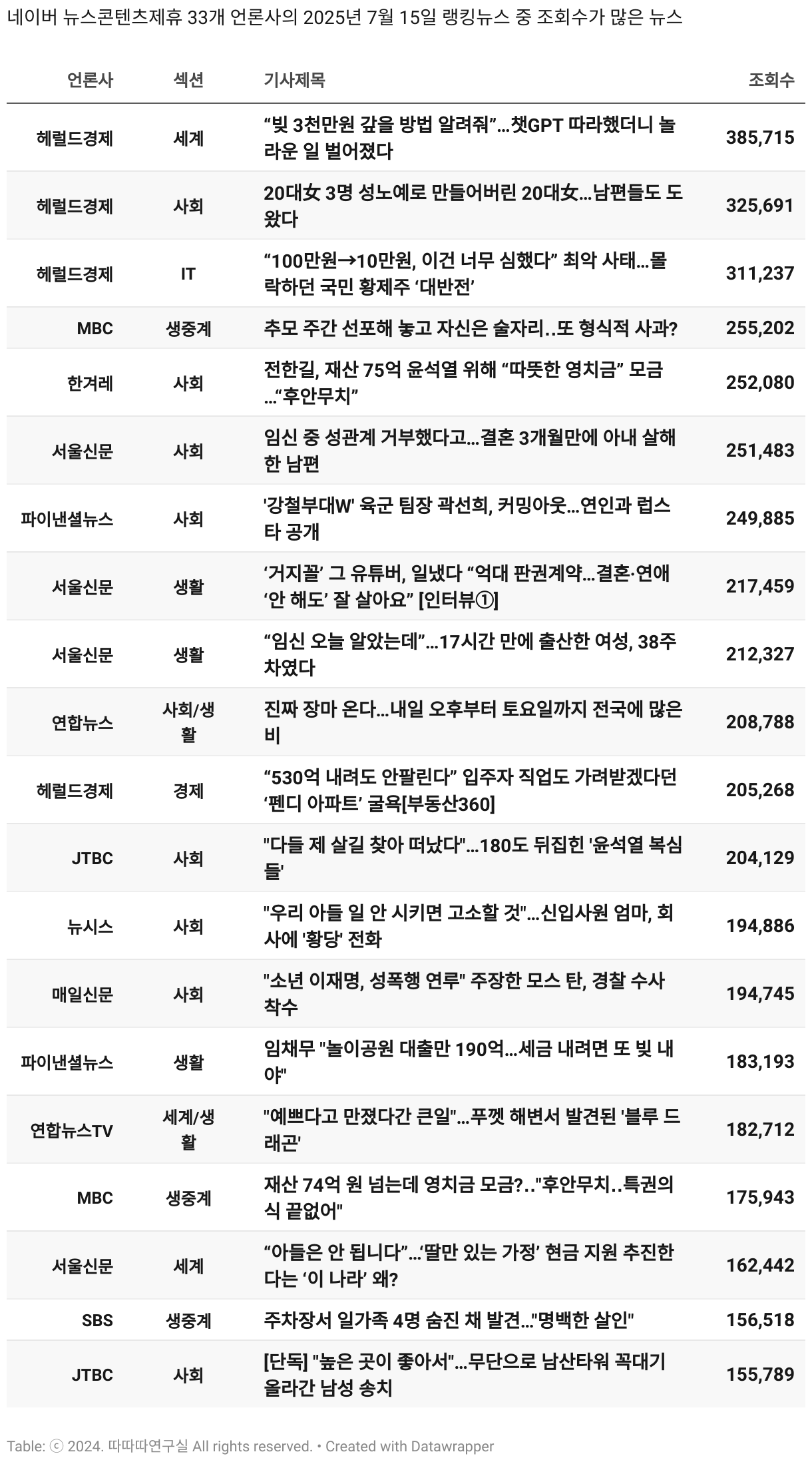 보도 시간대 기준 가장 흥한 기사 3건이 표시됩니다.