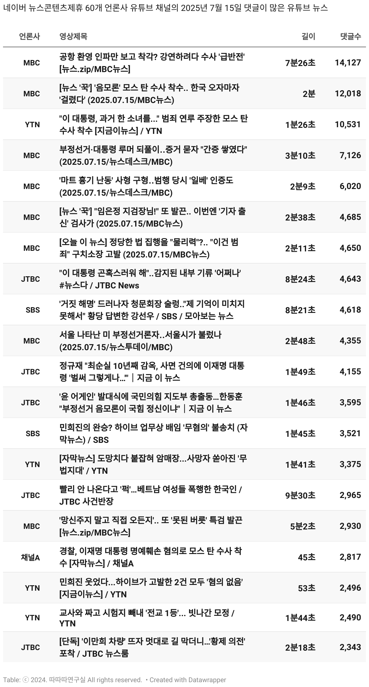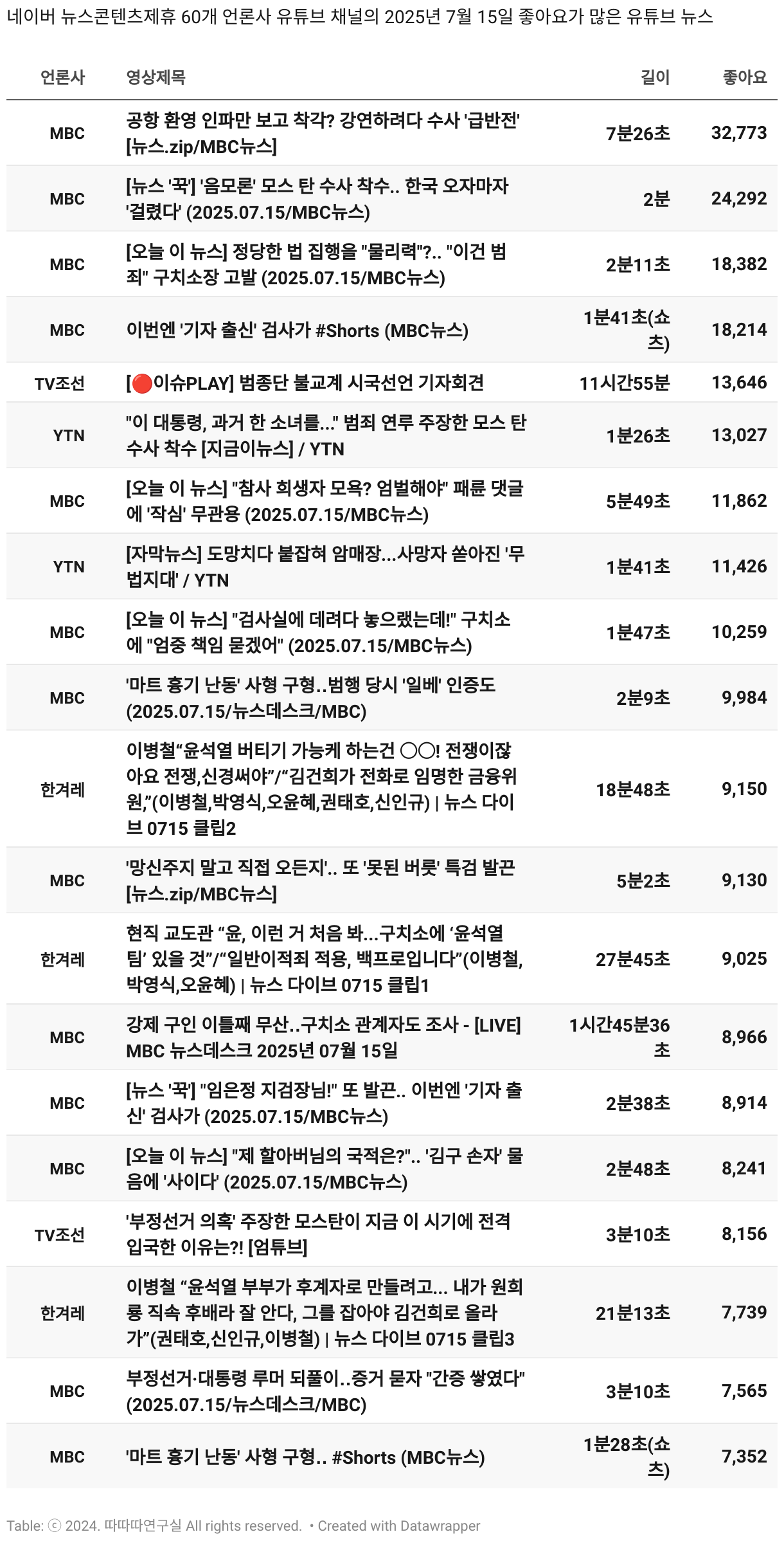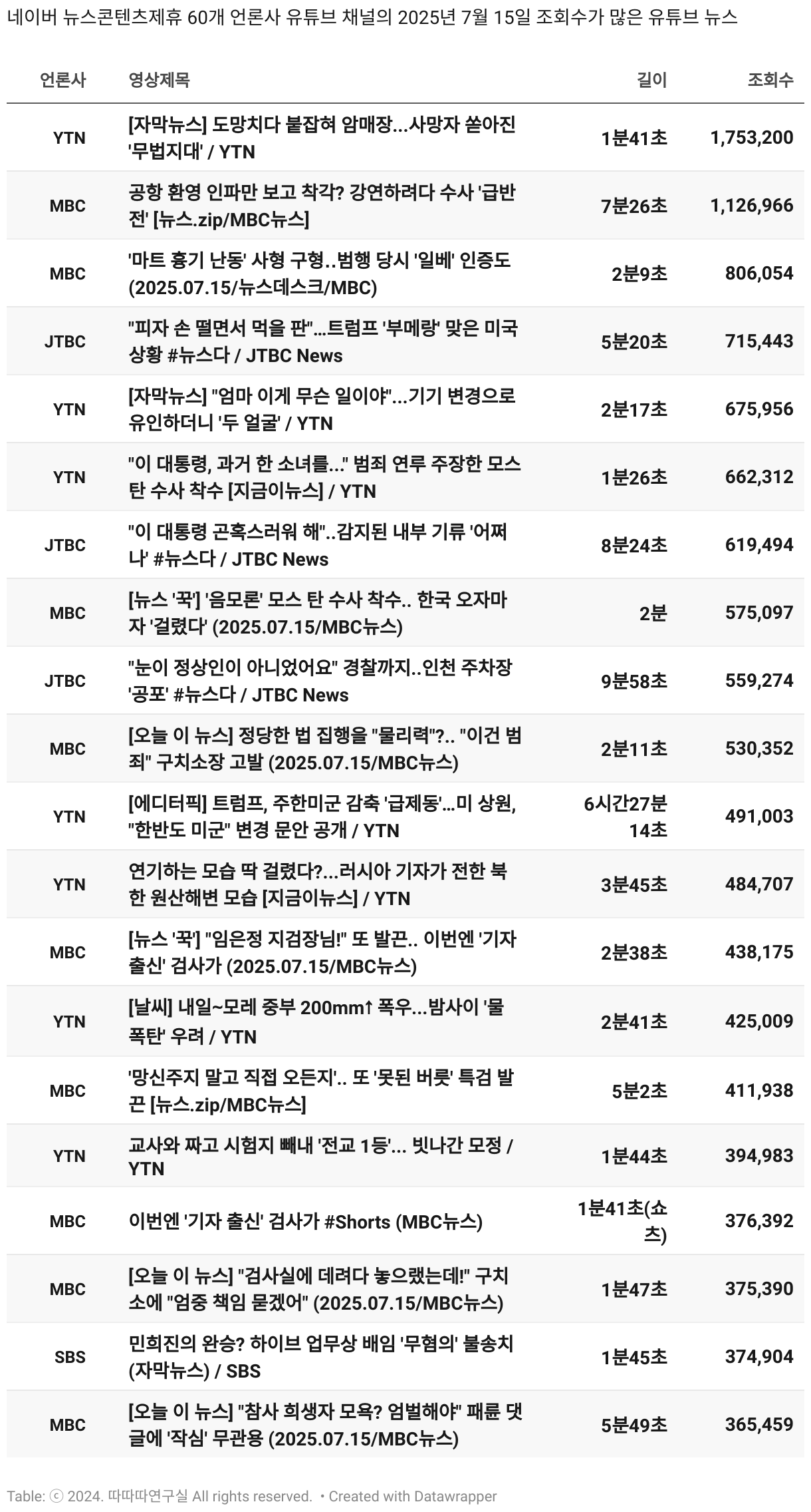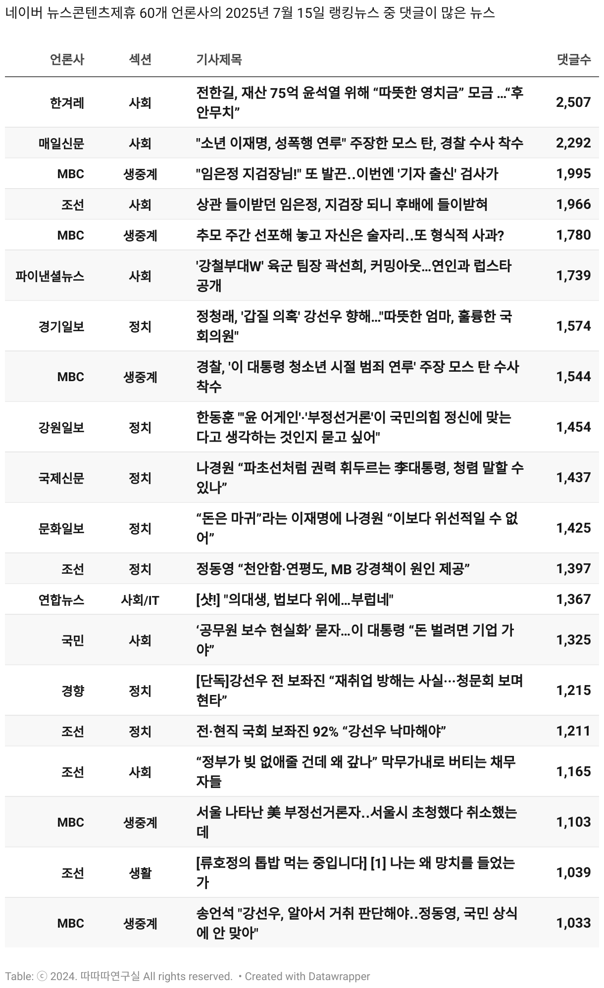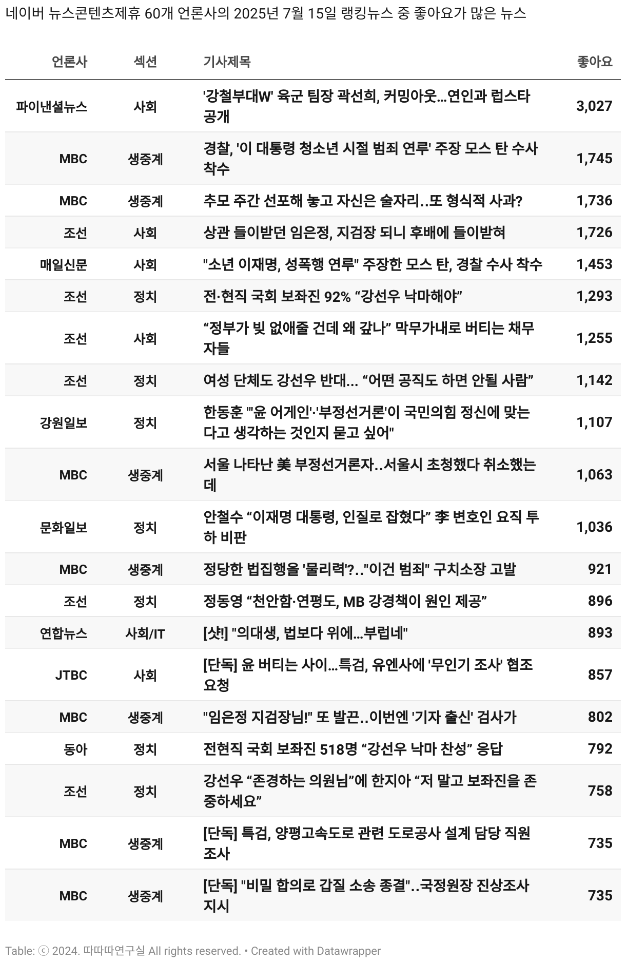 *데이터 수집 기간 : 2024년 6월 10일 *데이터 수집 대상 : 네이버 뉴스콘텐츠제휴 60개 언론사. 종합일간지 10개(경향신문, 국민일보, 동아일보, 문화일보, 서울신문, 세계일보, 조선일보, 중앙일보, 한겨레신문, 한국일보), 방송/통신사 14개(뉴스1, 뉴시스, 연합뉴스, 연합뉴스TV, 채널A, 한국경제TV, JTBC, KBS, MBC, MBN, SBS, SBS BIZ, TV조선, YTN), 경제지 11개(매일경제, 머니투데이, 비즈워치, 서울경제, 아시아경제, 이데일리, 조선비즈, 조세일보, 파이낸셜뉴스, 한국경제(유튜브제외), 헤럴드경제) 인터넷 8개(노컷뉴스, 더팩트, 데일리안, 머니S, 미디어오늘, 아이뉴스24, 오마이뉴스, 프레시안), IT 5개(디지털데일리,디지털타임스, 블로터, 전자신문, 지디넷코리아), 지역 12개(강원도민일보, 강원일보, 경기일보, 국제신문, 대구MBC, 대전일보, 매일신문, 부산일보, 전주MBC, CJB청주방송, JIBS, kbc광주방송)
