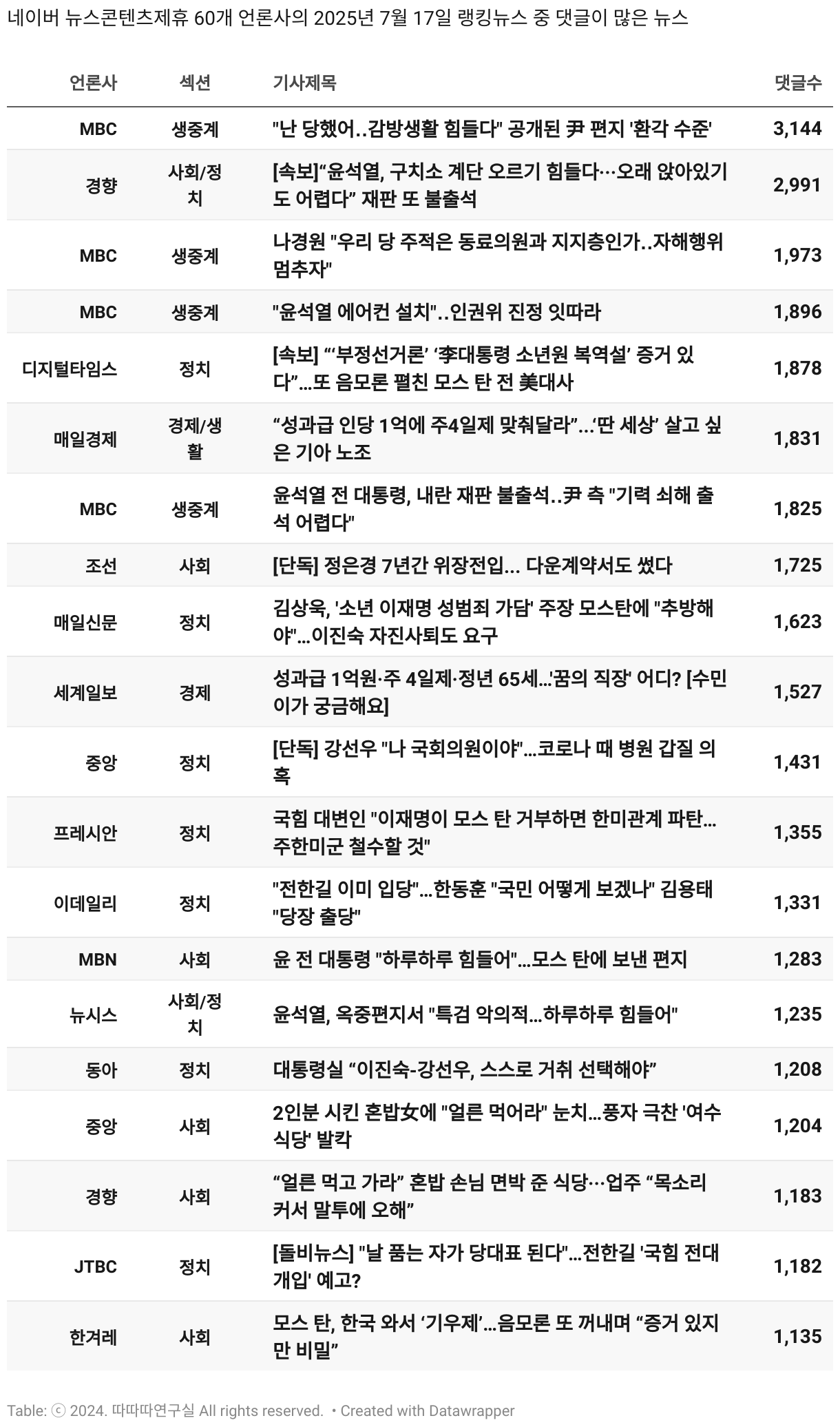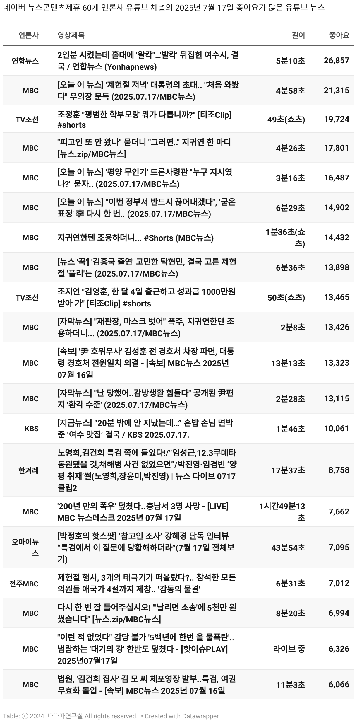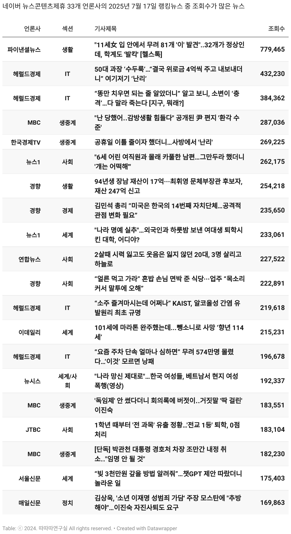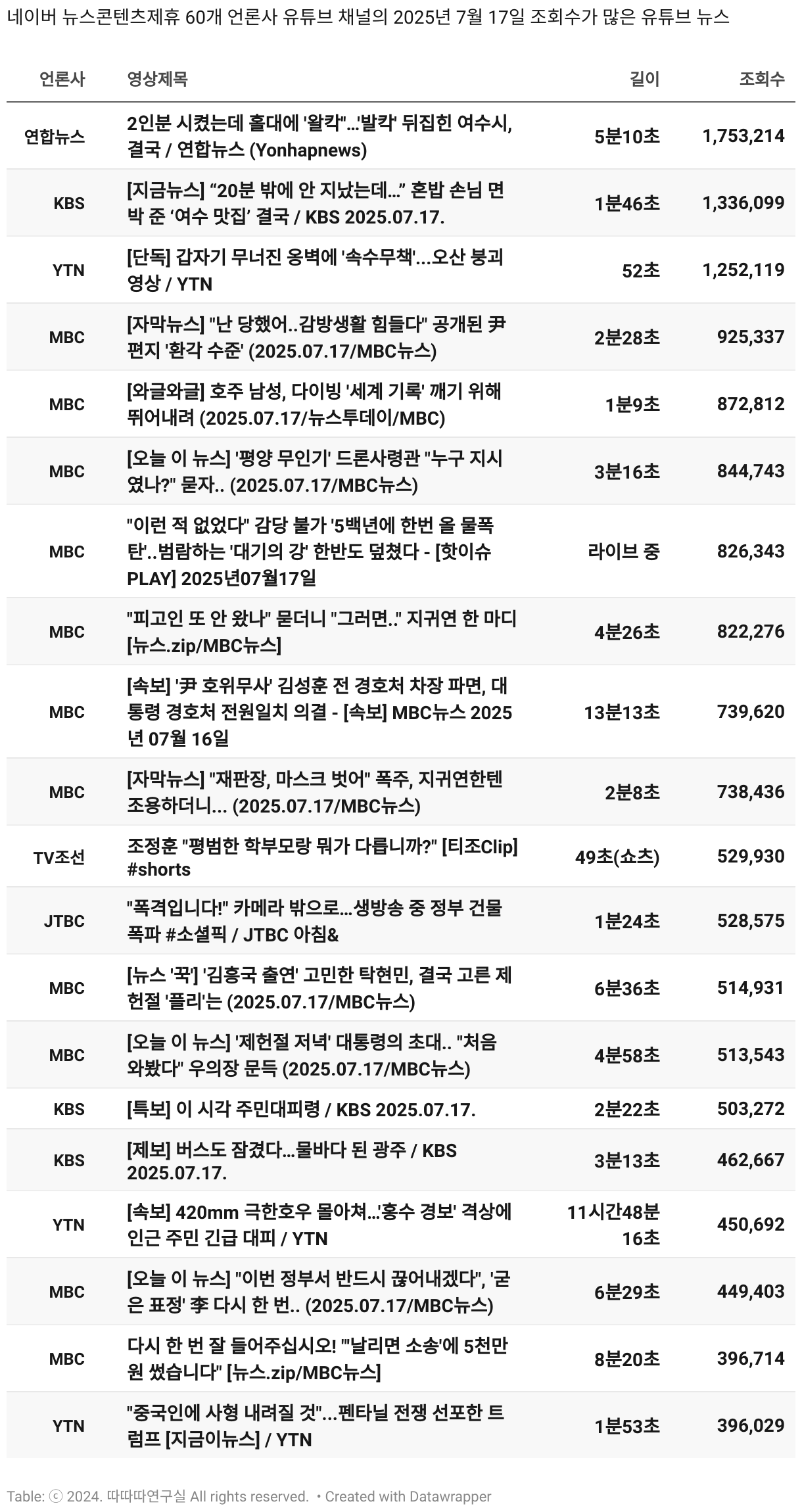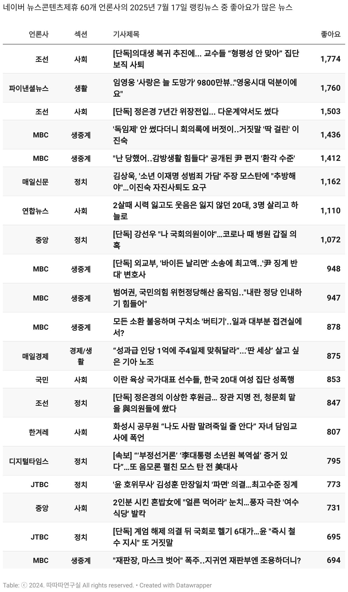 *데이터 수집 기간 : 2024년 6월 10일 *데이터 수집 대상 : 네이버 뉴스콘텐츠제휴 60개 언론사. 종합일간지 10개(경향신문, 국민일보, 동아일보, 문화일보, 서울신문, 세계일보, 조선일보, 중앙일보, 한겨레신문, 한국일보), 방송/통신사 14개(뉴스1, 뉴시스, 연합뉴스, 연합뉴스TV, 채널A, 한국경제TV, JTBC, KBS, MBC, MBN, SBS, SBS BIZ, TV조선, YTN), 경제지 11개(매일경제, 머니투데이, 비즈워치, 서울경제, 아시아경제, 이데일리, 조선비즈, 조세일보, 파이낸셜뉴스, 한국경제(유튜브제외), 헤럴드경제) 인터넷 8개(노컷뉴스, 더팩트, 데일리안, 머니S, 미디어오늘, 아이뉴스24, 오마이뉴스, 프레시안), IT 5개(디지털데일리,디지털타임스, 블로터, 전자신문, 지디넷코리아), 지역 12개(강원도민일보, 강원일보, 경기일보, 국제신문, 대구MBC, 대전일보, 매일신문, 부산일보, 전주MBC, CJB청주방송, JIBS, kbc광주방송)