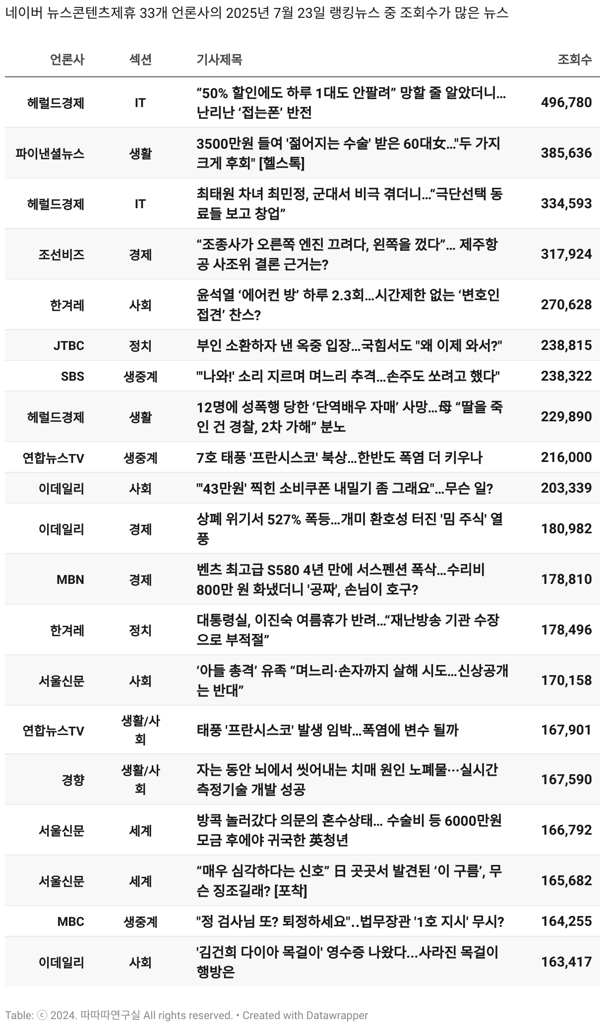 보도 시간대 기준 가장 흥한 기사 3건이 표시됩니다.