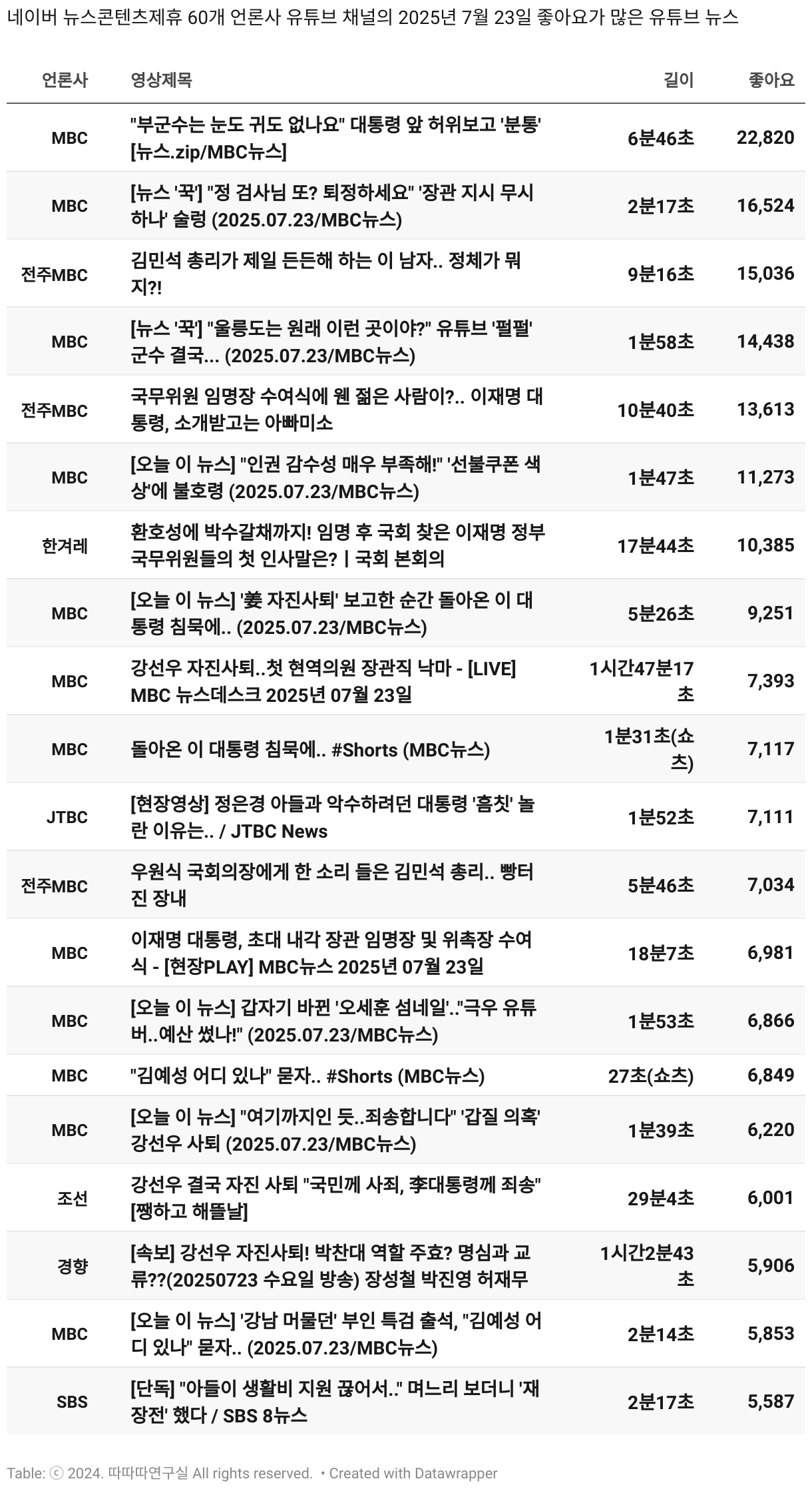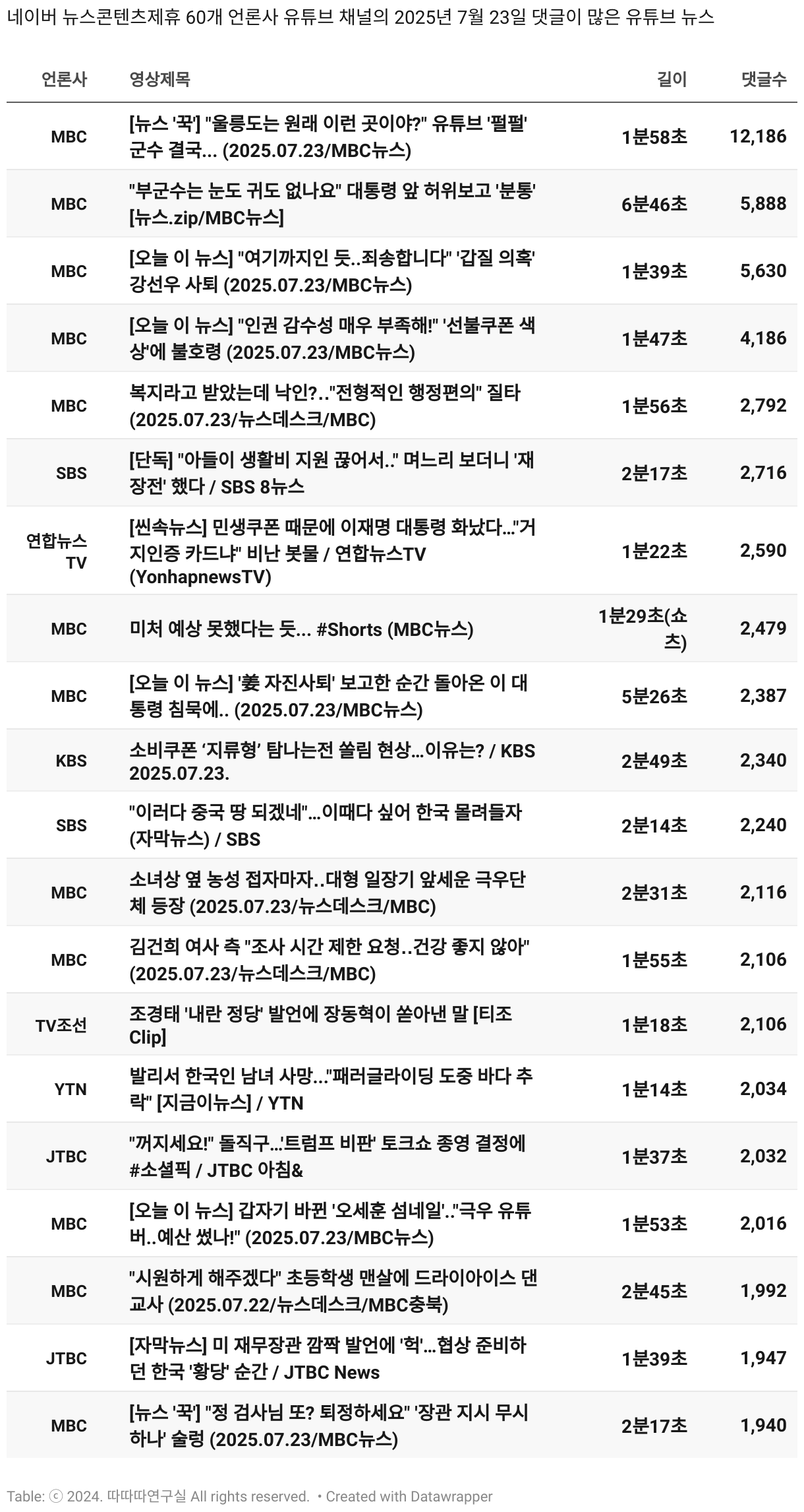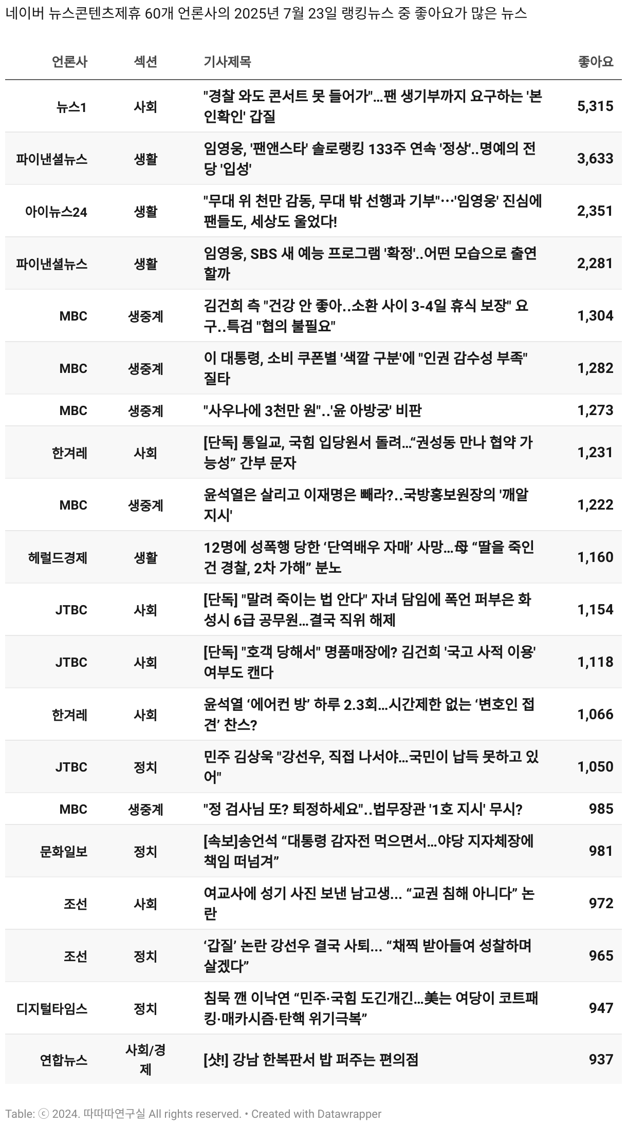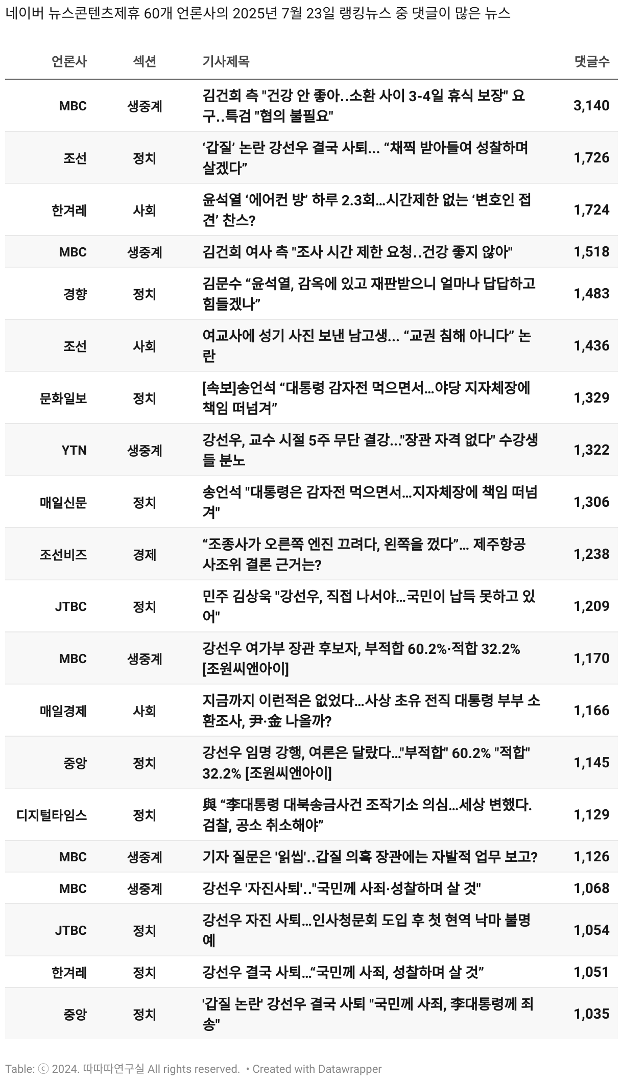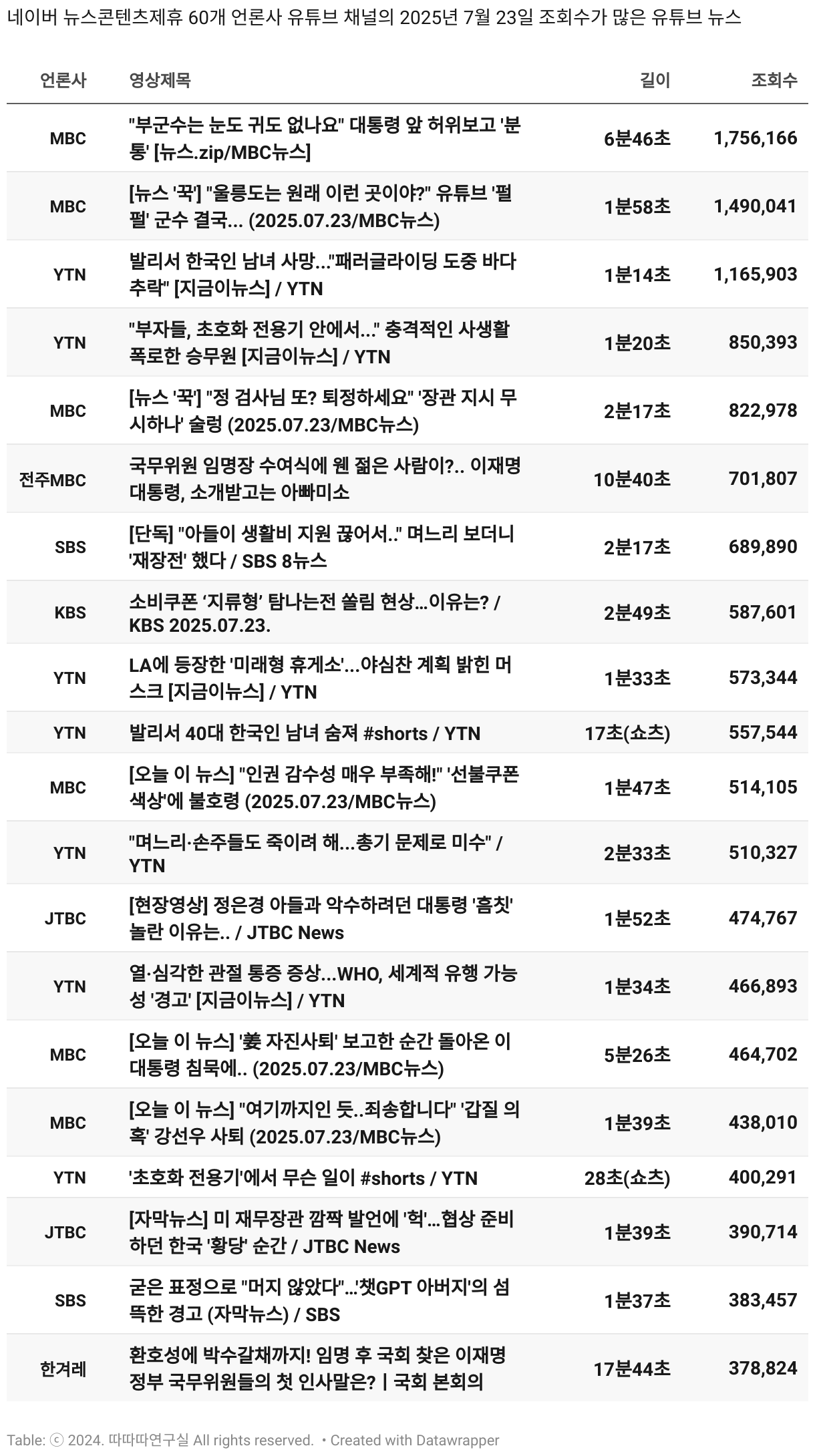 *데이터 수집 기간 : 2024년 6월 10일 *데이터 수집 대상 : 네이버 뉴스콘텐츠제휴 60개 언론사. 종합일간지 10개(경향신문, 국민일보, 동아일보, 문화일보, 서울신문, 세계일보, 조선일보, 중앙일보, 한겨레신문, 한국일보), 방송/통신사 14개(뉴스1, 뉴시스, 연합뉴스, 연합뉴스TV, 채널A, 한국경제TV, JTBC, KBS, MBC, MBN, SBS, SBS BIZ, TV조선, YTN), 경제지 11개(매일경제, 머니투데이, 비즈워치, 서울경제, 아시아경제, 이데일리, 조선비즈, 조세일보, 파이낸셜뉴스, 한국경제(유튜브제외), 헤럴드경제) 인터넷 8개(노컷뉴스, 더팩트, 데일리안, 머니S, 미디어오늘, 아이뉴스24, 오마이뉴스, 프레시안), IT 5개(디지털데일리,디지털타임스, 블로터, 전자신문, 지디넷코리아), 지역 12개(강원도민일보, 강원일보, 경기일보, 국제신문, 대구MBC, 대전일보, 매일신문, 부산일보, 전주MBC, CJB청주방송, JIBS, kbc광주방송)