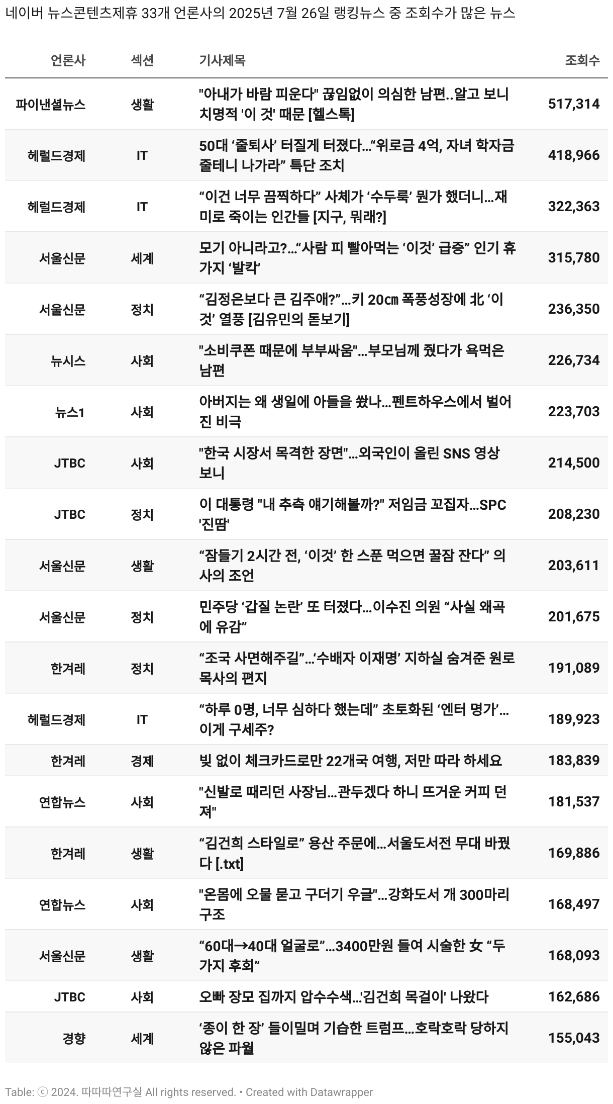 보도 시간대 기준 가장 흥한 기사 3건이 표시됩니다.