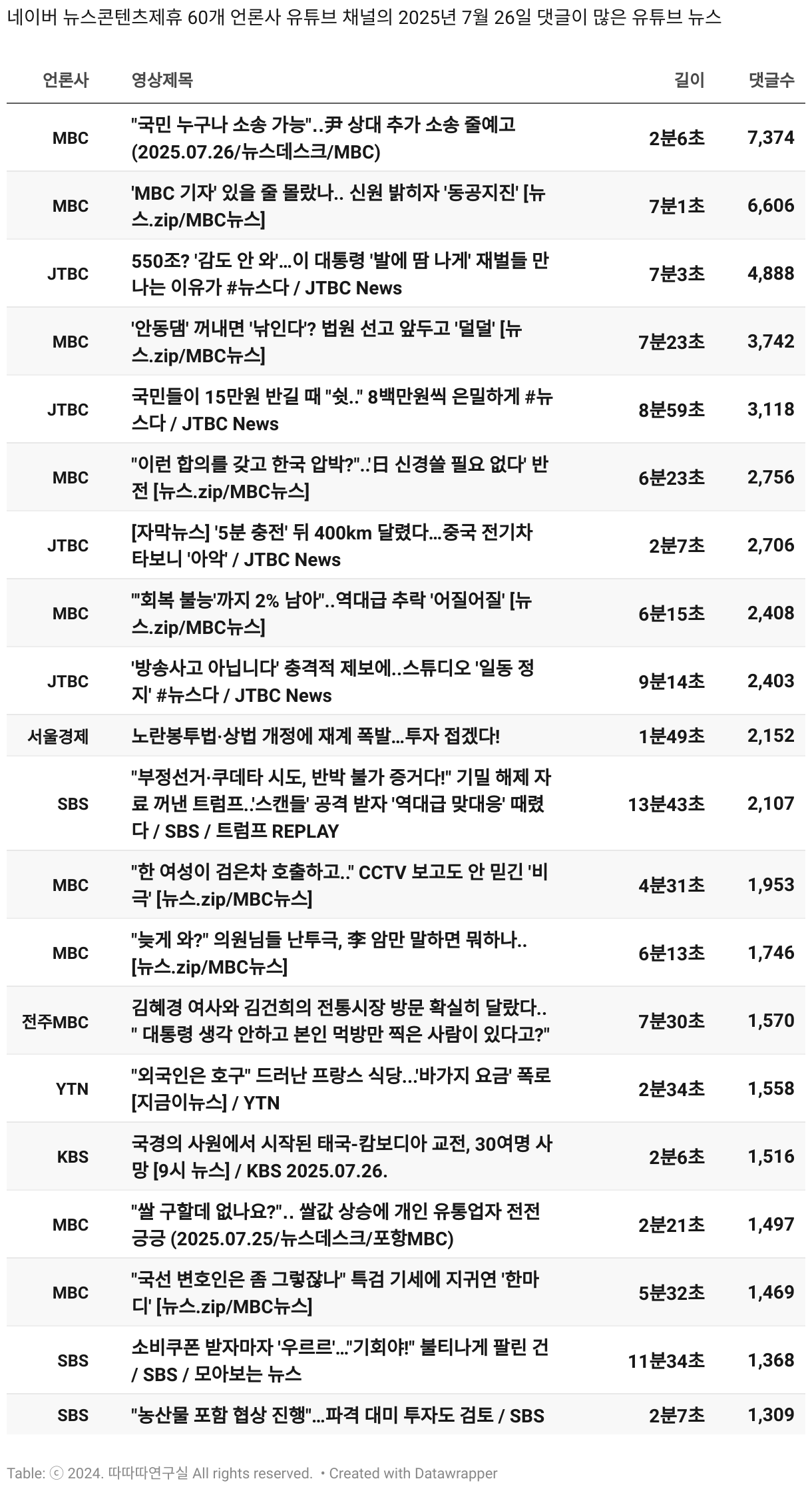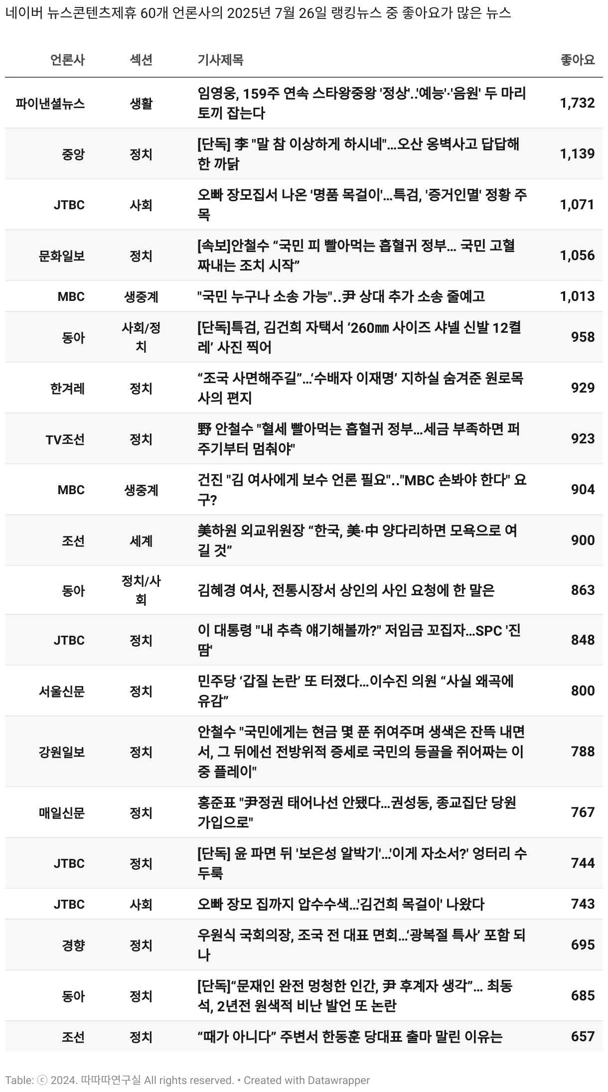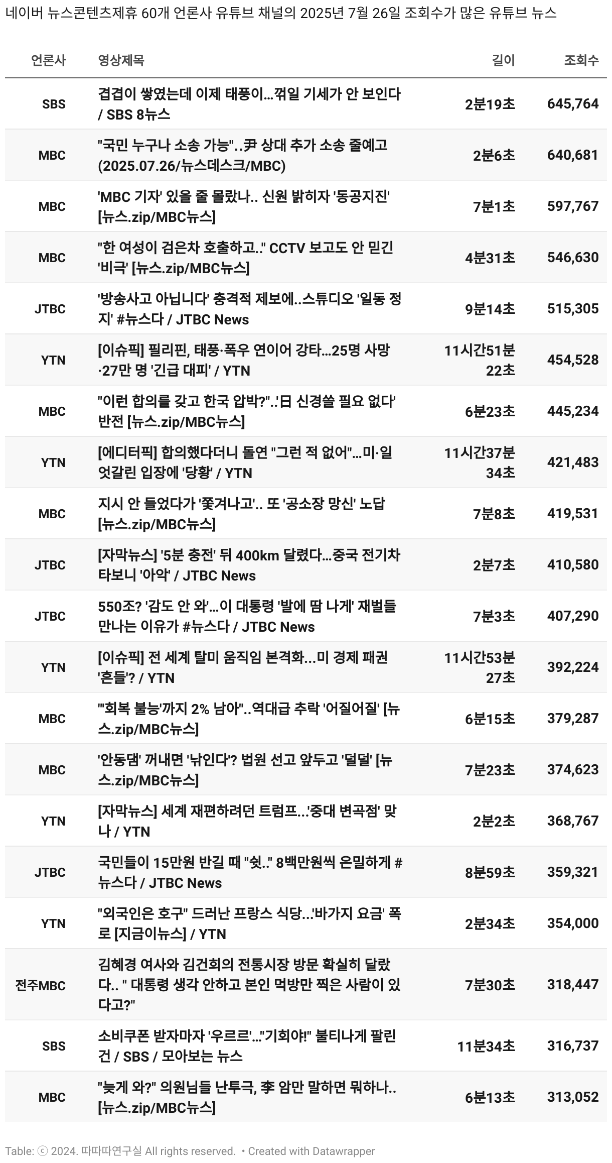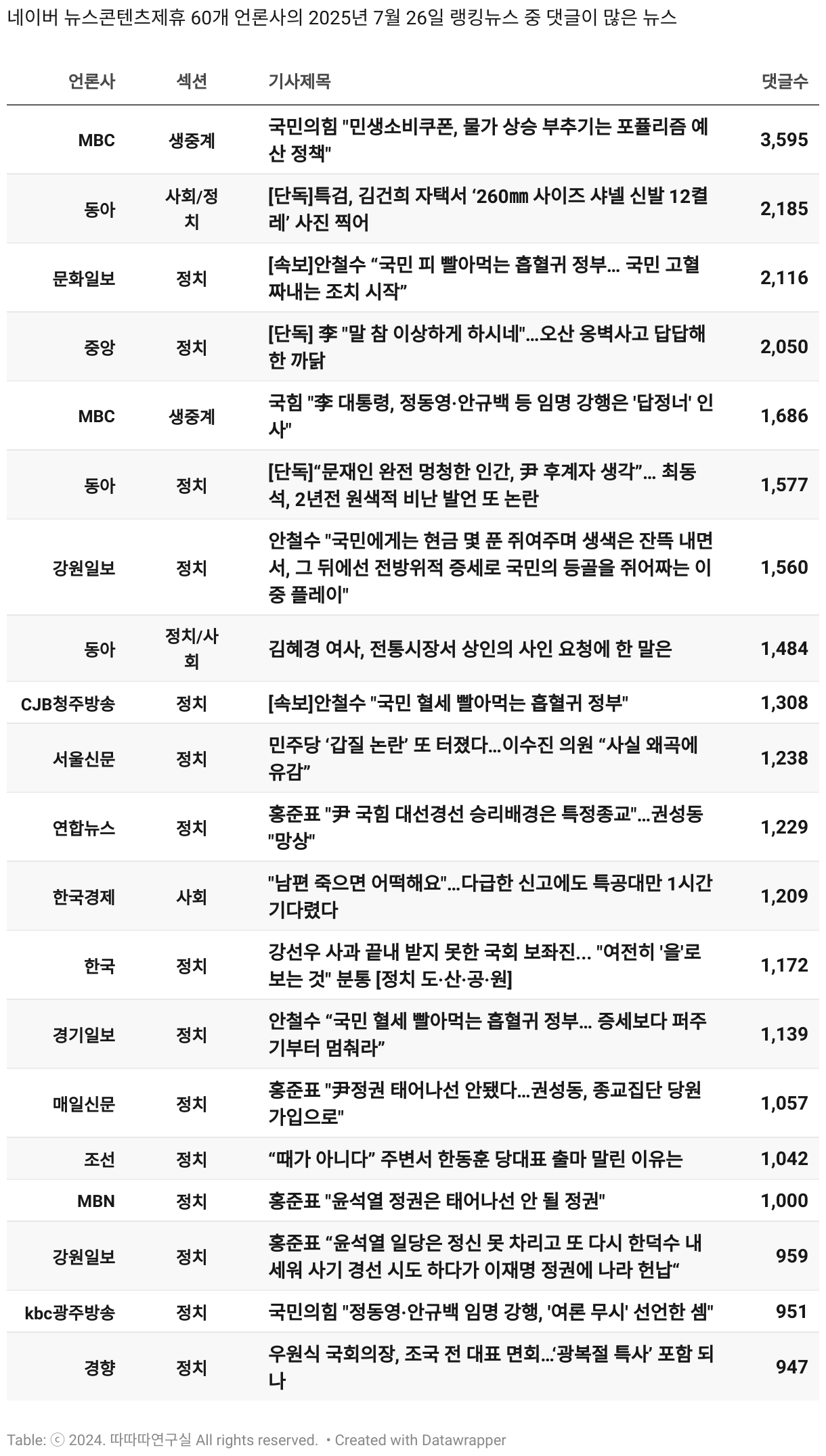 *데이터 수집 기간 : 2024년 6월 10일 *데이터 수집 대상 : 네이버 뉴스콘텐츠제휴 60개 언론사. 종합일간지 10개(경향신문, 국민일보, 동아일보, 문화일보, 서울신문, 세계일보, 조선일보, 중앙일보, 한겨레신문, 한국일보), 방송/통신사 14개(뉴스1, 뉴시스, 연합뉴스, 연합뉴스TV, 채널A, 한국경제TV, JTBC, KBS, MBC, MBN, SBS, SBS BIZ, TV조선, YTN), 경제지 11개(매일경제, 머니투데이, 비즈워치, 서울경제, 아시아경제, 이데일리, 조선비즈, 조세일보, 파이낸셜뉴스, 한국경제(유튜브제외), 헤럴드경제) 인터넷 8개(노컷뉴스, 더팩트, 데일리안, 머니S, 미디어오늘, 아이뉴스24, 오마이뉴스, 프레시안), IT 5개(디지털데일리,디지털타임스, 블로터, 전자신문, 지디넷코리아), 지역 12개(강원도민일보, 강원일보, 경기일보, 국제신문, 대구MBC, 대전일보, 매일신문, 부산일보, 전주MBC, CJB청주방송, JIBS, kbc광주방송)