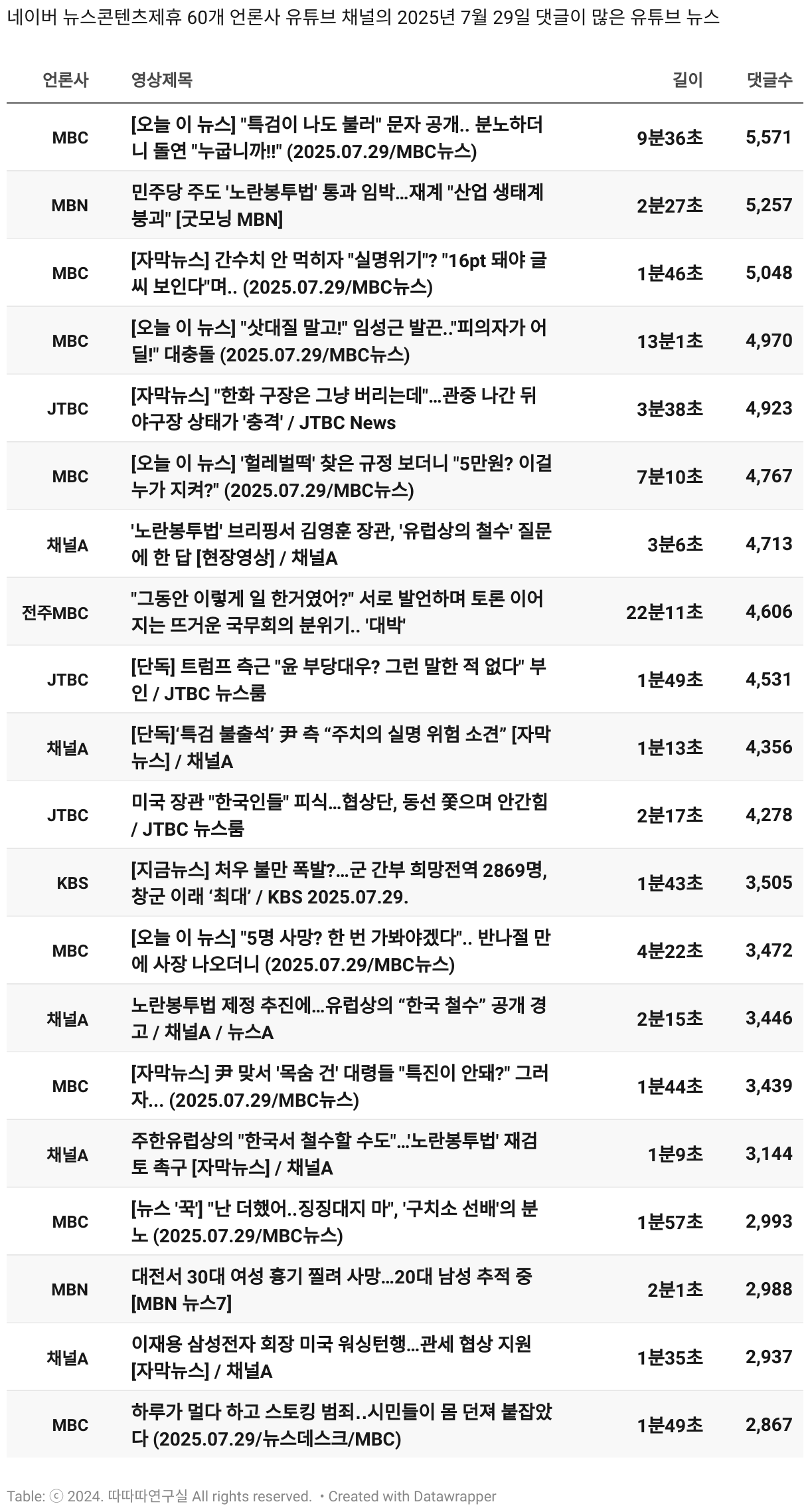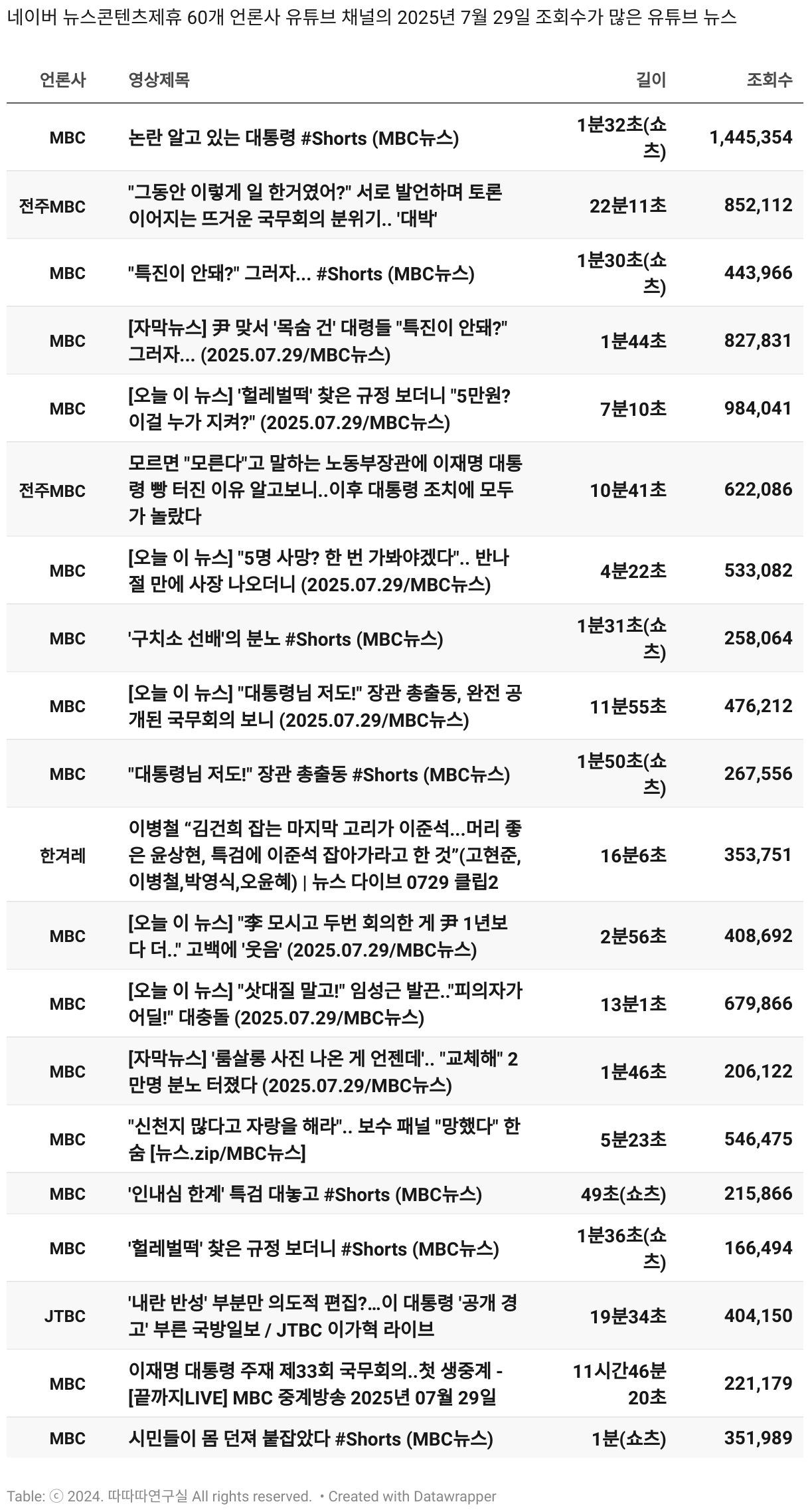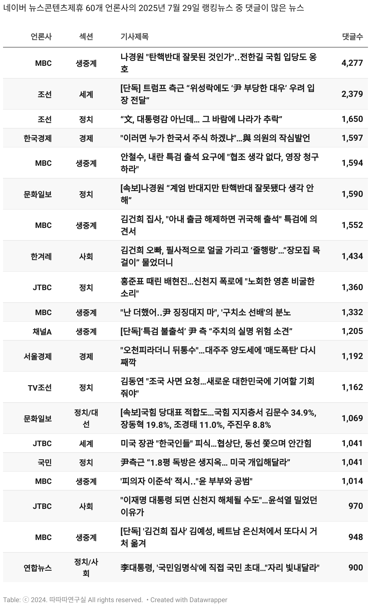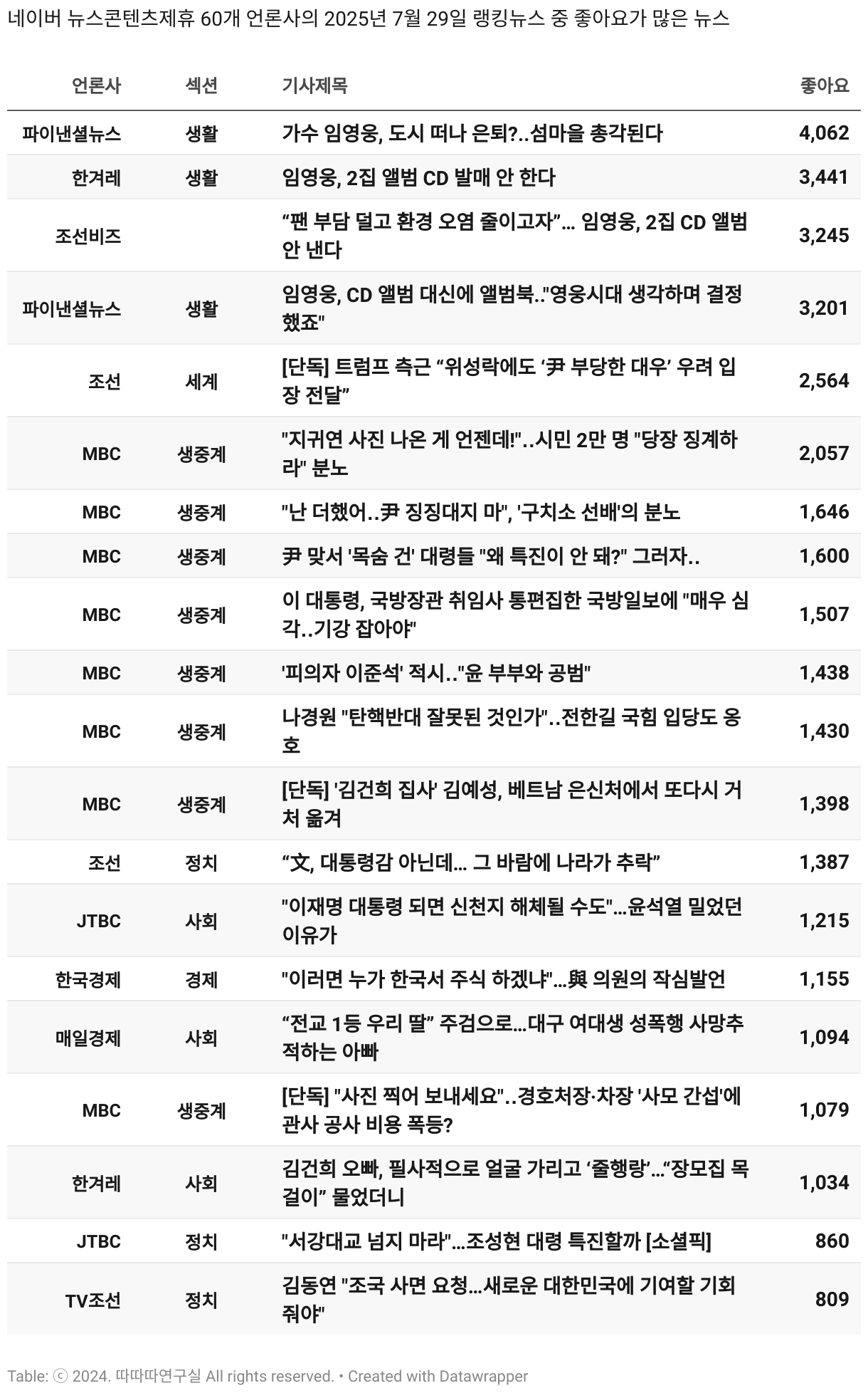 *데이터 수집 기간 : 2024년 6월 10일 *데이터 수집 대상 : 네이버 뉴스콘텐츠제휴 60개 언론사. 종합일간지 10개(경향신문, 국민일보, 동아일보, 문화일보, 서울신문, 세계일보, 조선일보, 중앙일보, 한겨레신문, 한국일보), 방송/통신사 14개(뉴스1, 뉴시스, 연합뉴스, 연합뉴스TV, 채널A, 한국경제TV, JTBC, KBS, MBC, MBN, SBS, SBS BIZ, TV조선, YTN), 경제지 11개(매일경제, 머니투데이, 비즈워치, 서울경제, 아시아경제, 이데일리, 조선비즈, 조세일보, 파이낸셜뉴스, 한국경제(유튜브제외), 헤럴드경제) 인터넷 8개(노컷뉴스, 더팩트, 데일리안, 머니S, 미디어오늘, 아이뉴스24, 오마이뉴스, 프레시안), IT 5개(디지털데일리,디지털타임스, 블로터, 전자신문, 지디넷코리아), 지역 12개(강원도민일보, 강원일보, 경기일보, 국제신문, 대구MBC, 대전일보, 매일신문, 부산일보, 전주MBC, CJB청주방송, JIBS, kbc광주방송)