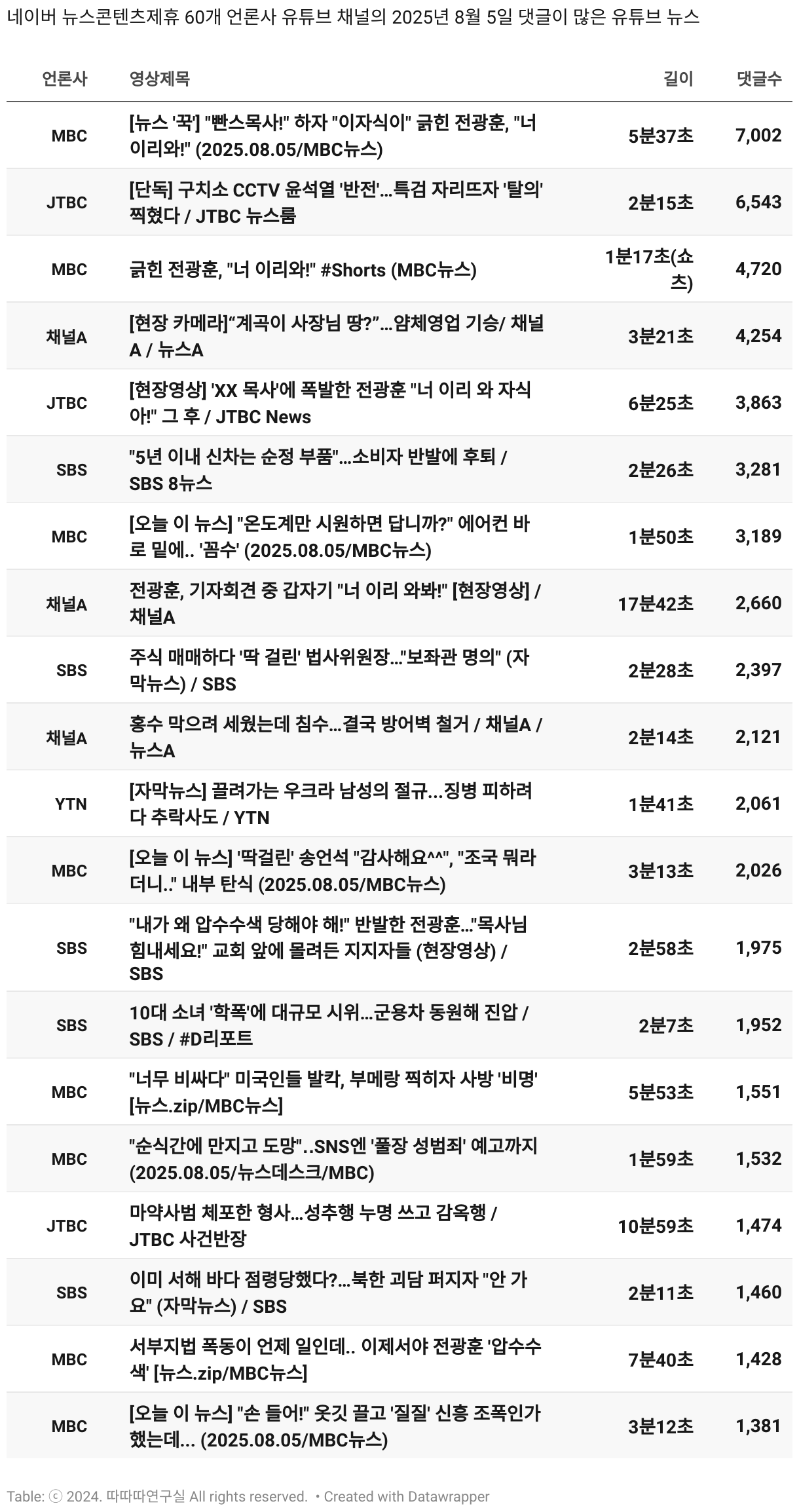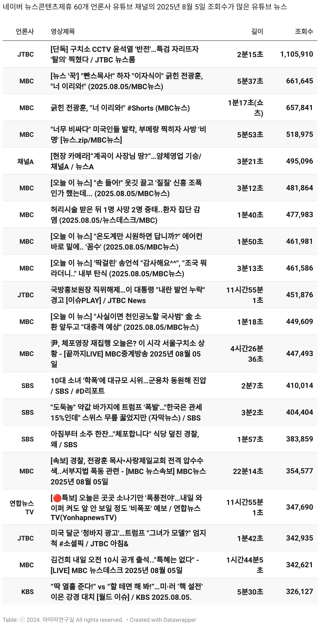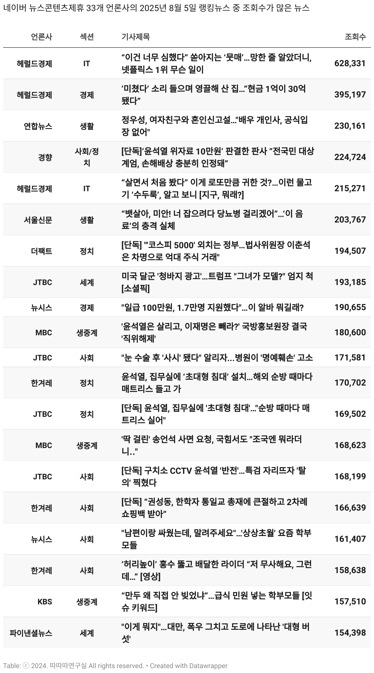 *데이터 수집 기간 : 2024년 6월 10일 *데이터 수집 대상 : 네이버 뉴스콘텐츠제휴 60개 언론사. 종합일간지 10개(경향신문, 국민일보, 동아일보, 문화일보, 서울신문, 세계일보, 조선일보, 중앙일보, 한겨레신문, 한국일보), 방송/통신사 14개(뉴스1, 뉴시스, 연합뉴스, 연합뉴스TV, 채널A, 한국경제TV, JTBC, KBS, MBC, MBN, SBS, SBS BIZ, TV조선, YTN), 경제지 11개(매일경제, 머니투데이, 비즈워치, 서울경제, 아시아경제, 이데일리, 조선비즈, 조세일보, 파이낸셜뉴스, 한국경제(유튜브제외), 헤럴드경제) 인터넷 8개(노컷뉴스, 더팩트, 데일리안, 머니S, 미디어오늘, 아이뉴스24, 오마이뉴스, 프레시안), IT 5개(디지털데일리,디지털타임스, 블로터, 전자신문, 지디넷코리아), 지역 12개(강원도민일보, 강원일보, 경기일보, 국제신문, 대구MBC, 대전일보, 매일신문, 부산일보, 전주MBC, CJB청주방송, JIBS, kbc광주방송)