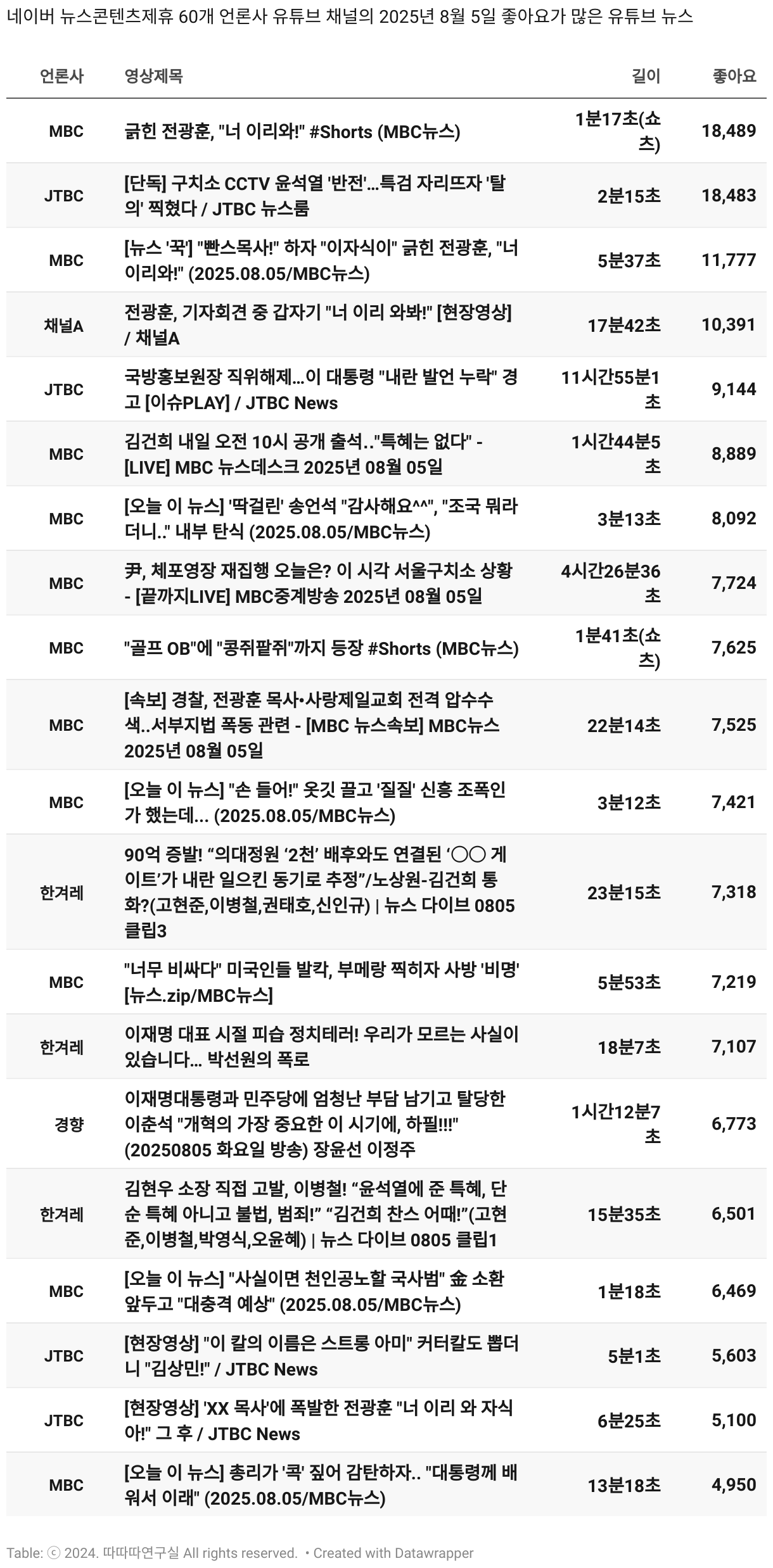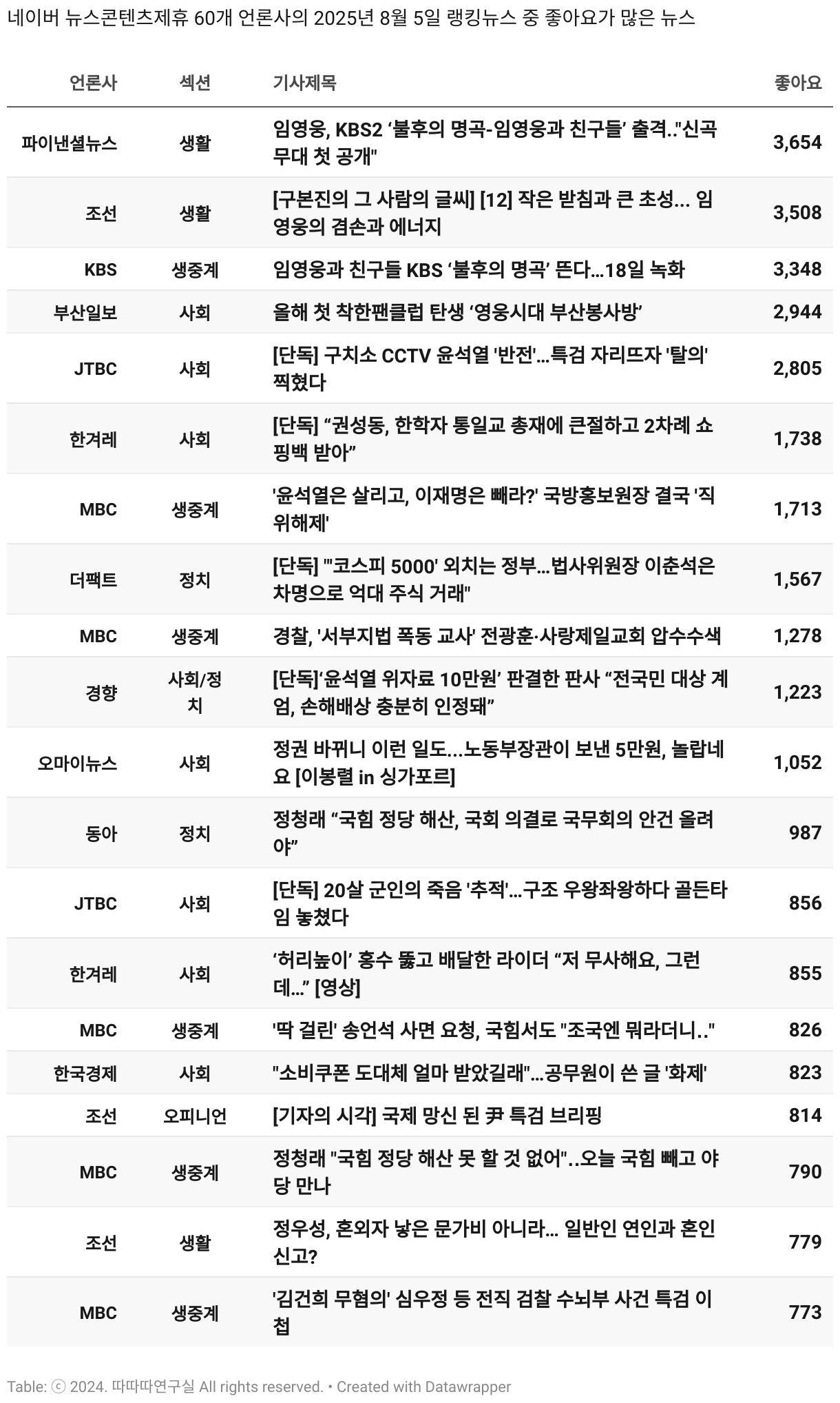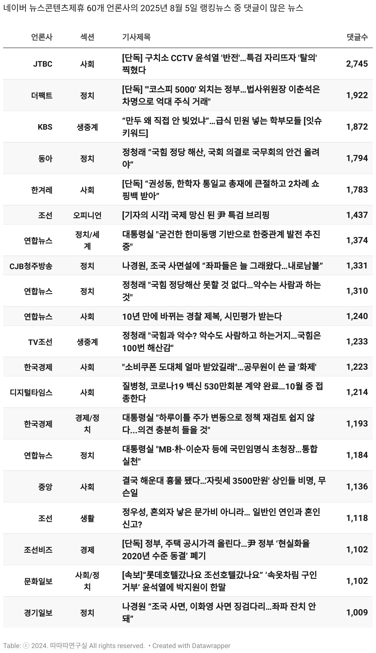 *데이터 수집 기간 : 2024년 6월 10일 *데이터 수집 대상 : 네이버 뉴스콘텐츠제휴 60개 언론사. 종합일간지 10개(경향신문, 국민일보, 동아일보, 문화일보, 서울신문, 세계일보, 조선일보, 중앙일보, 한겨레신문, 한국일보), 방송/통신사 14개(뉴스1, 뉴시스, 연합뉴스, 연합뉴스TV, 채널A, 한국경제TV, JTBC, KBS, MBC, MBN, SBS, SBS BIZ, TV조선, YTN), 경제지 11개(매일경제, 머니투데이, 비즈워치, 서울경제, 아시아경제, 이데일리, 조선비즈, 조세일보, 파이낸셜뉴스, 한국경제(유튜브제외), 헤럴드경제) 인터넷 8개(노컷뉴스, 더팩트, 데일리안, 머니S, 미디어오늘, 아이뉴스24, 오마이뉴스, 프레시안), IT 5개(디지털데일리,디지털타임스, 블로터, 전자신문, 지디넷코리아), 지역 12개(강원도민일보, 강원일보, 경기일보, 국제신문, 대구MBC, 대전일보, 매일신문, 부산일보, 전주MBC, CJB청주방송, JIBS, kbc광주방송)