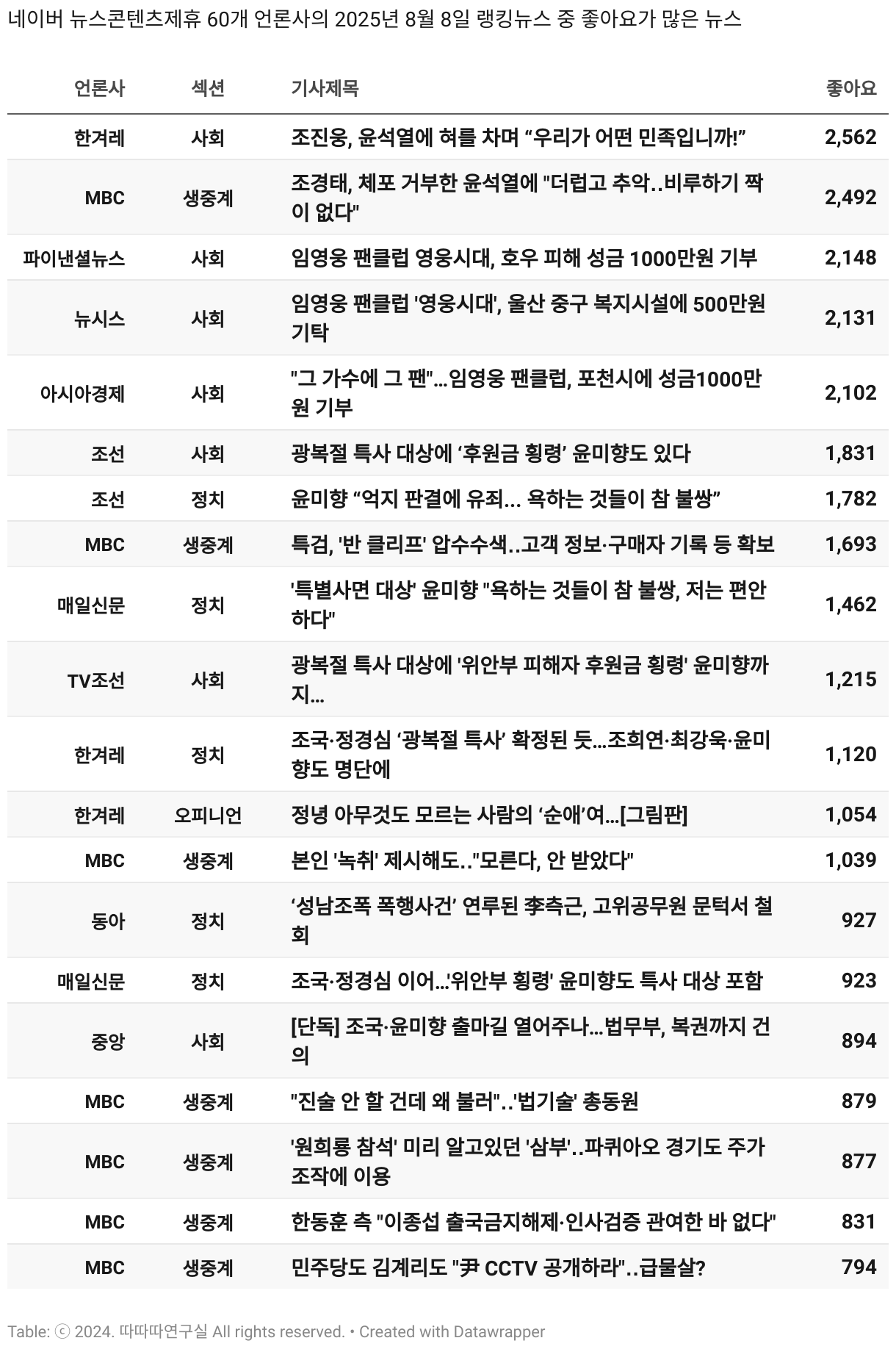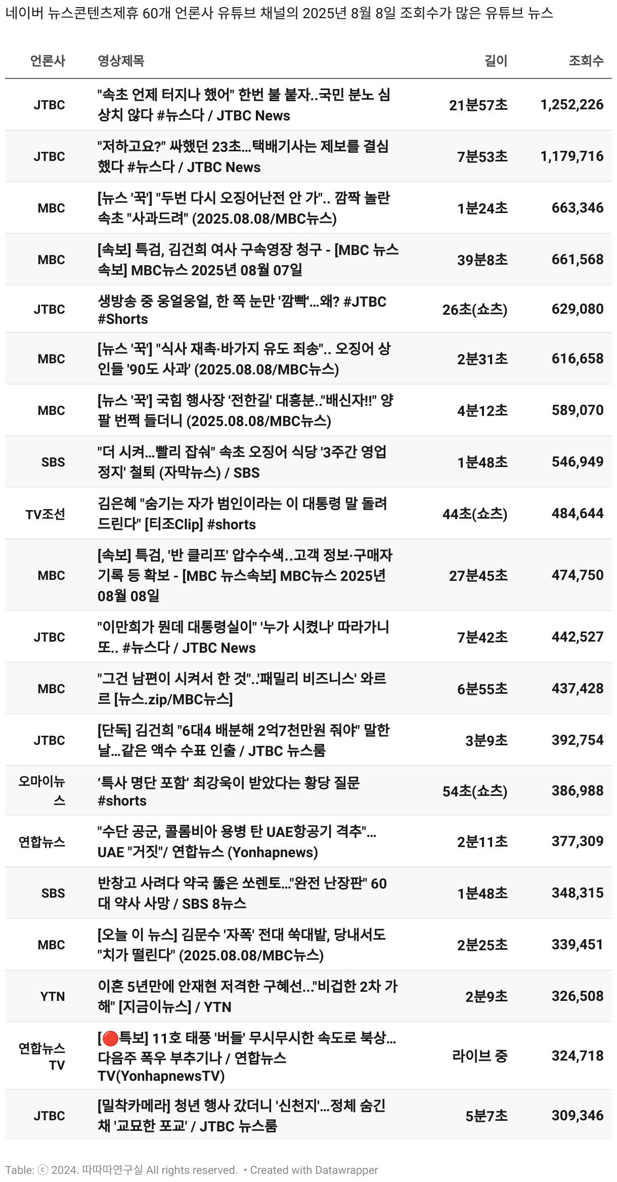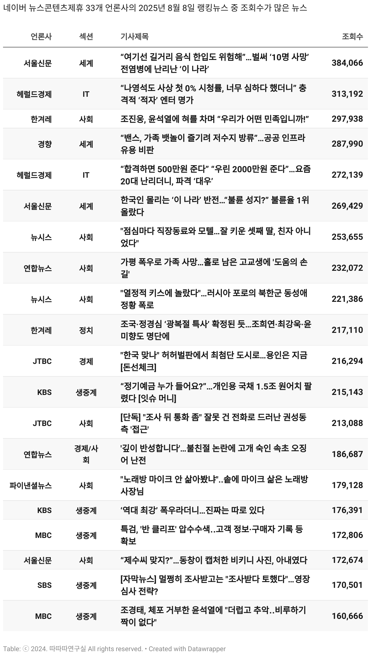 *데이터 수집 기간 : 2024년 6월 10일 *데이터 수집 대상 : 네이버 뉴스콘텐츠제휴 60개 언론사. 종합일간지 10개(경향신문, 국민일보, 동아일보, 문화일보, 서울신문, 세계일보, 조선일보, 중앙일보, 한겨레신문, 한국일보), 방송/통신사 14개(뉴스1, 뉴시스, 연합뉴스, 연합뉴스TV, 채널A, 한국경제TV, JTBC, KBS, MBC, MBN, SBS, SBS BIZ, TV조선, YTN), 경제지 11개(매일경제, 머니투데이, 비즈워치, 서울경제, 아시아경제, 이데일리, 조선비즈, 조세일보, 파이낸셜뉴스, 한국경제(유튜브제외), 헤럴드경제) 인터넷 8개(노컷뉴스, 더팩트, 데일리안, 머니S, 미디어오늘, 아이뉴스24, 오마이뉴스, 프레시안), IT 5개(디지털데일리,디지털타임스, 블로터, 전자신문, 지디넷코리아), 지역 12개(강원도민일보, 강원일보, 경기일보, 국제신문, 대구MBC, 대전일보, 매일신문, 부산일보, 전주MBC, CJB청주방송, JIBS, kbc광주방송)