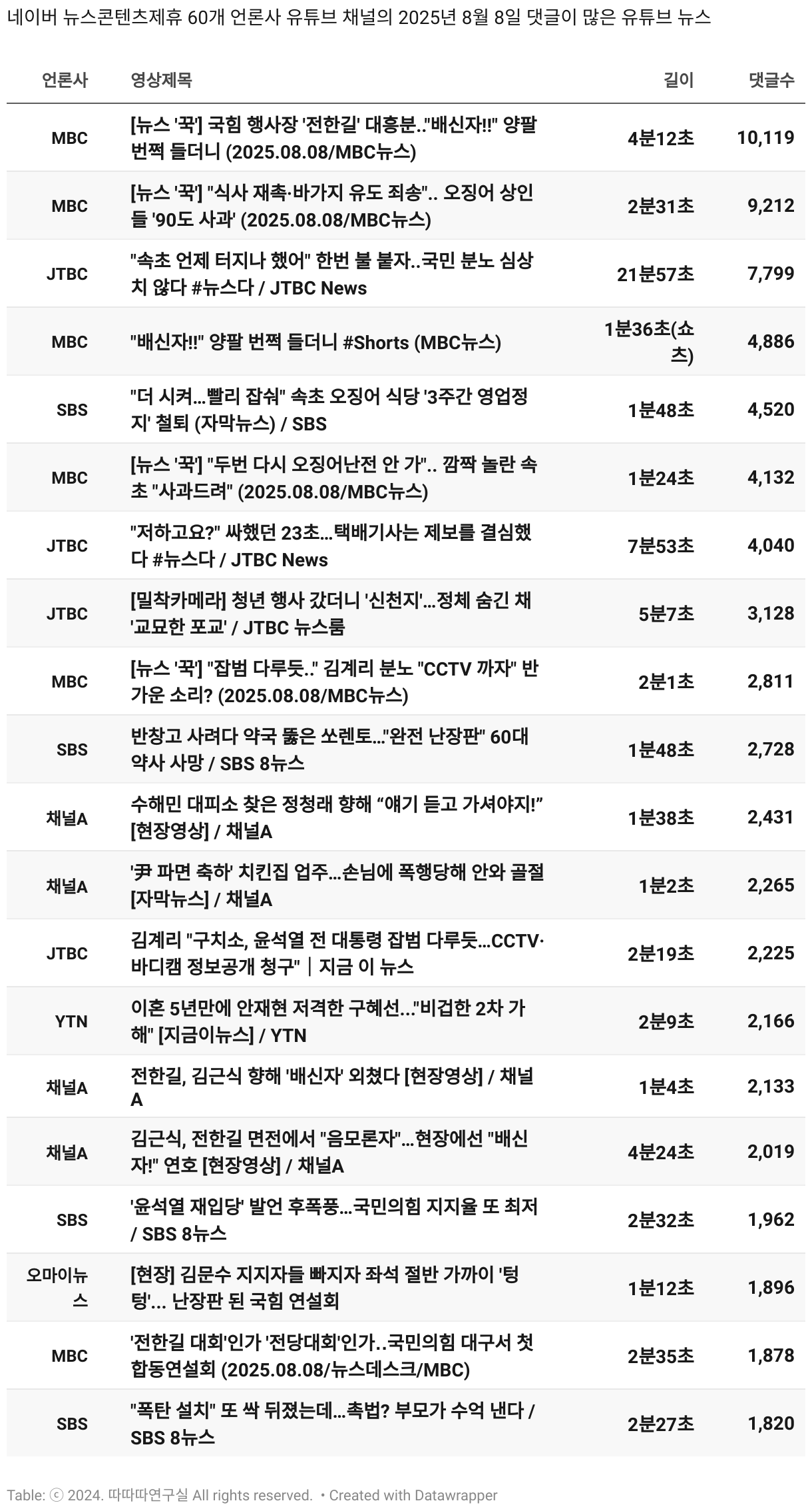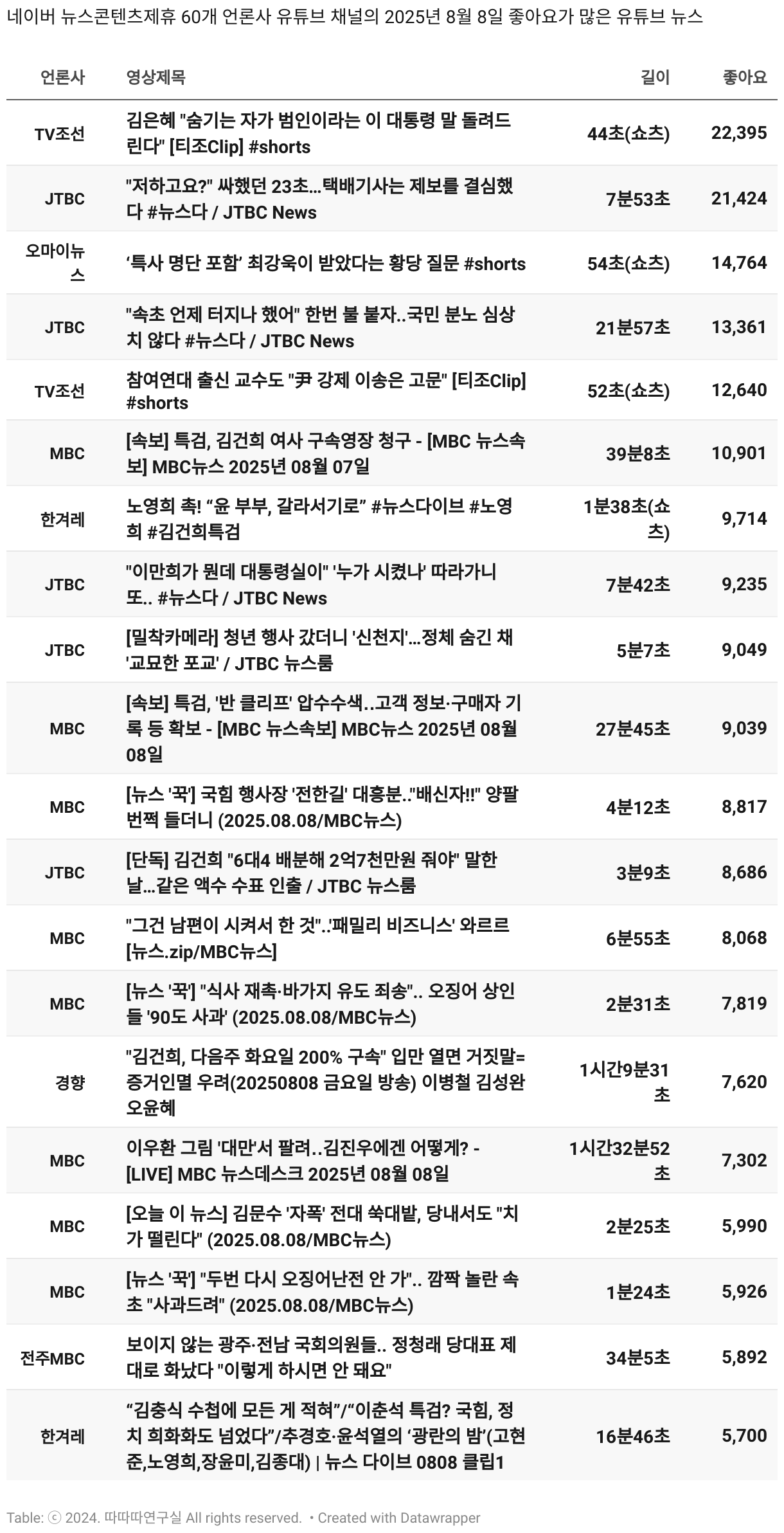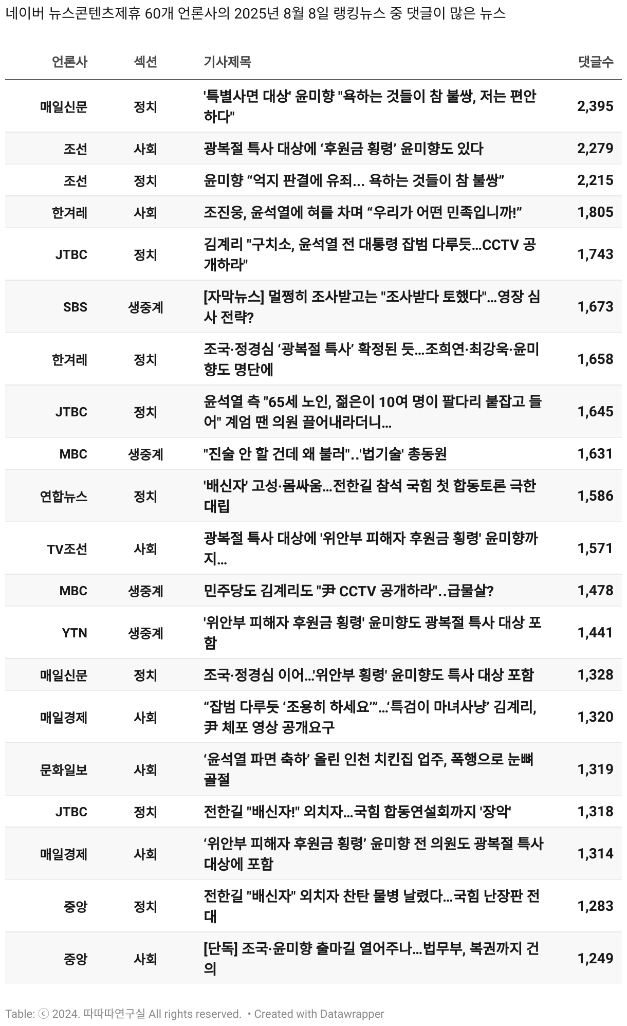 *데이터 수집 기간 : 2024년 6월 10일 *데이터 수집 대상 : 네이버 뉴스콘텐츠제휴 60개 언론사. 종합일간지 10개(경향신문, 국민일보, 동아일보, 문화일보, 서울신문, 세계일보, 조선일보, 중앙일보, 한겨레신문, 한국일보), 방송/통신사 14개(뉴스1, 뉴시스, 연합뉴스, 연합뉴스TV, 채널A, 한국경제TV, JTBC, KBS, MBC, MBN, SBS, SBS BIZ, TV조선, YTN), 경제지 11개(매일경제, 머니투데이, 비즈워치, 서울경제, 아시아경제, 이데일리, 조선비즈, 조세일보, 파이낸셜뉴스, 한국경제(유튜브제외), 헤럴드경제) 인터넷 8개(노컷뉴스, 더팩트, 데일리안, 머니S, 미디어오늘, 아이뉴스24, 오마이뉴스, 프레시안), IT 5개(디지털데일리,디지털타임스, 블로터, 전자신문, 지디넷코리아), 지역 12개(강원도민일보, 강원일보, 경기일보, 국제신문, 대구MBC, 대전일보, 매일신문, 부산일보, 전주MBC, CJB청주방송, JIBS, kbc광주방송)