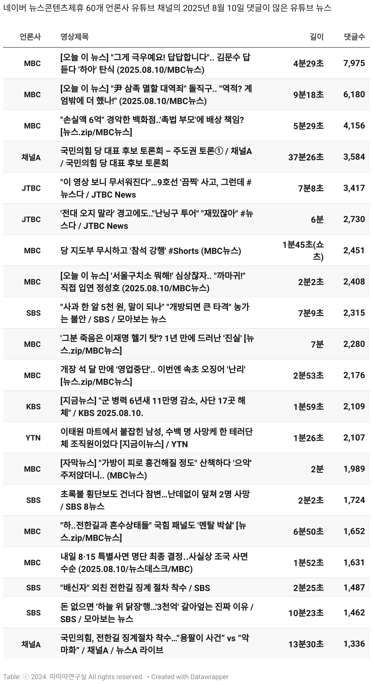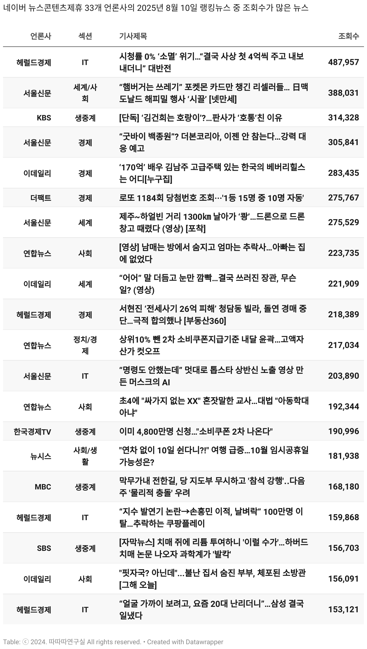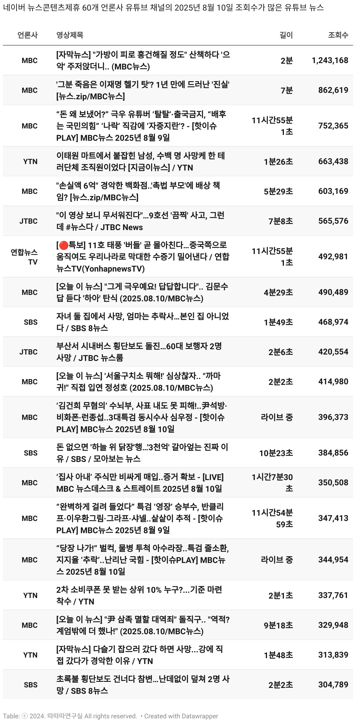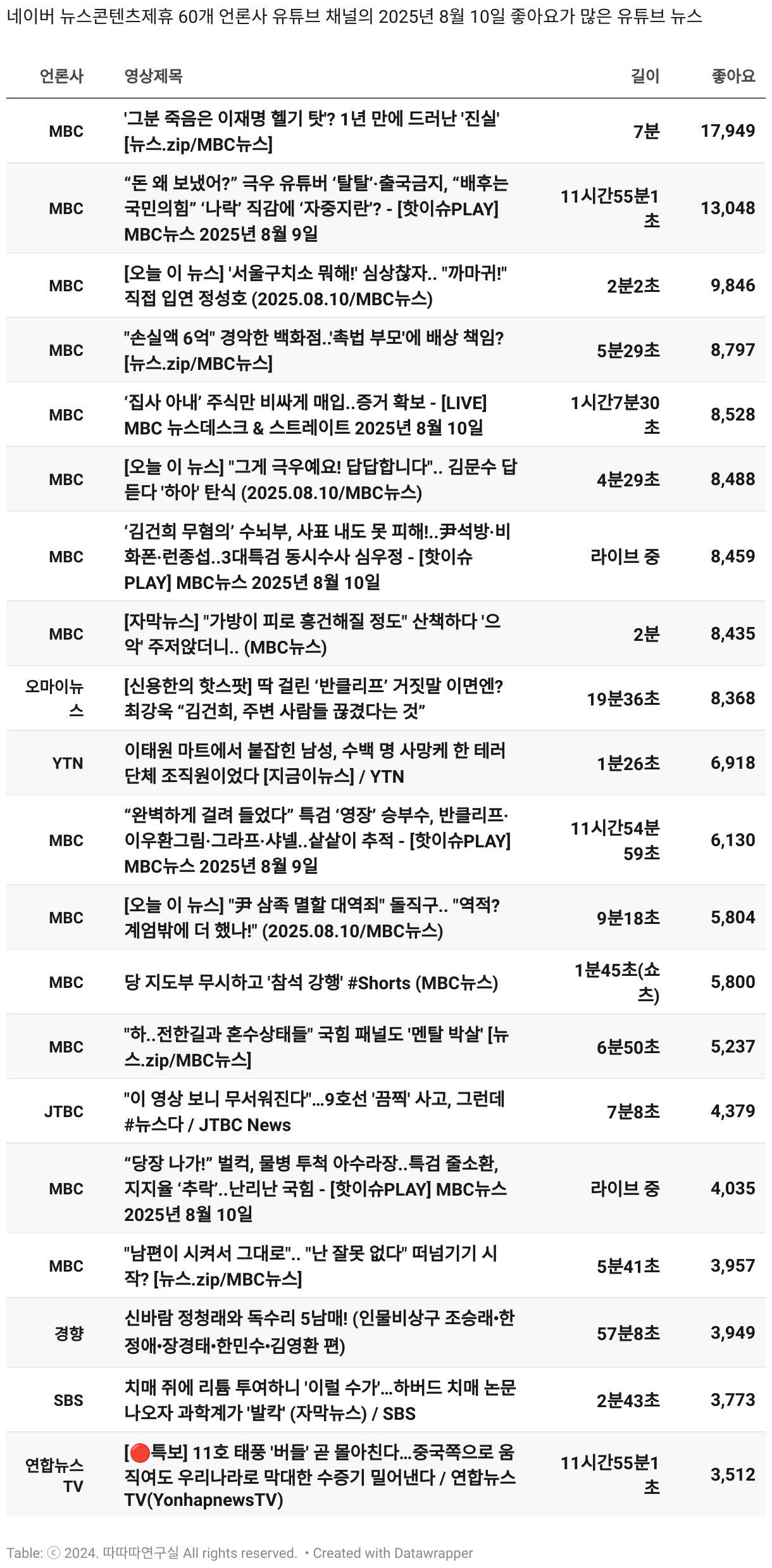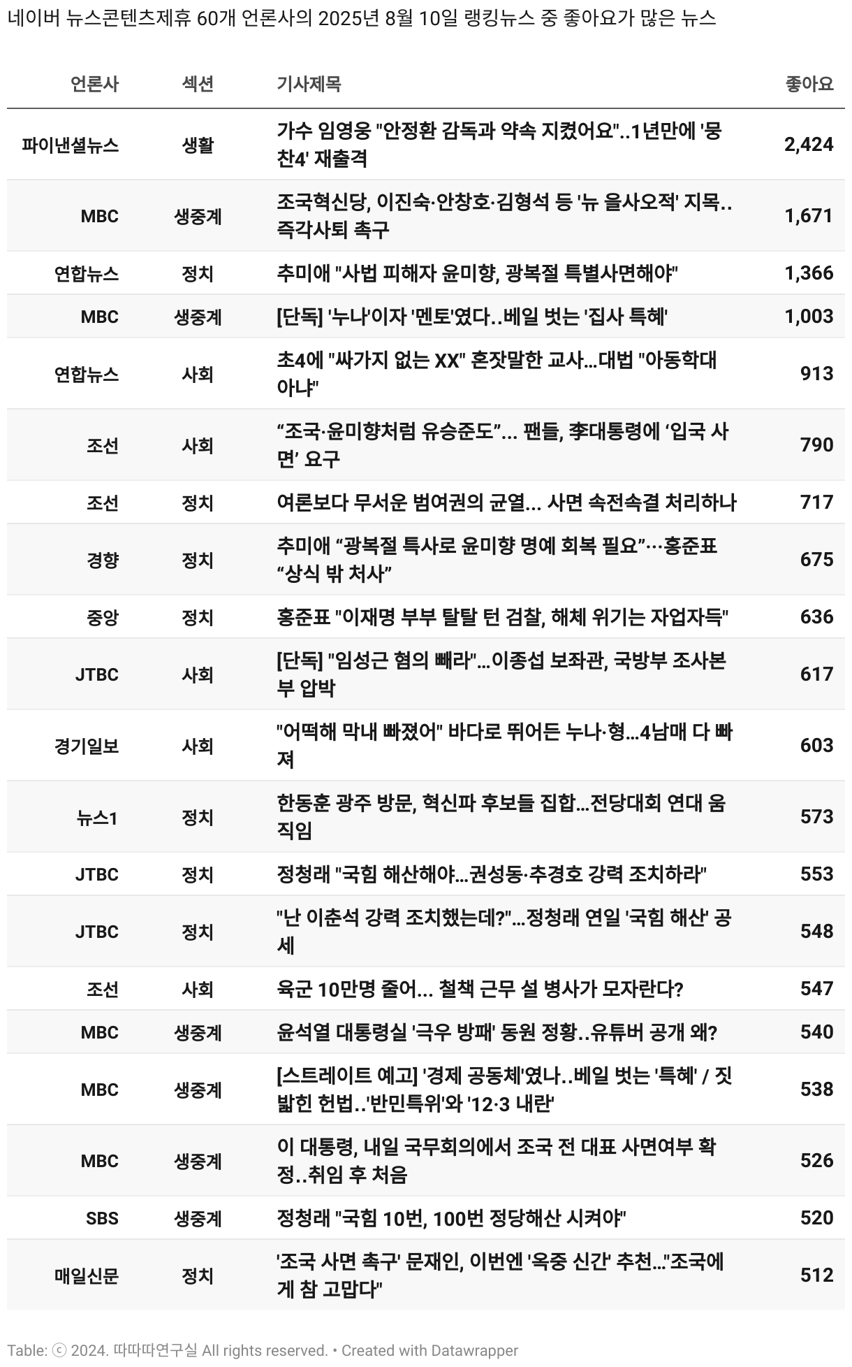 *데이터 수집 기간 : 2024년 6월 10일 *데이터 수집 대상 : 네이버 뉴스콘텐츠제휴 60개 언론사. 종합일간지 10개(경향신문, 국민일보, 동아일보, 문화일보, 서울신문, 세계일보, 조선일보, 중앙일보, 한겨레신문, 한국일보), 방송/통신사 14개(뉴스1, 뉴시스, 연합뉴스, 연합뉴스TV, 채널A, 한국경제TV, JTBC, KBS, MBC, MBN, SBS, SBS BIZ, TV조선, YTN), 경제지 11개(매일경제, 머니투데이, 비즈워치, 서울경제, 아시아경제, 이데일리, 조선비즈, 조세일보, 파이낸셜뉴스, 한국경제(유튜브제외), 헤럴드경제) 인터넷 8개(노컷뉴스, 더팩트, 데일리안, 머니S, 미디어오늘, 아이뉴스24, 오마이뉴스, 프레시안), IT 5개(디지털데일리,디지털타임스, 블로터, 전자신문, 지디넷코리아), 지역 12개(강원도민일보, 강원일보, 경기일보, 국제신문, 대구MBC, 대전일보, 매일신문, 부산일보, 전주MBC, CJB청주방송, JIBS, kbc광주방송)