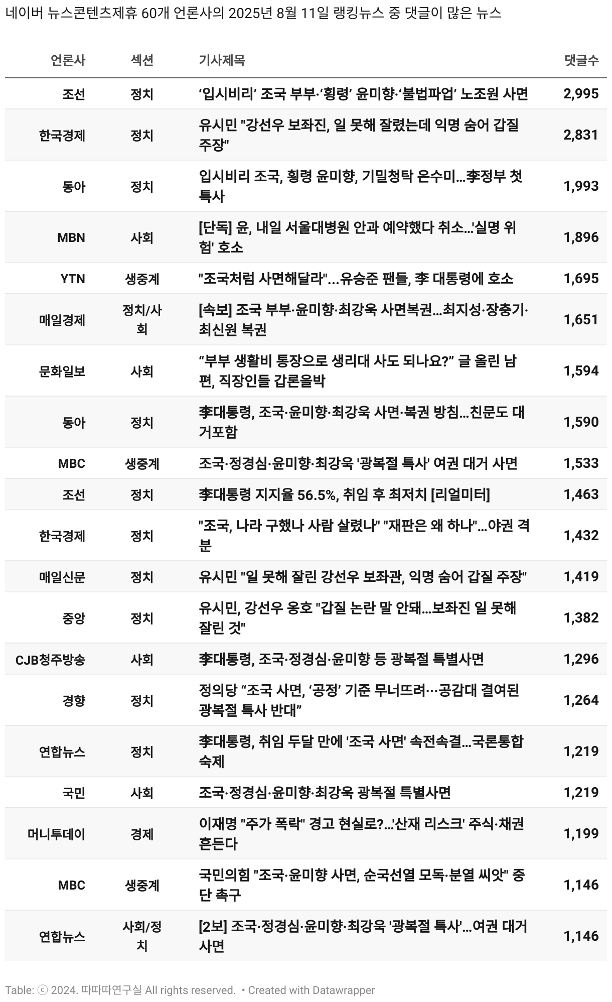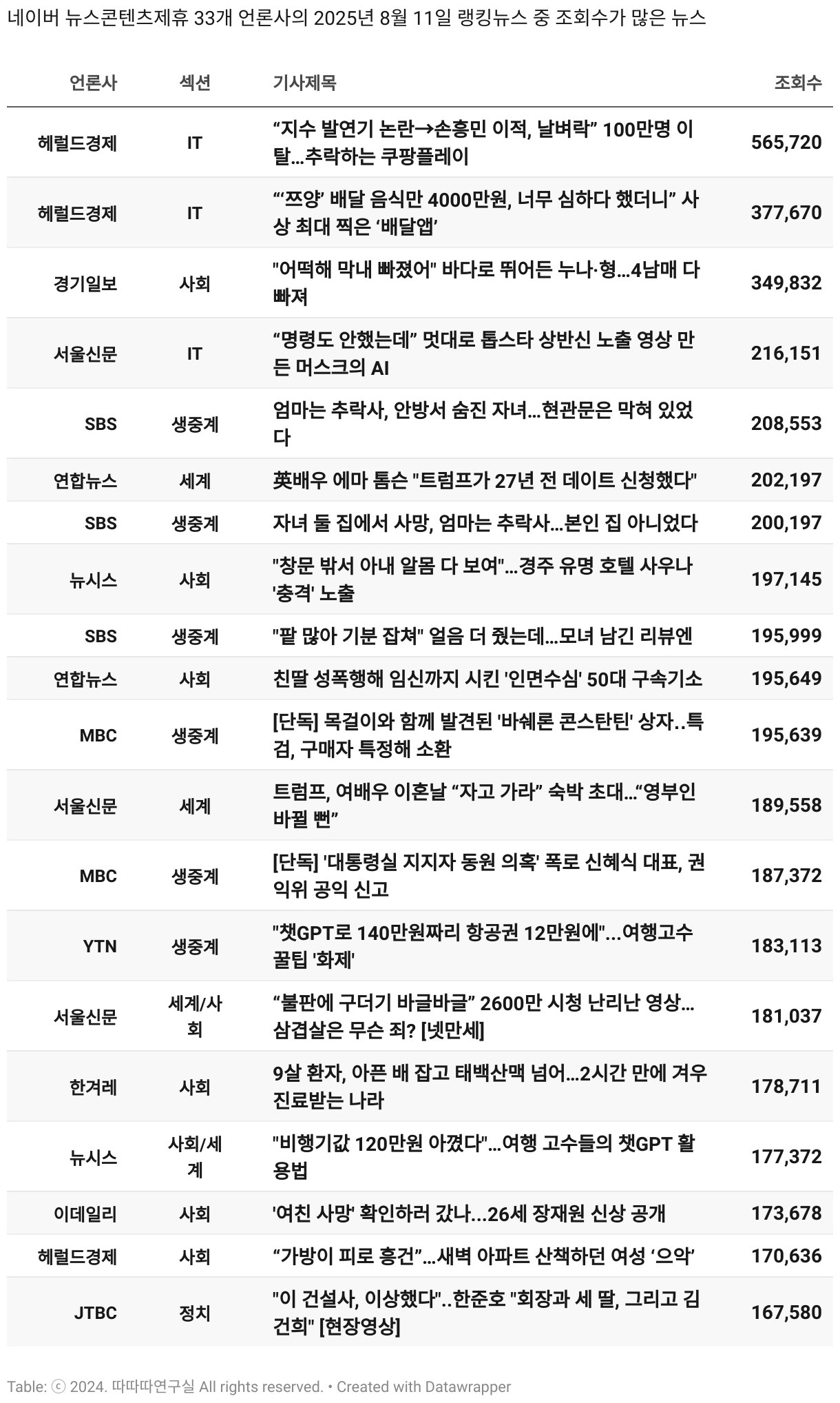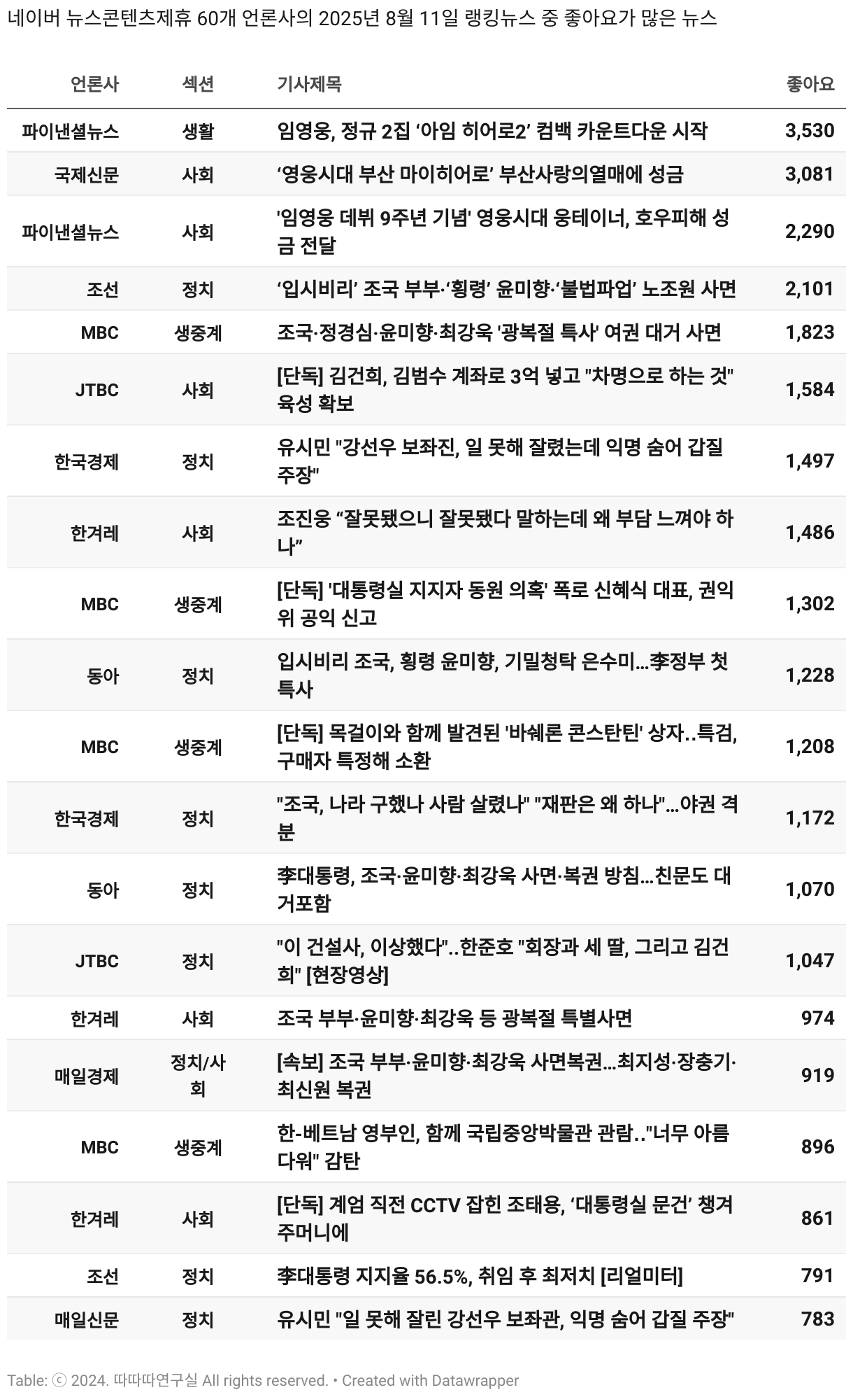 *데이터 수집 기간 : 2024년 6월 10일 *데이터 수집 대상 : 네이버 뉴스콘텐츠제휴 60개 언론사. 종합일간지 10개(경향신문, 국민일보, 동아일보, 문화일보, 서울신문, 세계일보, 조선일보, 중앙일보, 한겨레신문, 한국일보), 방송/통신사 14개(뉴스1, 뉴시스, 연합뉴스, 연합뉴스TV, 채널A, 한국경제TV, JTBC, KBS, MBC, MBN, SBS, SBS BIZ, TV조선, YTN), 경제지 11개(매일경제, 머니투데이, 비즈워치, 서울경제, 아시아경제, 이데일리, 조선비즈, 조세일보, 파이낸셜뉴스, 한국경제(유튜브제외), 헤럴드경제) 인터넷 8개(노컷뉴스, 더팩트, 데일리안, 머니S, 미디어오늘, 아이뉴스24, 오마이뉴스, 프레시안), IT 5개(디지털데일리,디지털타임스, 블로터, 전자신문, 지디넷코리아), 지역 12개(강원도민일보, 강원일보, 경기일보, 국제신문, 대구MBC, 대전일보, 매일신문, 부산일보, 전주MBC, CJB청주방송, JIBS, kbc광주방송)