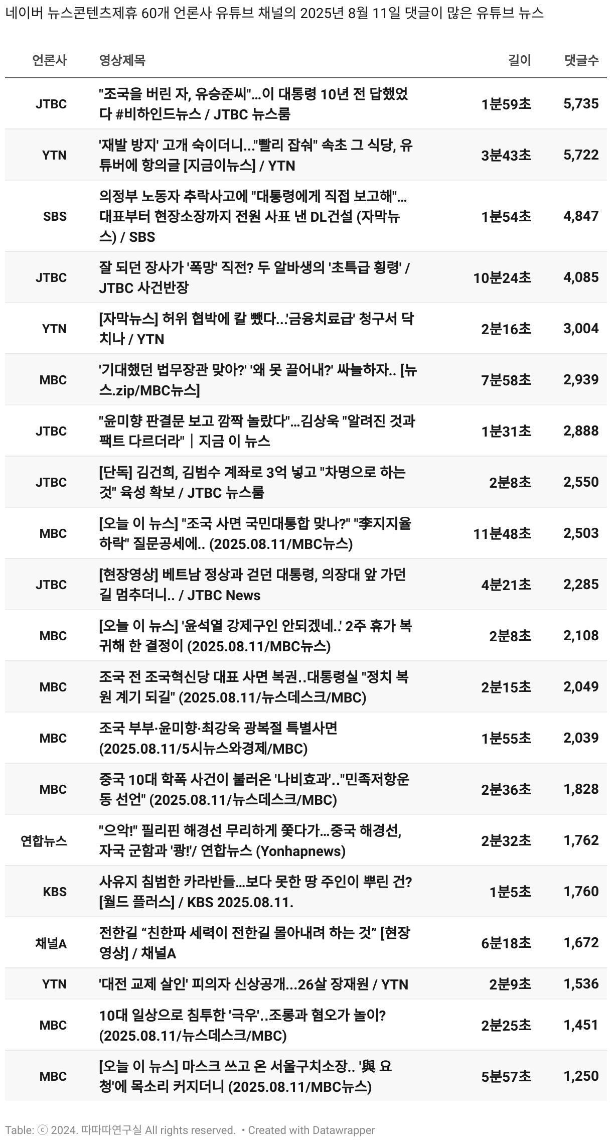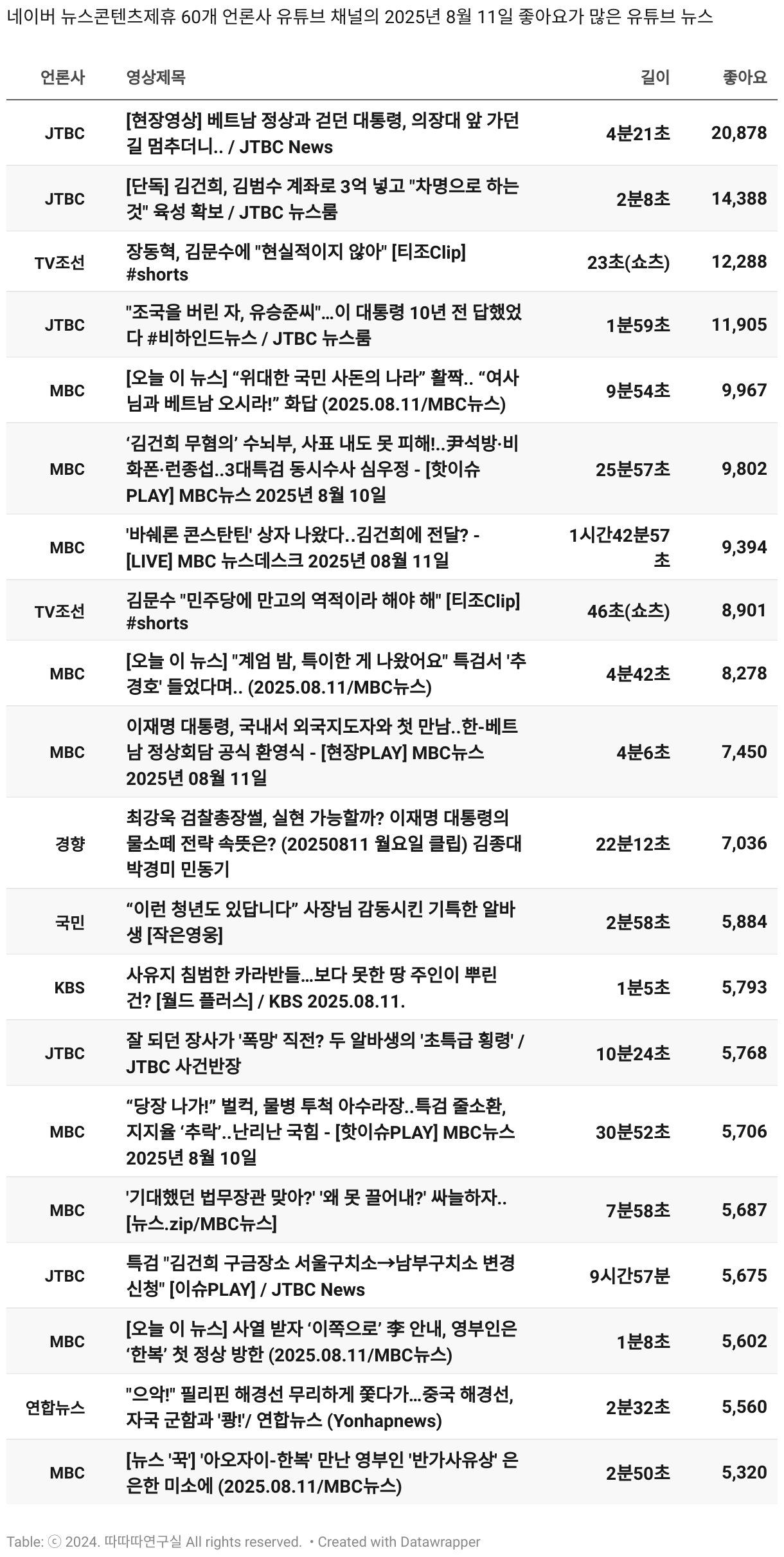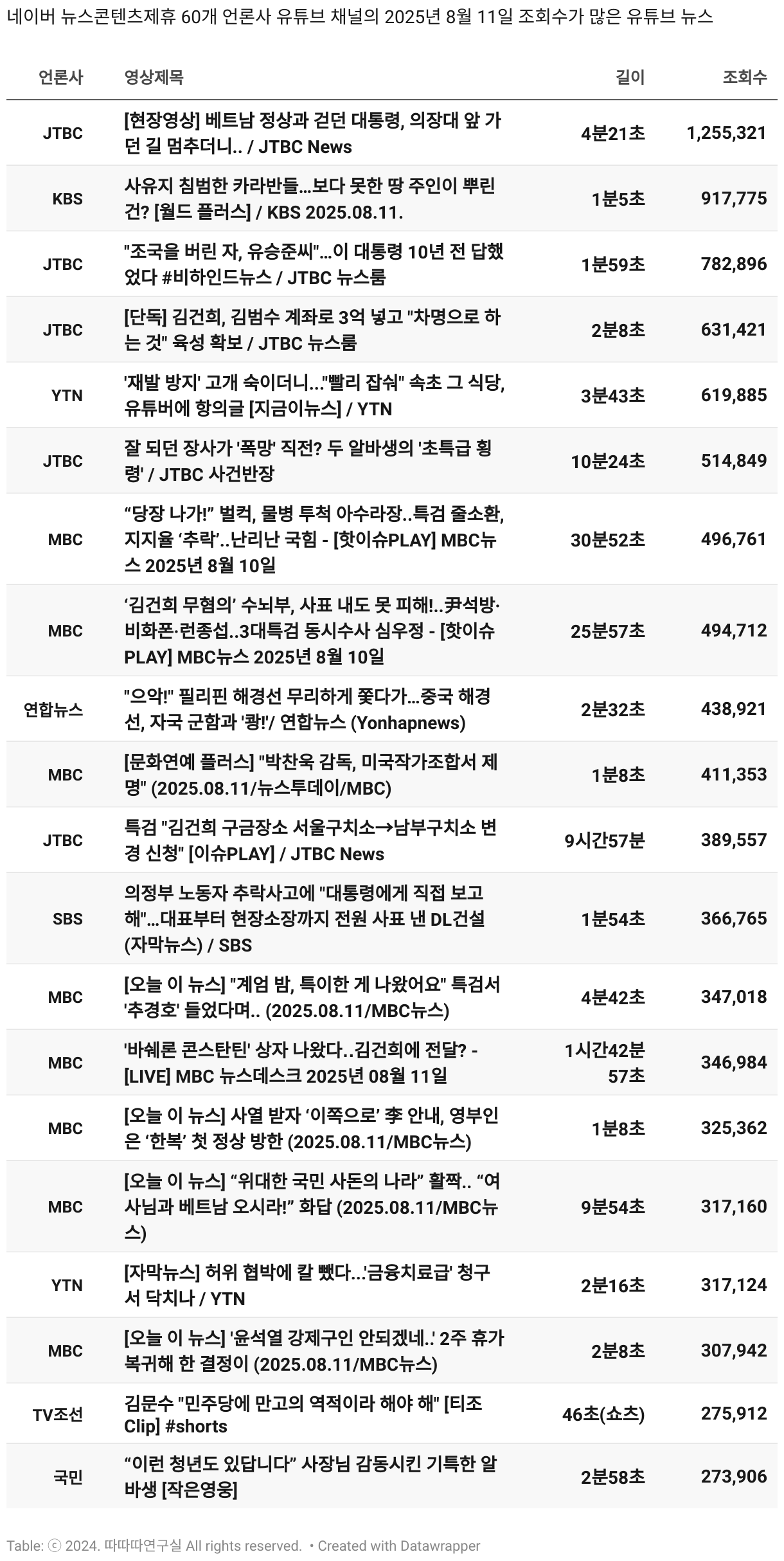 *데이터 수집 기간 : 2024년 6월 10일 *데이터 수집 대상 : 네이버 뉴스콘텐츠제휴 60개 언론사. 종합일간지 10개(경향신문, 국민일보, 동아일보, 문화일보, 서울신문, 세계일보, 조선일보, 중앙일보, 한겨레신문, 한국일보), 방송/통신사 14개(뉴스1, 뉴시스, 연합뉴스, 연합뉴스TV, 채널A, 한국경제TV, JTBC, KBS, MBC, MBN, SBS, SBS BIZ, TV조선, YTN), 경제지 11개(매일경제, 머니투데이, 비즈워치, 서울경제, 아시아경제, 이데일리, 조선비즈, 조세일보, 파이낸셜뉴스, 한국경제(유튜브제외), 헤럴드경제) 인터넷 8개(노컷뉴스, 더팩트, 데일리안, 머니S, 미디어오늘, 아이뉴스24, 오마이뉴스, 프레시안), IT 5개(디지털데일리,디지털타임스, 블로터, 전자신문, 지디넷코리아), 지역 12개(강원도민일보, 강원일보, 경기일보, 국제신문, 대구MBC, 대전일보, 매일신문, 부산일보, 전주MBC, CJB청주방송, JIBS, kbc광주방송)