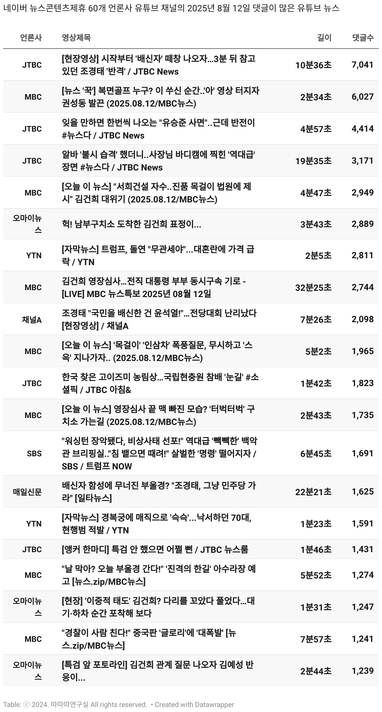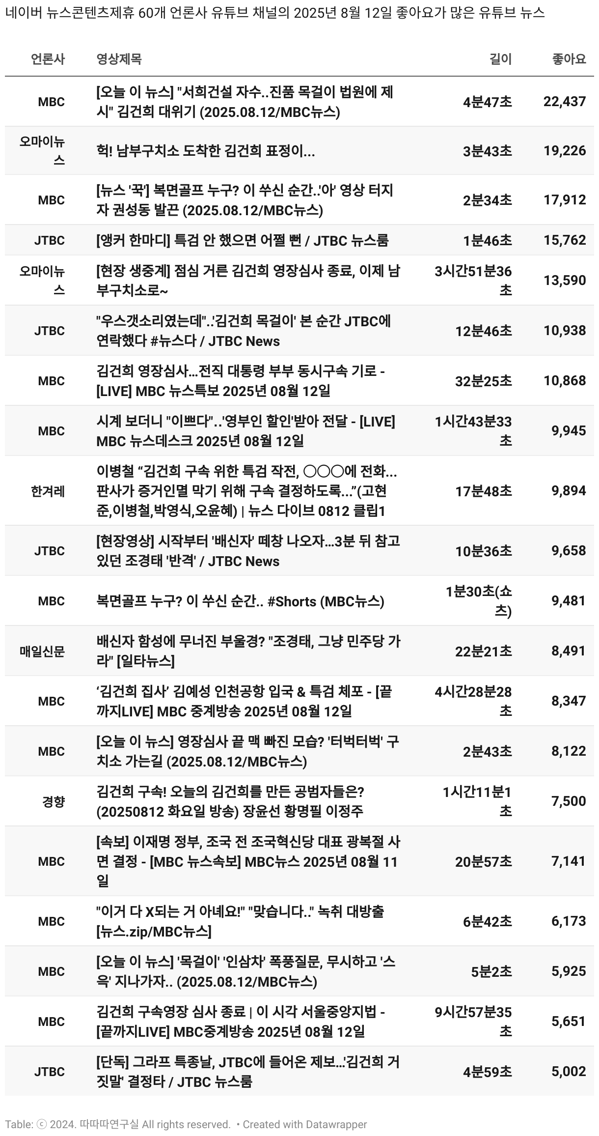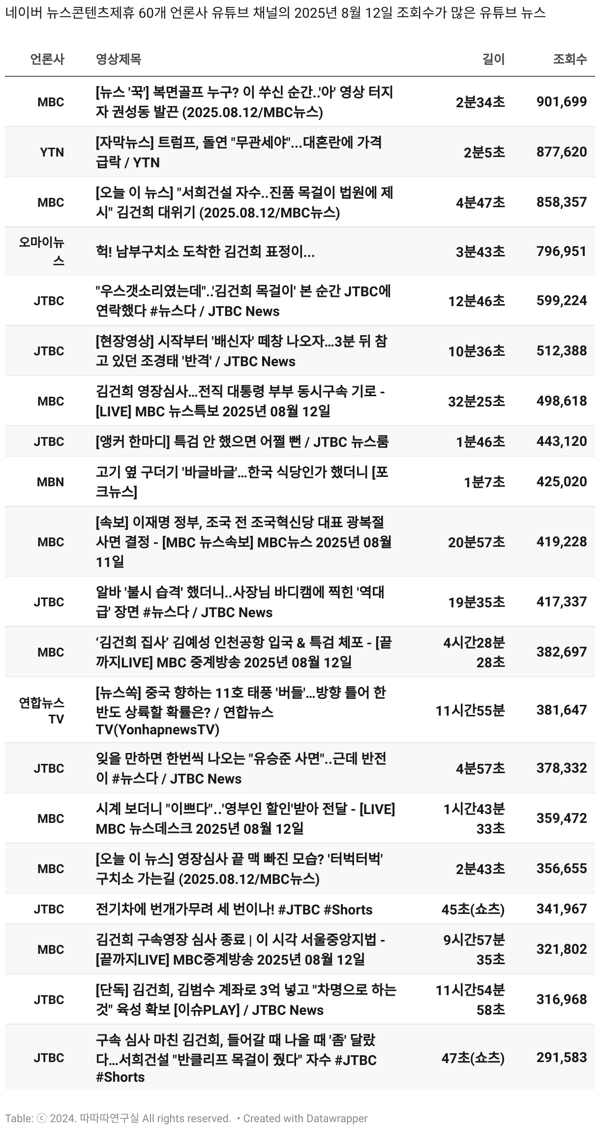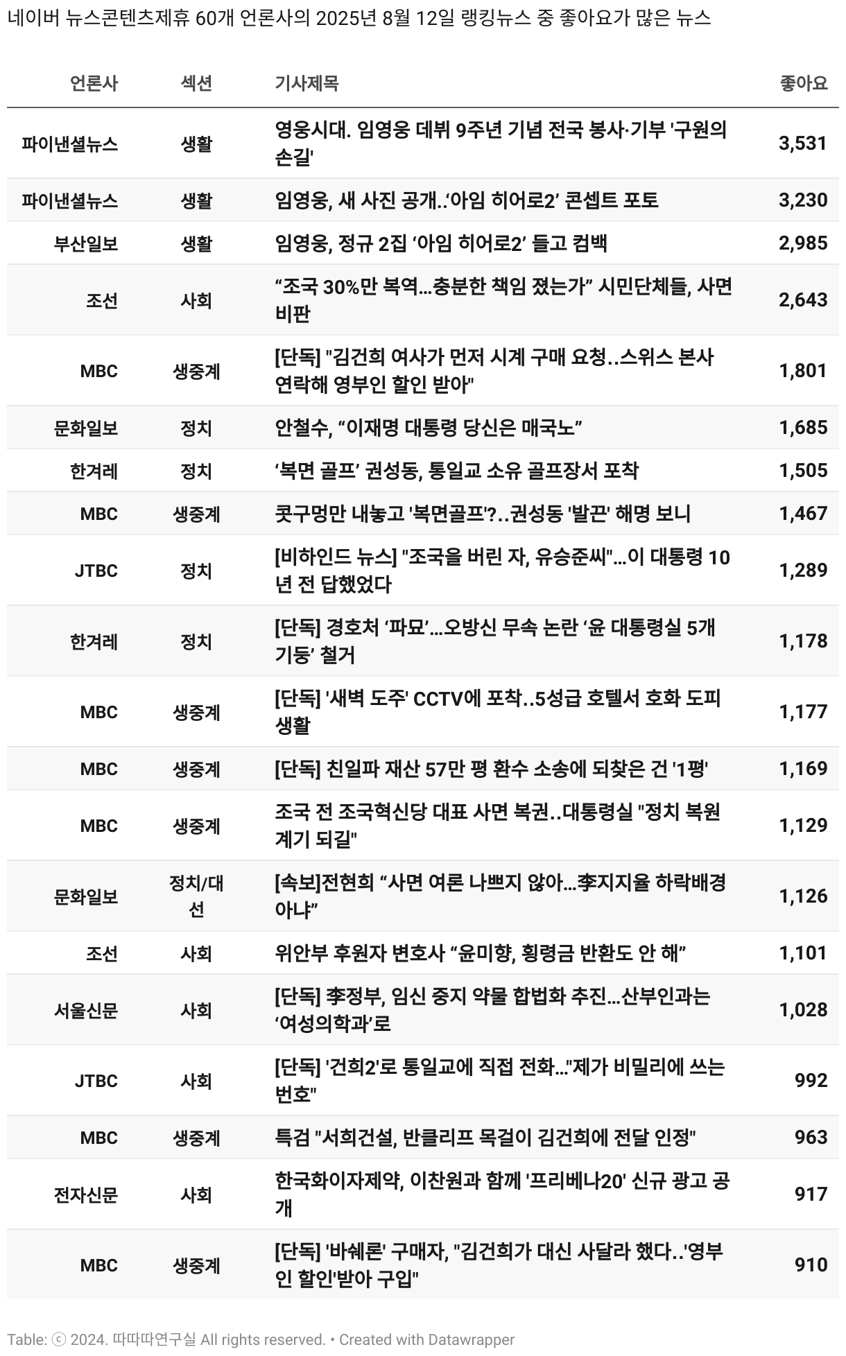 *데이터 수집 기간 : 2024년 6월 10일 *데이터 수집 대상 : 네이버 뉴스콘텐츠제휴 60개 언론사. 종합일간지 10개(경향신문, 국민일보, 동아일보, 문화일보, 서울신문, 세계일보, 조선일보, 중앙일보, 한겨레신문, 한국일보), 방송/통신사 14개(뉴스1, 뉴시스, 연합뉴스, 연합뉴스TV, 채널A, 한국경제TV, JTBC, KBS, MBC, MBN, SBS, SBS BIZ, TV조선, YTN), 경제지 11개(매일경제, 머니투데이, 비즈워치, 서울경제, 아시아경제, 이데일리, 조선비즈, 조세일보, 파이낸셜뉴스, 한국경제(유튜브제외), 헤럴드경제) 인터넷 8개(노컷뉴스, 더팩트, 데일리안, 머니S, 미디어오늘, 아이뉴스24, 오마이뉴스, 프레시안), IT 5개(디지털데일리,디지털타임스, 블로터, 전자신문, 지디넷코리아), 지역 12개(강원도민일보, 강원일보, 경기일보, 국제신문, 대구MBC, 대전일보, 매일신문, 부산일보, 전주MBC, CJB청주방송, JIBS, kbc광주방송)