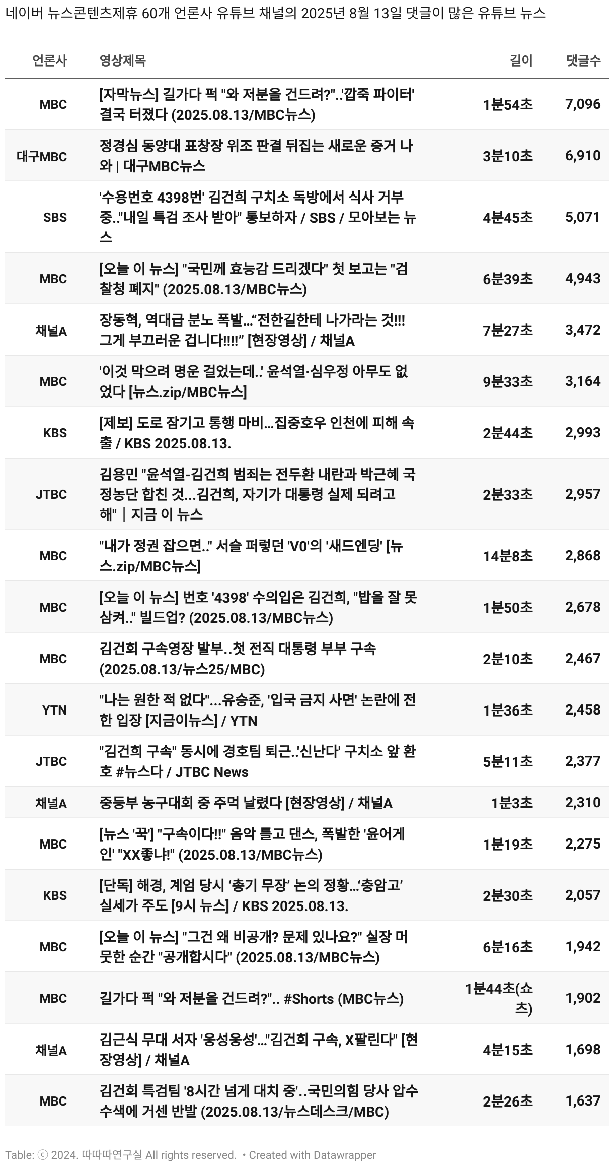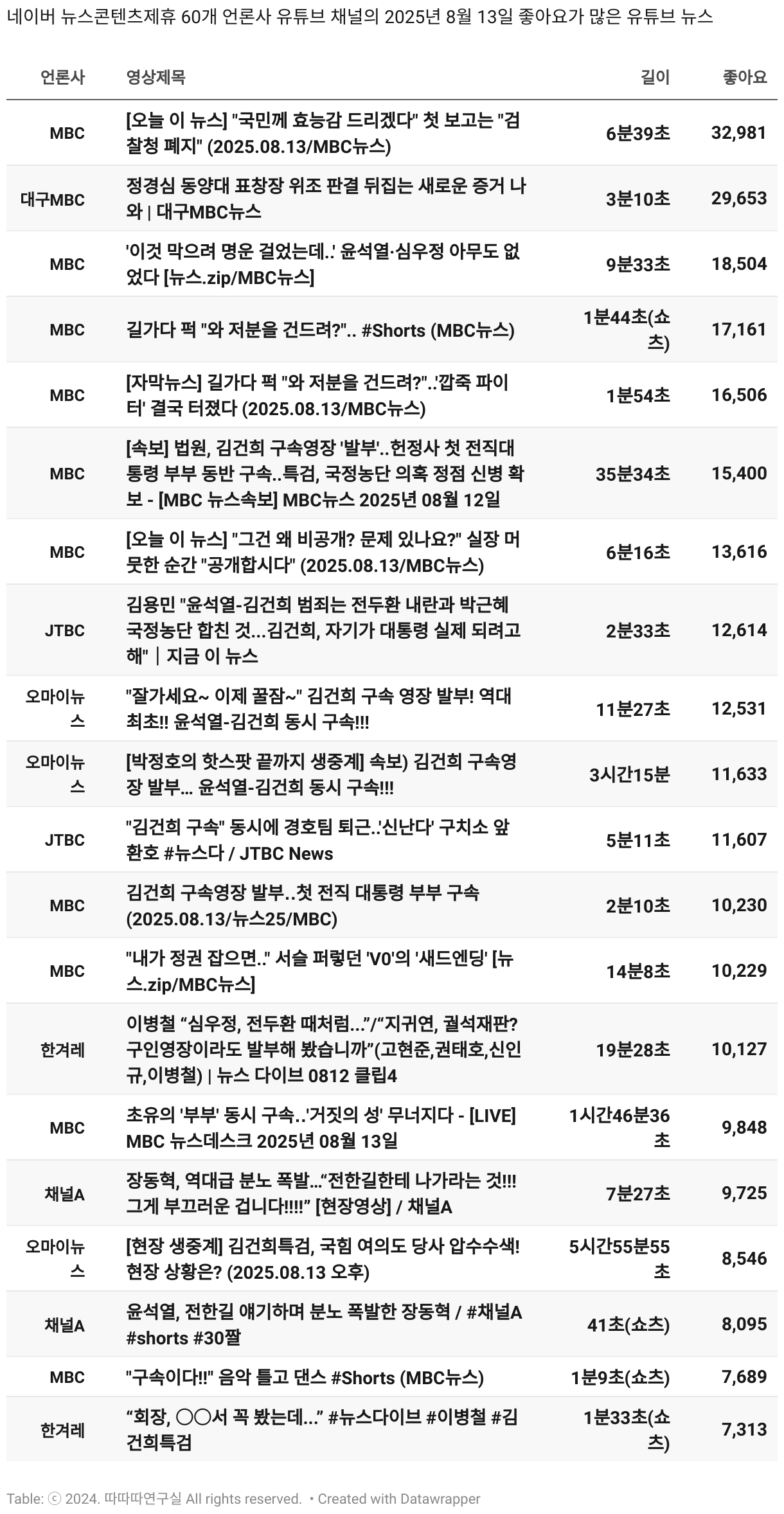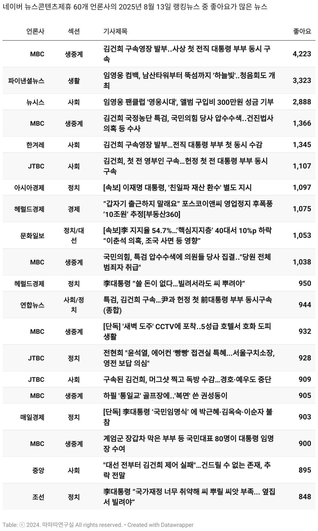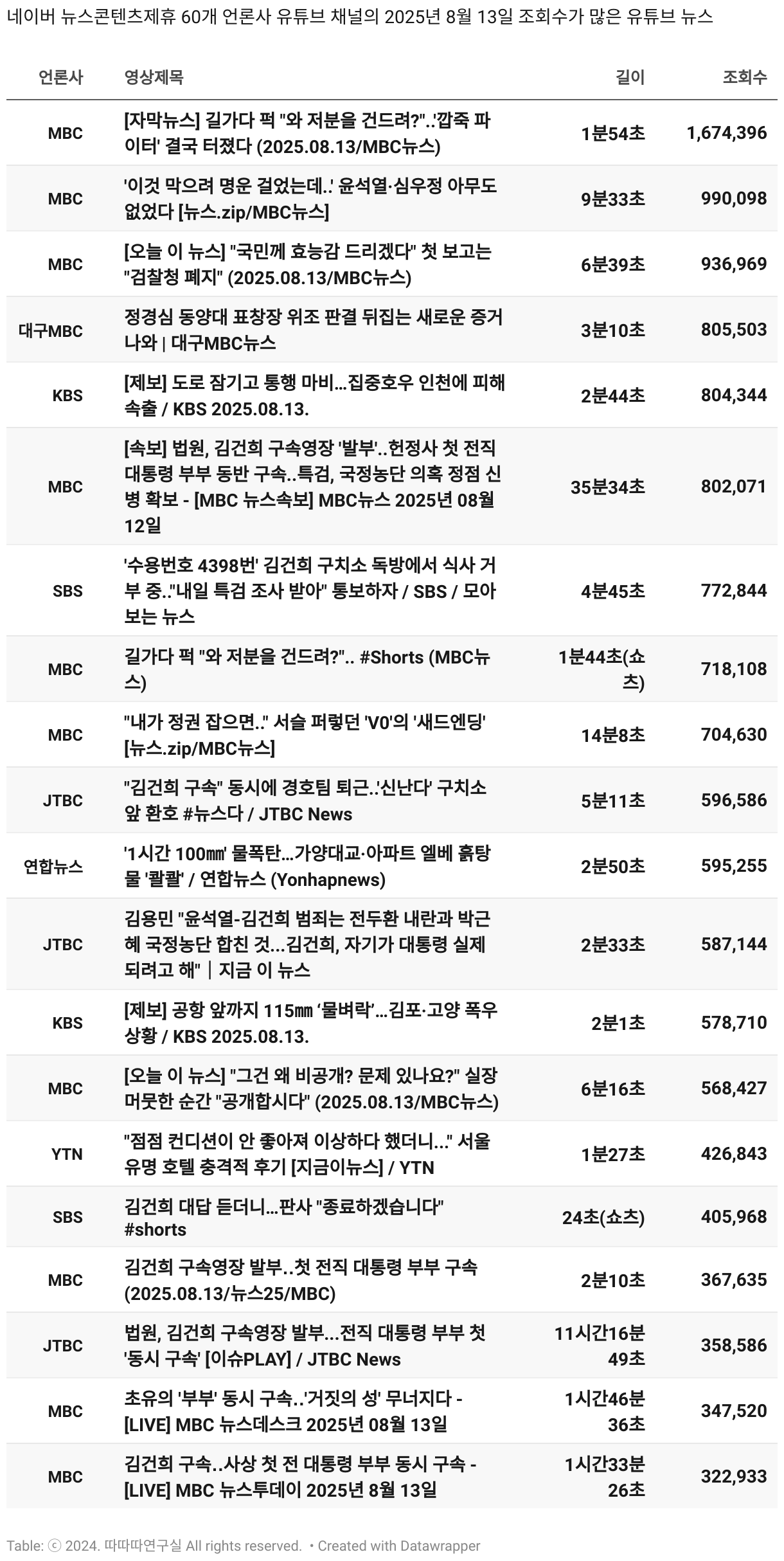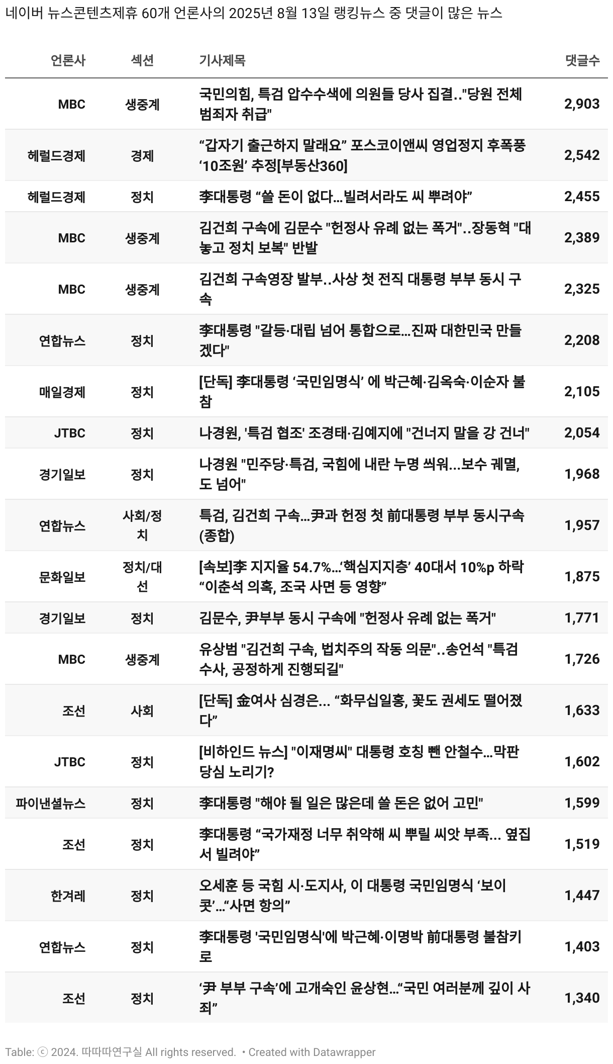 *데이터 수집 기간 : 2024년 6월 10일 *데이터 수집 대상 : 네이버 뉴스콘텐츠제휴 60개 언론사. 종합일간지 10개(경향신문, 국민일보, 동아일보, 문화일보, 서울신문, 세계일보, 조선일보, 중앙일보, 한겨레신문, 한국일보), 방송/통신사 14개(뉴스1, 뉴시스, 연합뉴스, 연합뉴스TV, 채널A, 한국경제TV, JTBC, KBS, MBC, MBN, SBS, SBS BIZ, TV조선, YTN), 경제지 11개(매일경제, 머니투데이, 비즈워치, 서울경제, 아시아경제, 이데일리, 조선비즈, 조세일보, 파이낸셜뉴스, 한국경제(유튜브제외), 헤럴드경제) 인터넷 8개(노컷뉴스, 더팩트, 데일리안, 머니S, 미디어오늘, 아이뉴스24, 오마이뉴스, 프레시안), IT 5개(디지털데일리,디지털타임스, 블로터, 전자신문, 지디넷코리아), 지역 12개(강원도민일보, 강원일보, 경기일보, 국제신문, 대구MBC, 대전일보, 매일신문, 부산일보, 전주MBC, CJB청주방송, JIBS, kbc광주방송)