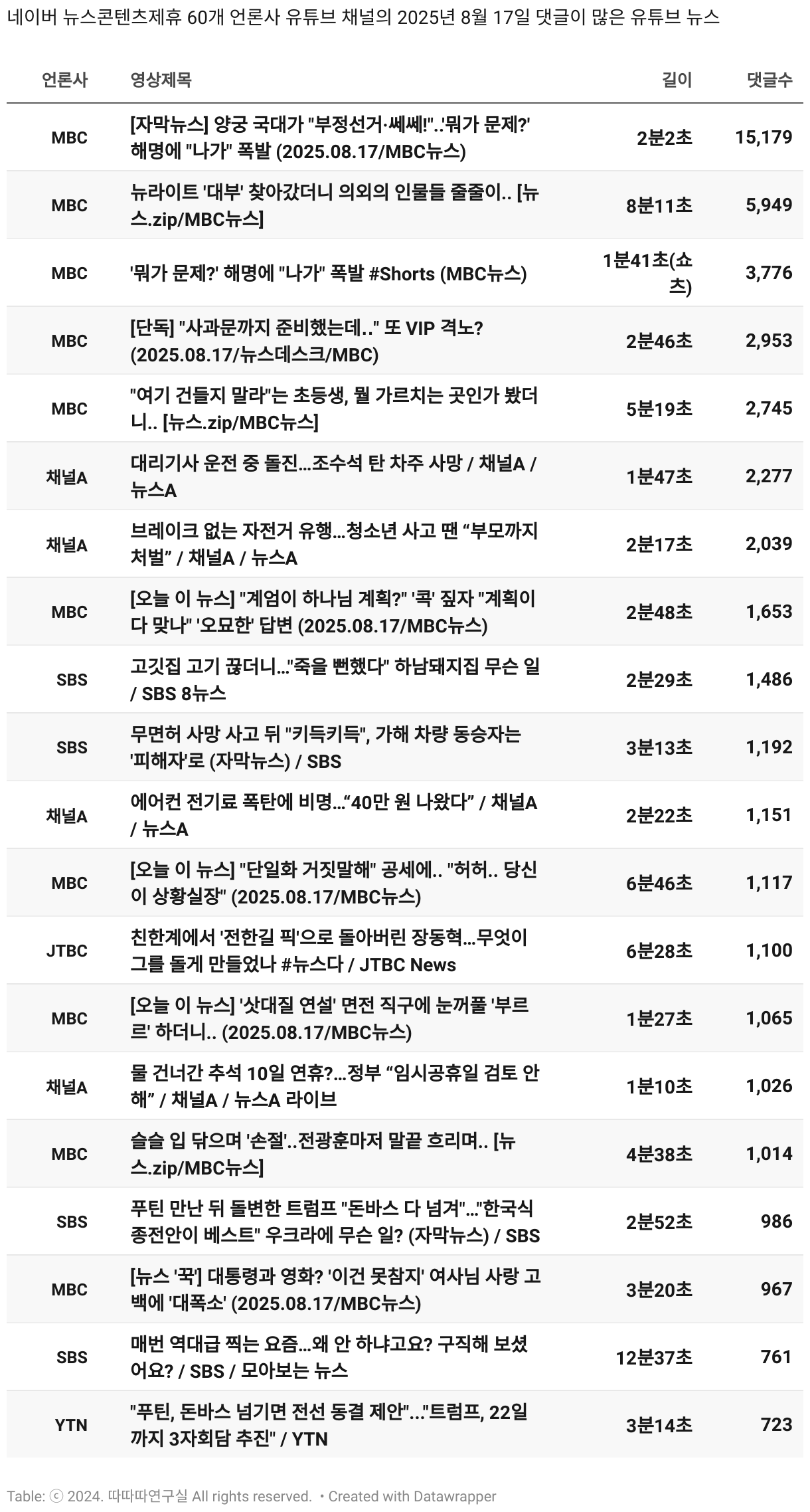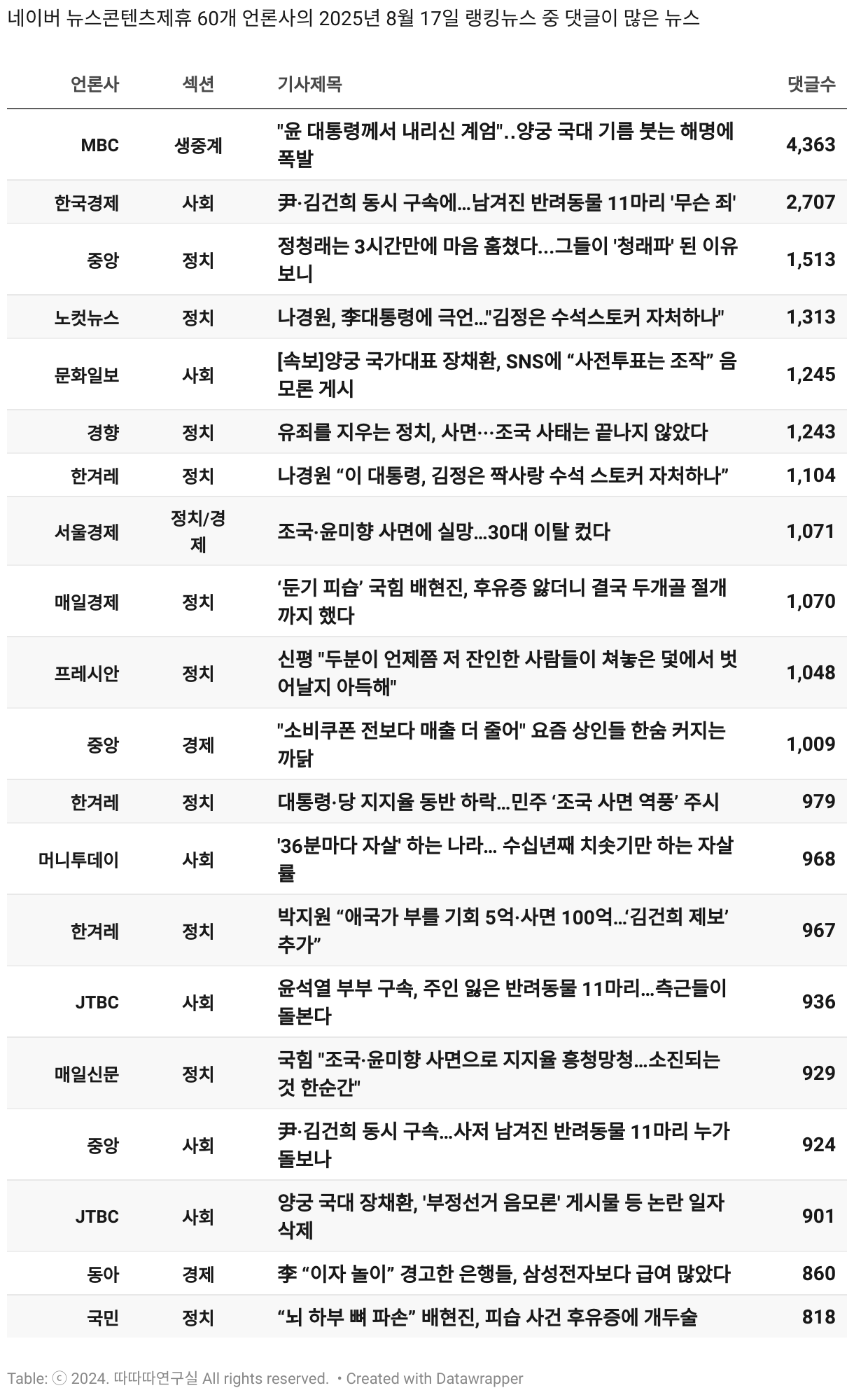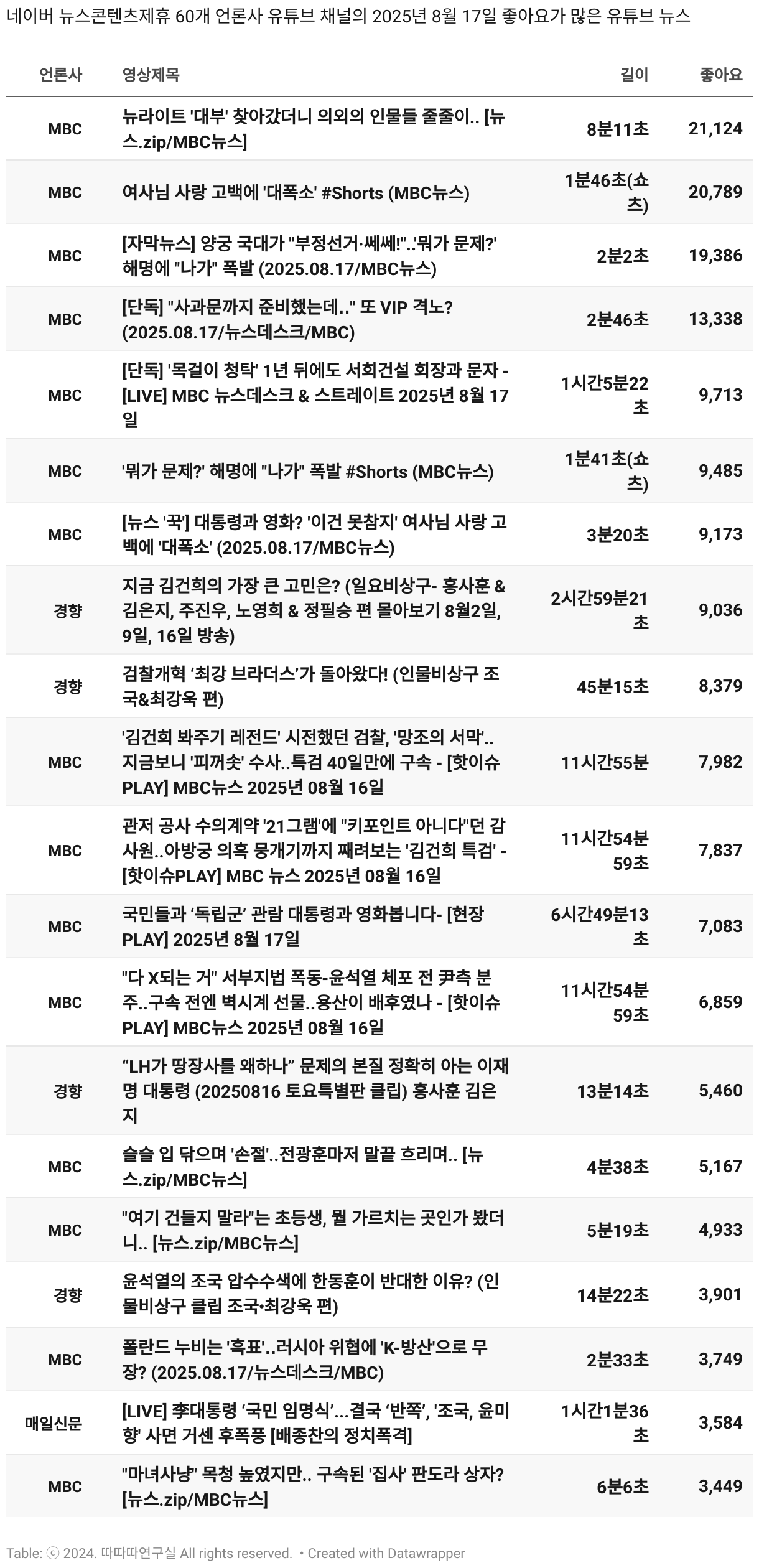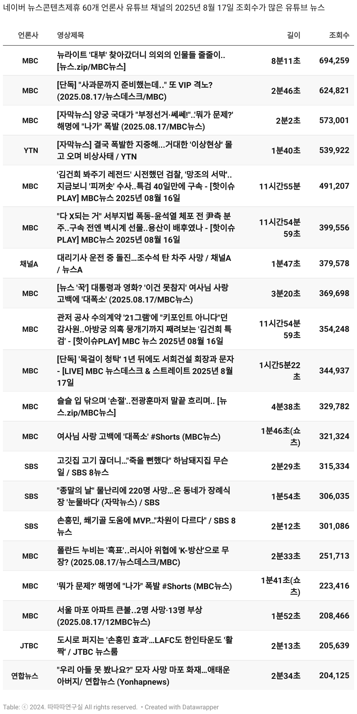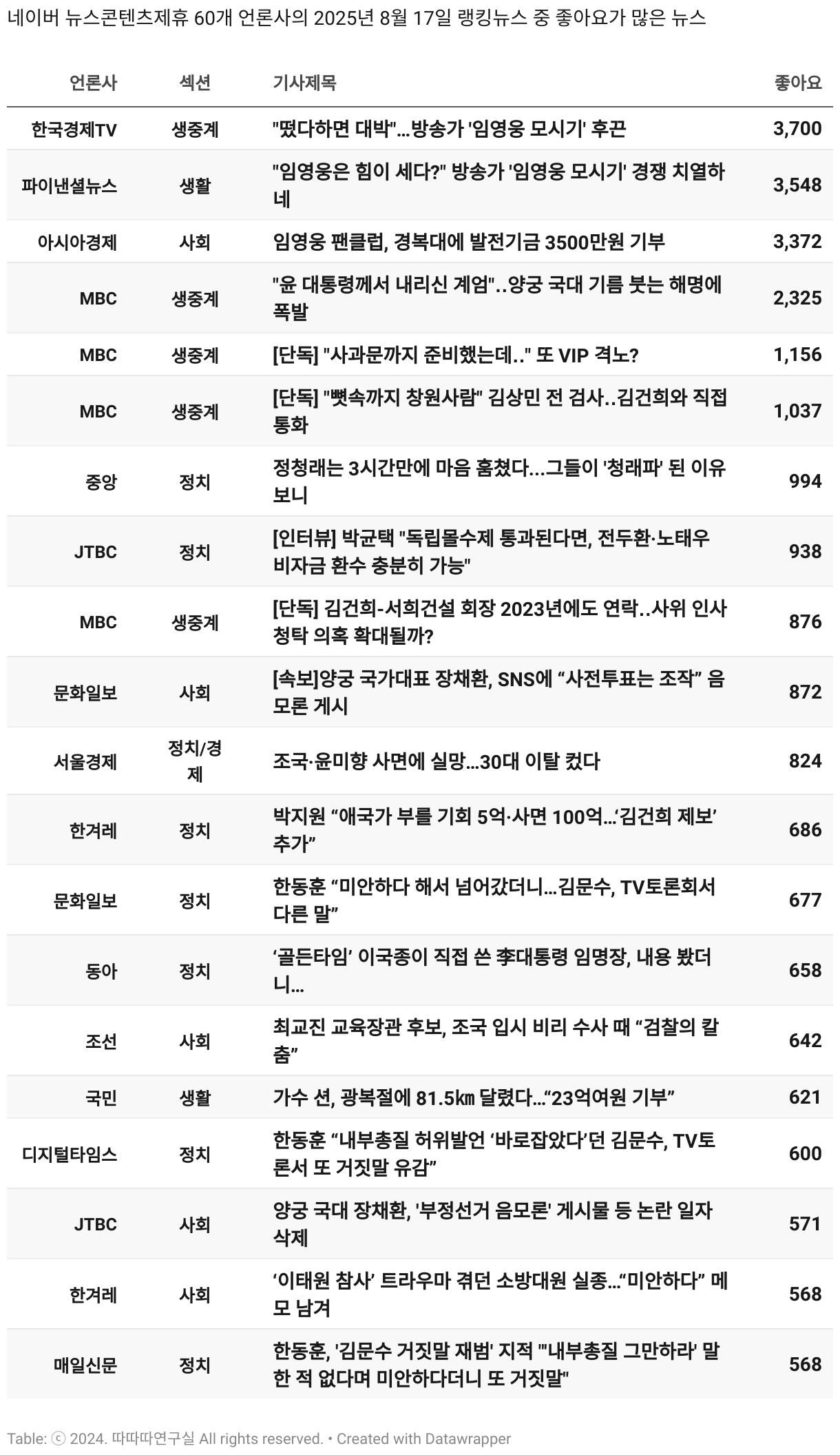 *데이터 수집 기간 : 2024년 6월 10일 *데이터 수집 대상 : 네이버 뉴스콘텐츠제휴 60개 언론사. 종합일간지 10개(경향신문, 국민일보, 동아일보, 문화일보, 서울신문, 세계일보, 조선일보, 중앙일보, 한겨레신문, 한국일보), 방송/통신사 14개(뉴스1, 뉴시스, 연합뉴스, 연합뉴스TV, 채널A, 한국경제TV, JTBC, KBS, MBC, MBN, SBS, SBS BIZ, TV조선, YTN), 경제지 11개(매일경제, 머니투데이, 비즈워치, 서울경제, 아시아경제, 이데일리, 조선비즈, 조세일보, 파이낸셜뉴스, 한국경제(유튜브제외), 헤럴드경제) 인터넷 8개(노컷뉴스, 더팩트, 데일리안, 머니S, 미디어오늘, 아이뉴스24, 오마이뉴스, 프레시안), IT 5개(디지털데일리,디지털타임스, 블로터, 전자신문, 지디넷코리아), 지역 12개(강원도민일보, 강원일보, 경기일보, 국제신문, 대구MBC, 대전일보, 매일신문, 부산일보, 전주MBC, CJB청주방송, JIBS, kbc광주방송)