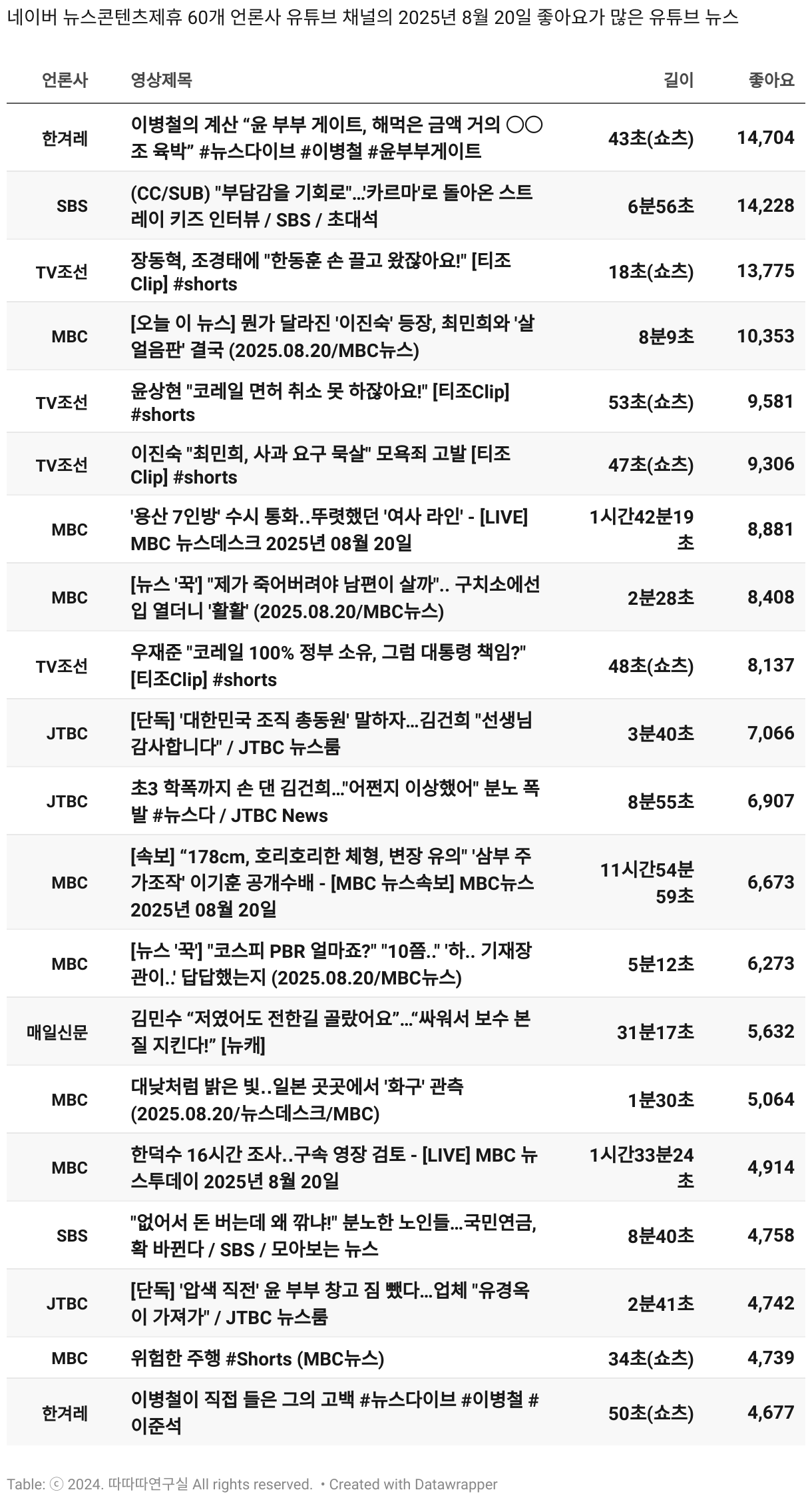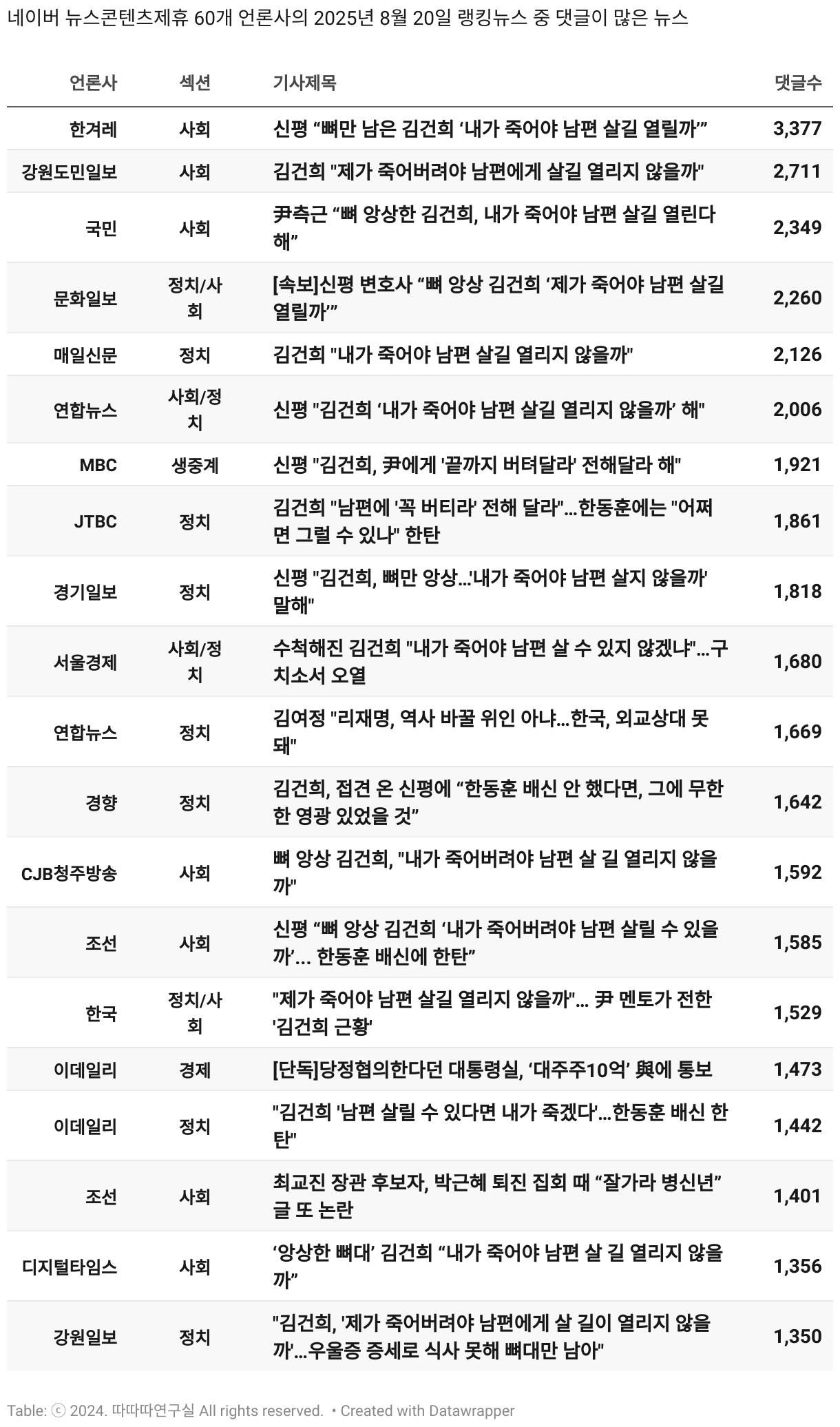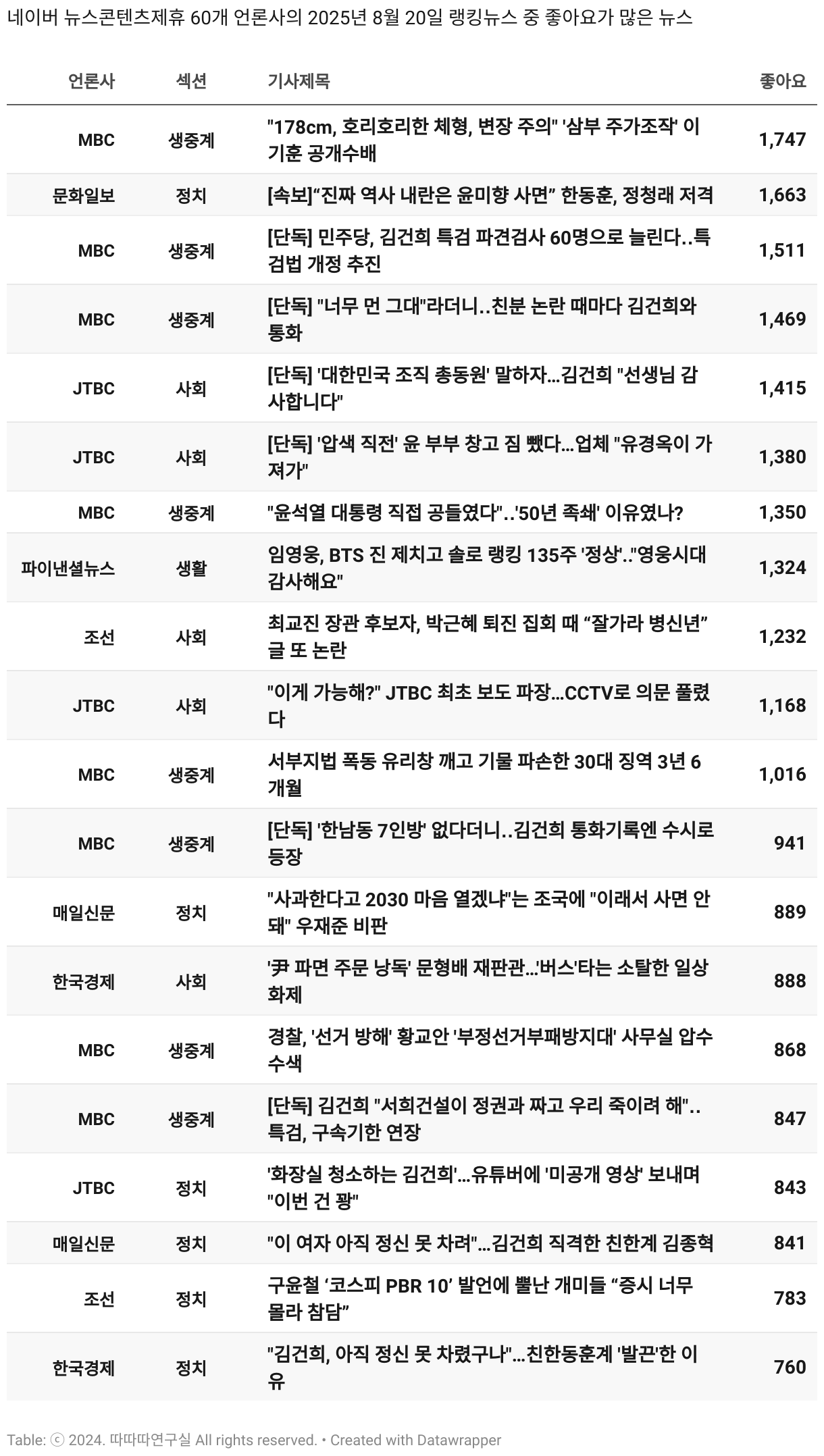 *데이터 수집 기간 : 2024년 6월 10일 *데이터 수집 대상 : 네이버 뉴스콘텐츠제휴 60개 언론사. 종합일간지 10개(경향신문, 국민일보, 동아일보, 문화일보, 서울신문, 세계일보, 조선일보, 중앙일보, 한겨레신문, 한국일보), 방송/통신사 14개(뉴스1, 뉴시스, 연합뉴스, 연합뉴스TV, 채널A, 한국경제TV, JTBC, KBS, MBC, MBN, SBS, SBS BIZ, TV조선, YTN), 경제지 11개(매일경제, 머니투데이, 비즈워치, 서울경제, 아시아경제, 이데일리, 조선비즈, 조세일보, 파이낸셜뉴스, 한국경제(유튜브제외), 헤럴드경제) 인터넷 8개(노컷뉴스, 더팩트, 데일리안, 머니S, 미디어오늘, 아이뉴스24, 오마이뉴스, 프레시안), IT 5개(디지털데일리,디지털타임스, 블로터, 전자신문, 지디넷코리아), 지역 12개(강원도민일보, 강원일보, 경기일보, 국제신문, 대구MBC, 대전일보, 매일신문, 부산일보, 전주MBC, CJB청주방송, JIBS, kbc광주방송)