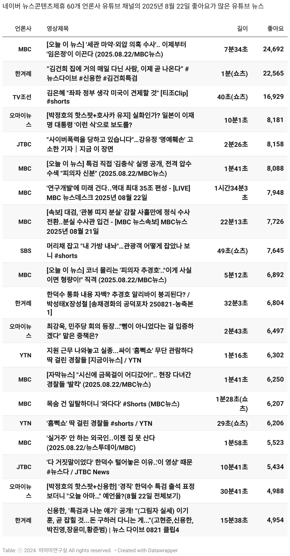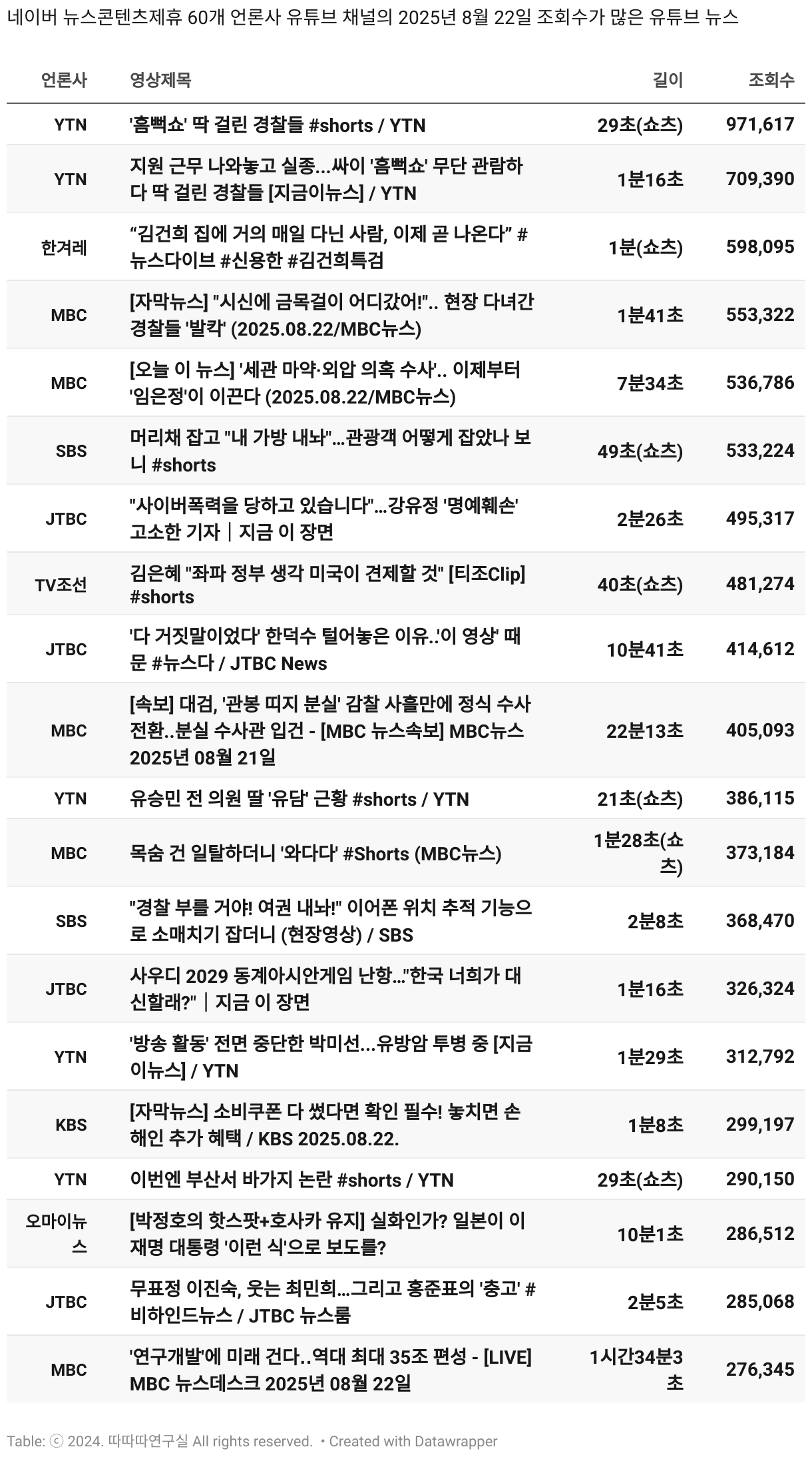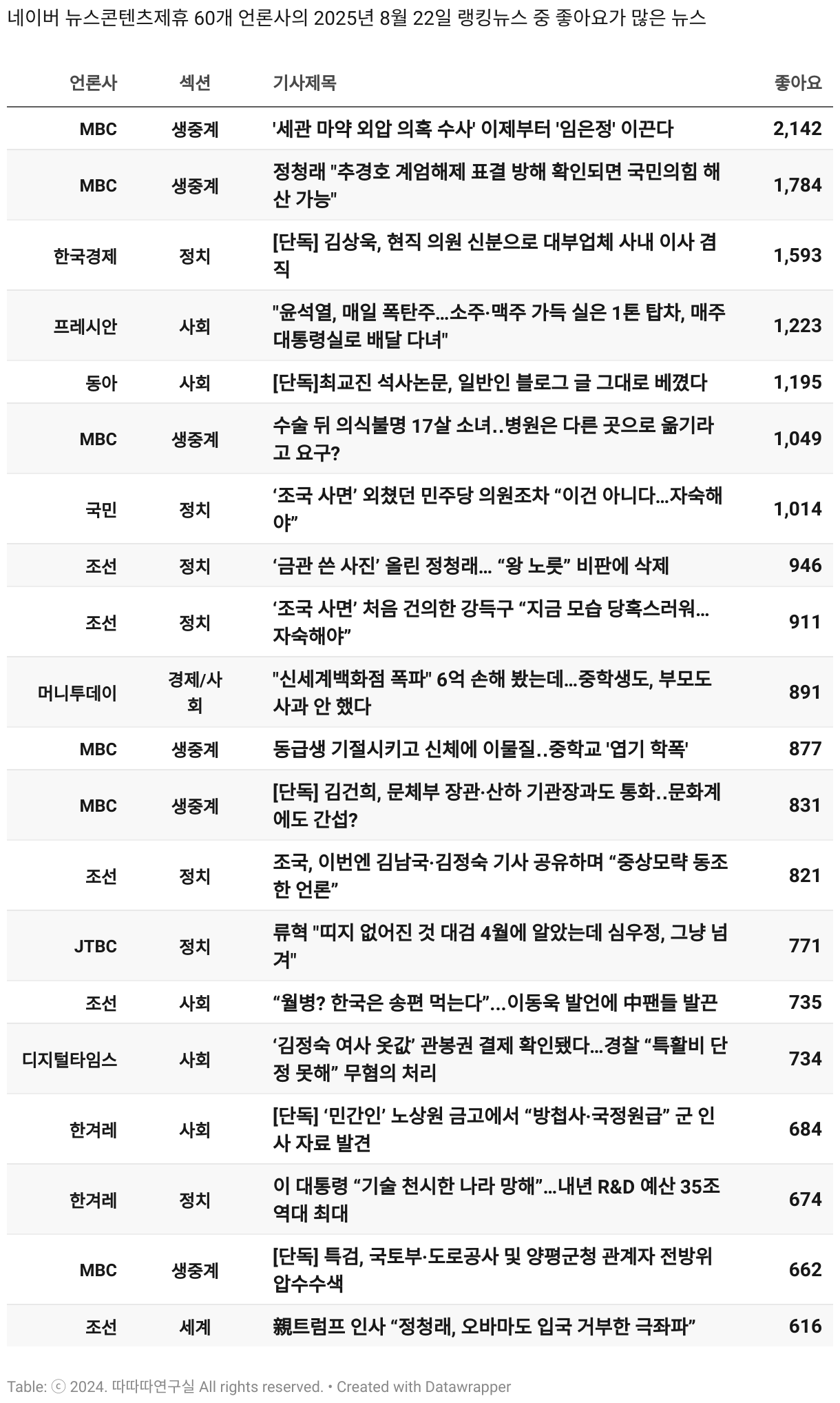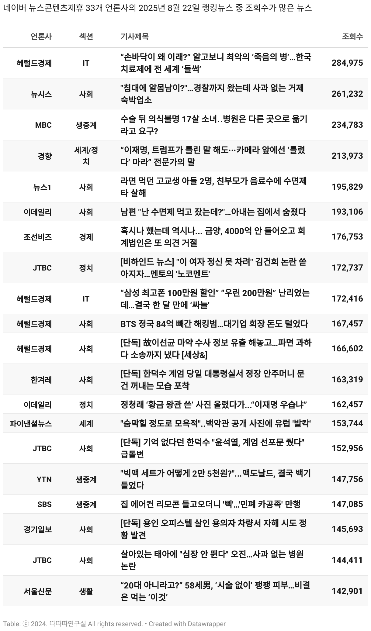 *데이터 수집 기간 : 2024년 6월 10일 *데이터 수집 대상 : 네이버 뉴스콘텐츠제휴 60개 언론사. 종합일간지 10개(경향신문, 국민일보, 동아일보, 문화일보, 서울신문, 세계일보, 조선일보, 중앙일보, 한겨레신문, 한국일보), 방송/통신사 14개(뉴스1, 뉴시스, 연합뉴스, 연합뉴스TV, 채널A, 한국경제TV, JTBC, KBS, MBC, MBN, SBS, SBS BIZ, TV조선, YTN), 경제지 11개(매일경제, 머니투데이, 비즈워치, 서울경제, 아시아경제, 이데일리, 조선비즈, 조세일보, 파이낸셜뉴스, 한국경제(유튜브제외), 헤럴드경제) 인터넷 8개(노컷뉴스, 더팩트, 데일리안, 머니S, 미디어오늘, 아이뉴스24, 오마이뉴스, 프레시안), IT 5개(디지털데일리,디지털타임스, 블로터, 전자신문, 지디넷코리아), 지역 12개(강원도민일보, 강원일보, 경기일보, 국제신문, 대구MBC, 대전일보, 매일신문, 부산일보, 전주MBC, CJB청주방송, JIBS, kbc광주방송)