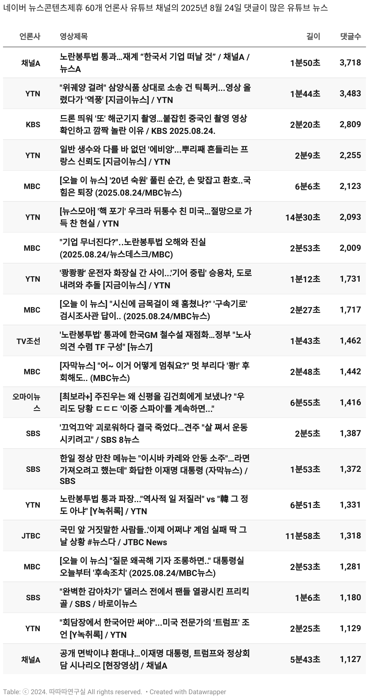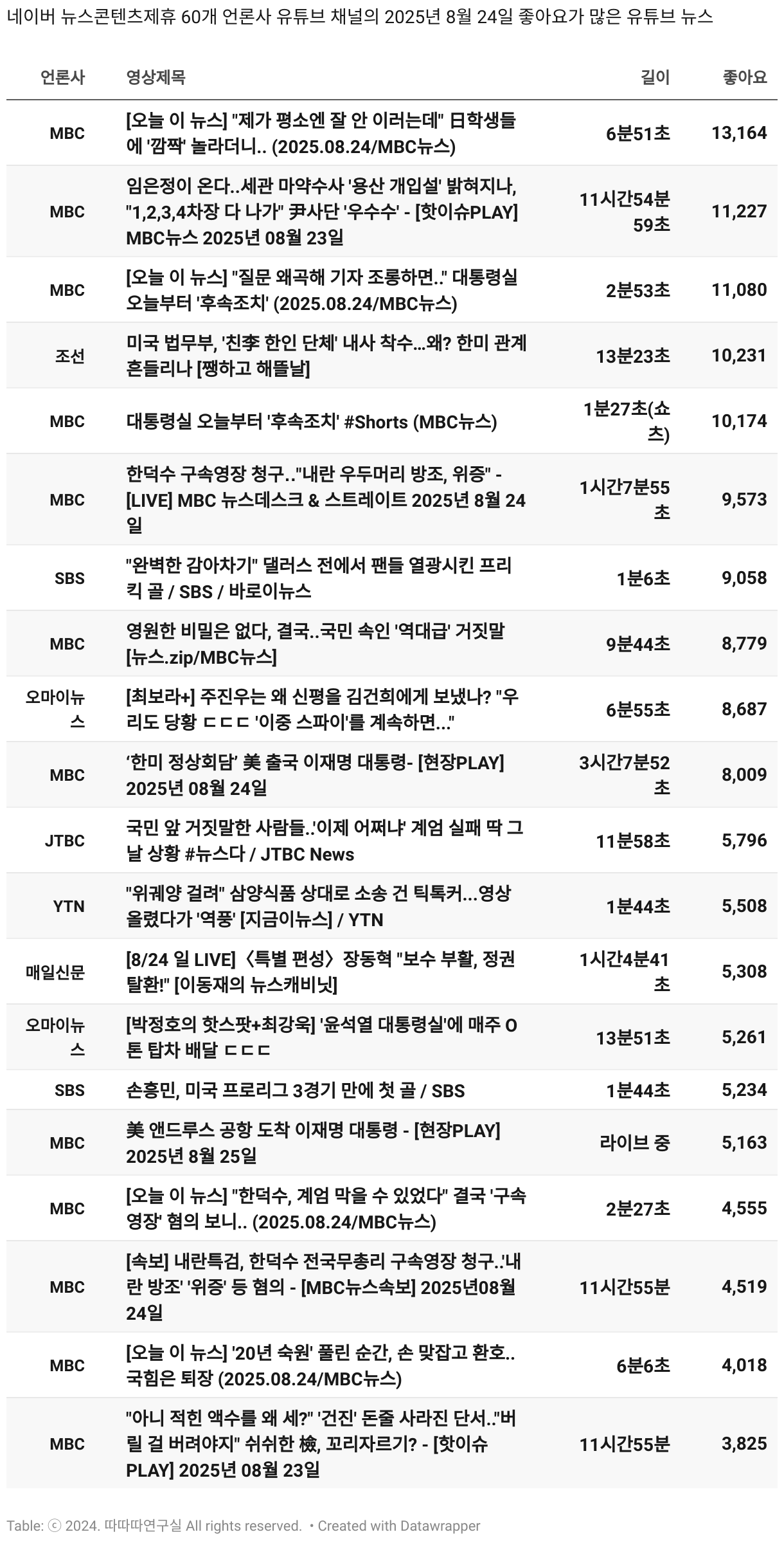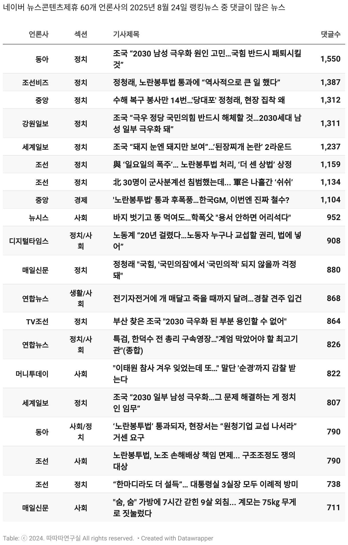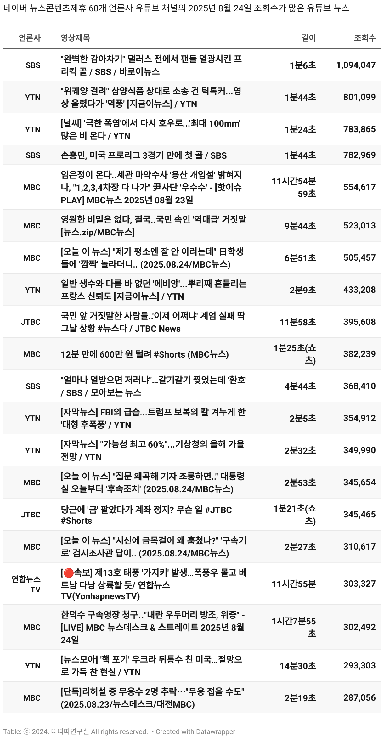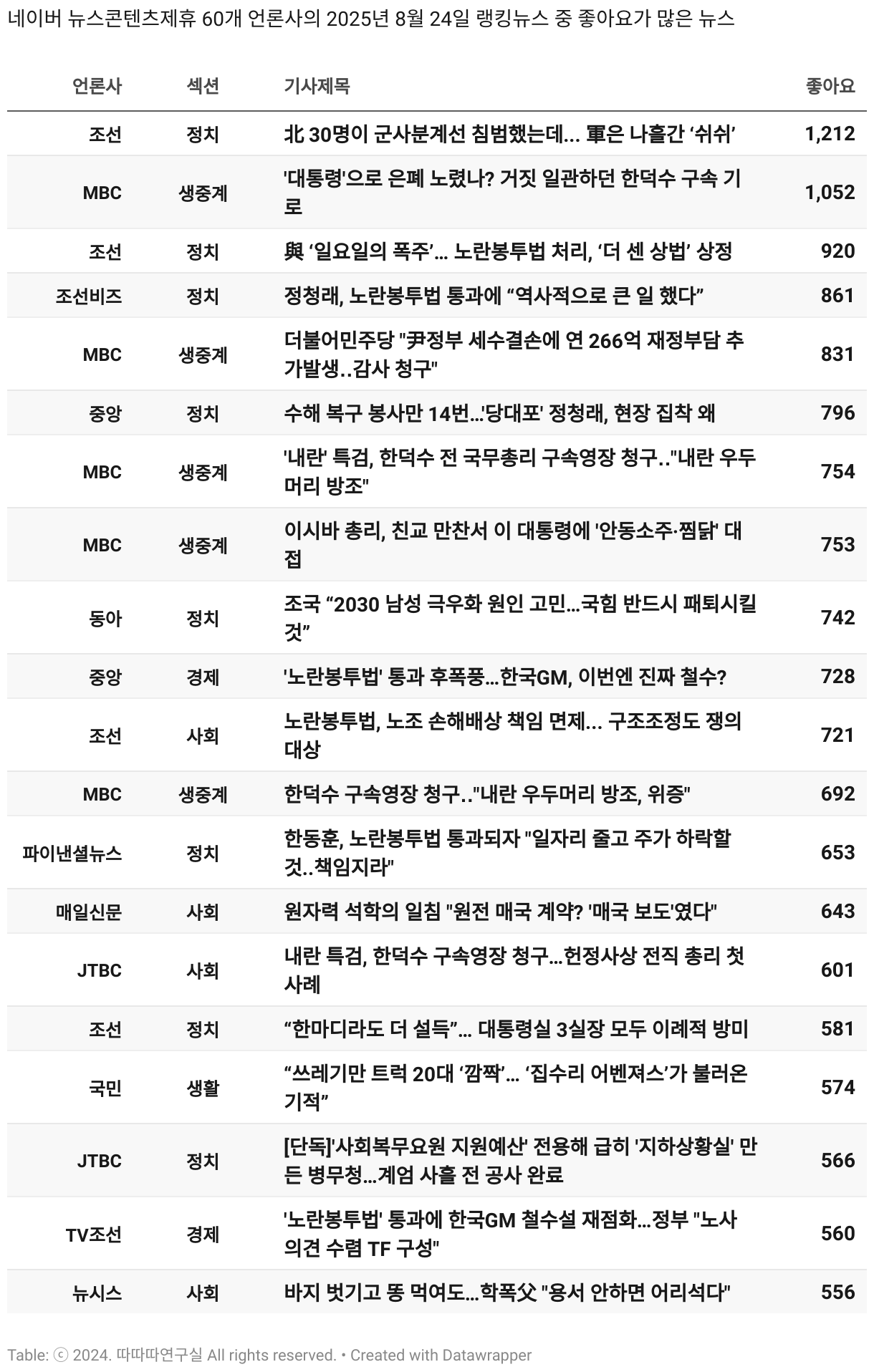 *데이터 수집 기간 : 2024년 6월 10일 *데이터 수집 대상 : 네이버 뉴스콘텐츠제휴 60개 언론사. 종합일간지 10개(경향신문, 국민일보, 동아일보, 문화일보, 서울신문, 세계일보, 조선일보, 중앙일보, 한겨레신문, 한국일보), 방송/통신사 14개(뉴스1, 뉴시스, 연합뉴스, 연합뉴스TV, 채널A, 한국경제TV, JTBC, KBS, MBC, MBN, SBS, SBS BIZ, TV조선, YTN), 경제지 11개(매일경제, 머니투데이, 비즈워치, 서울경제, 아시아경제, 이데일리, 조선비즈, 조세일보, 파이낸셜뉴스, 한국경제(유튜브제외), 헤럴드경제) 인터넷 8개(노컷뉴스, 더팩트, 데일리안, 머니S, 미디어오늘, 아이뉴스24, 오마이뉴스, 프레시안), IT 5개(디지털데일리,디지털타임스, 블로터, 전자신문, 지디넷코리아), 지역 12개(강원도민일보, 강원일보, 경기일보, 국제신문, 대구MBC, 대전일보, 매일신문, 부산일보, 전주MBC, CJB청주방송, JIBS, kbc광주방송)