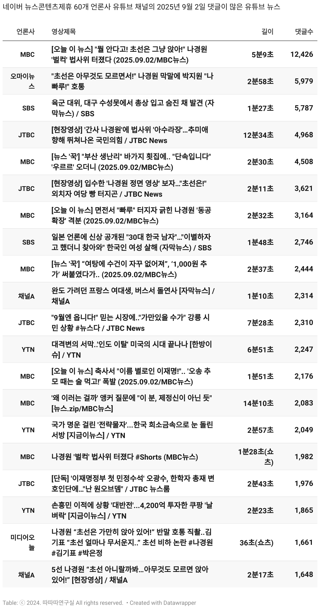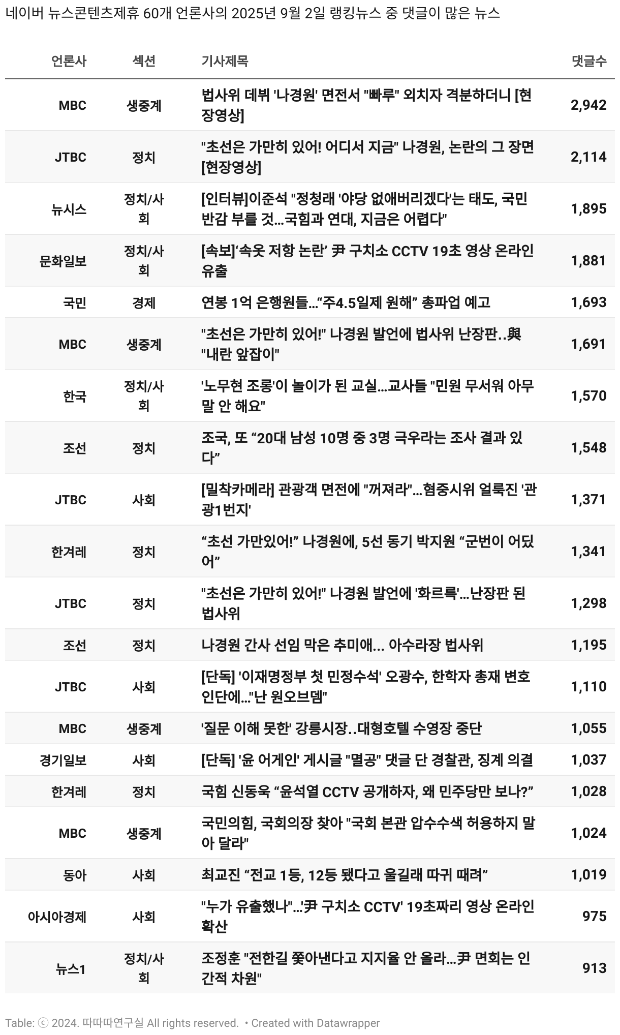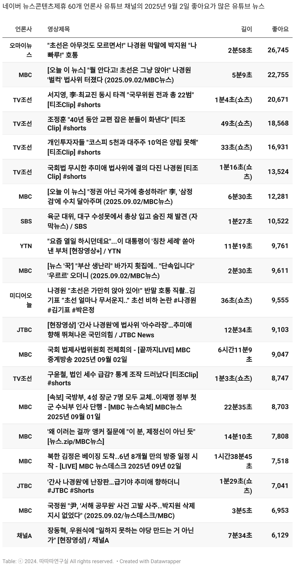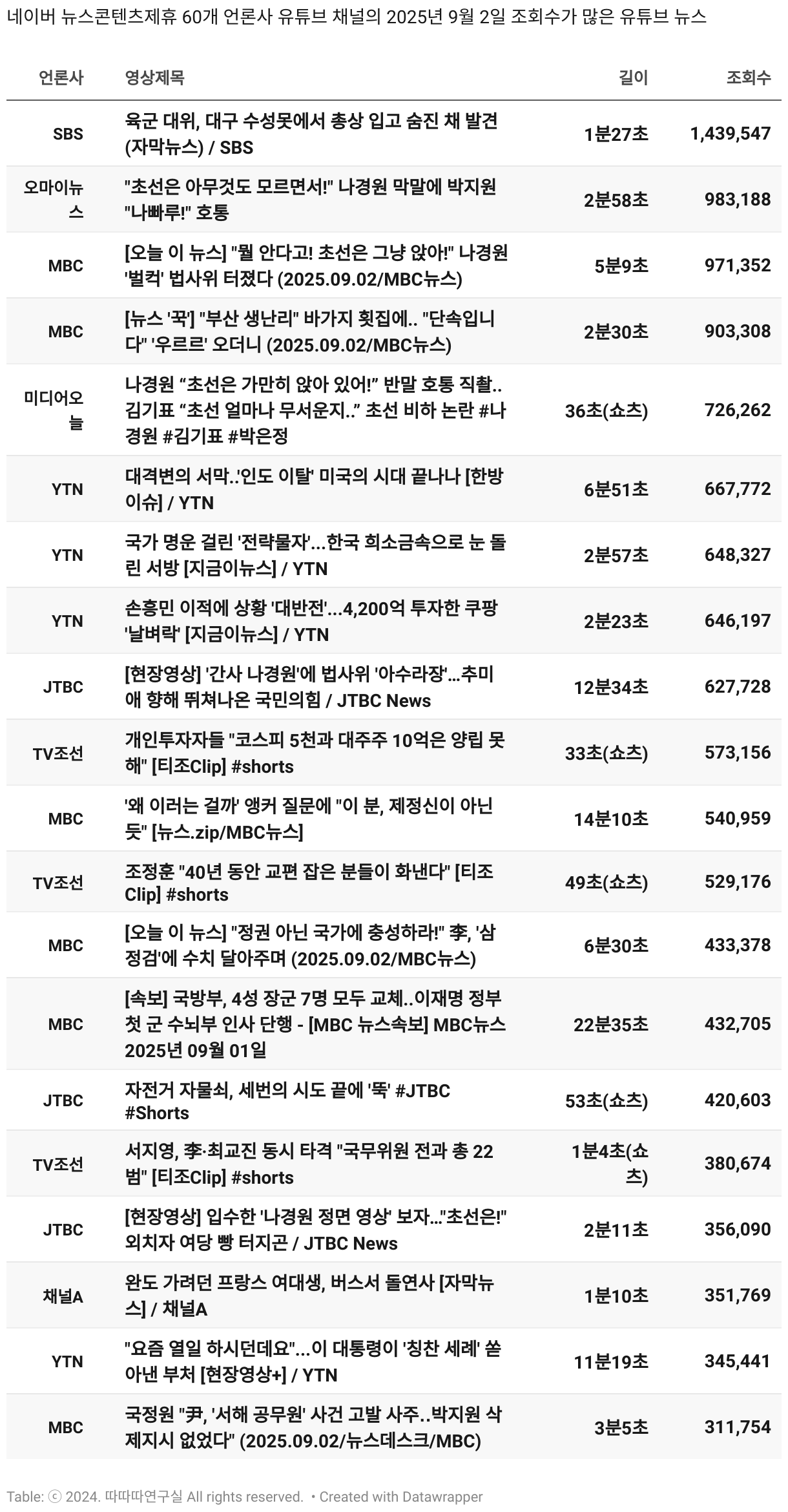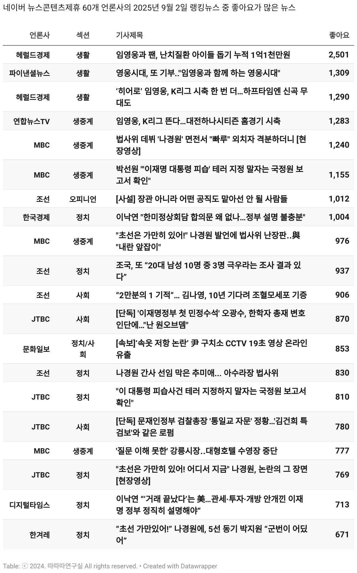 *데이터 수집 기간 : 2024년 6월 10일 *데이터 수집 대상 : 네이버 뉴스콘텐츠제휴 60개 언론사. 종합일간지 10개(경향신문, 국민일보, 동아일보, 문화일보, 서울신문, 세계일보, 조선일보, 중앙일보, 한겨레신문, 한국일보), 방송/통신사 14개(뉴스1, 뉴시스, 연합뉴스, 연합뉴스TV, 채널A, 한국경제TV, JTBC, KBS, MBC, MBN, SBS, SBS BIZ, TV조선, YTN), 경제지 11개(매일경제, 머니투데이, 비즈워치, 서울경제, 아시아경제, 이데일리, 조선비즈, 조세일보, 파이낸셜뉴스, 한국경제(유튜브제외), 헤럴드경제) 인터넷 8개(노컷뉴스, 더팩트, 데일리안, 머니S, 미디어오늘, 아이뉴스24, 오마이뉴스, 프레시안), IT 5개(디지털데일리,디지털타임스, 블로터, 전자신문, 지디넷코리아), 지역 12개(강원도민일보, 강원일보, 경기일보, 국제신문, 대구MBC, 대전일보, 매일신문, 부산일보, 전주MBC, CJB청주방송, JIBS, kbc광주방송)