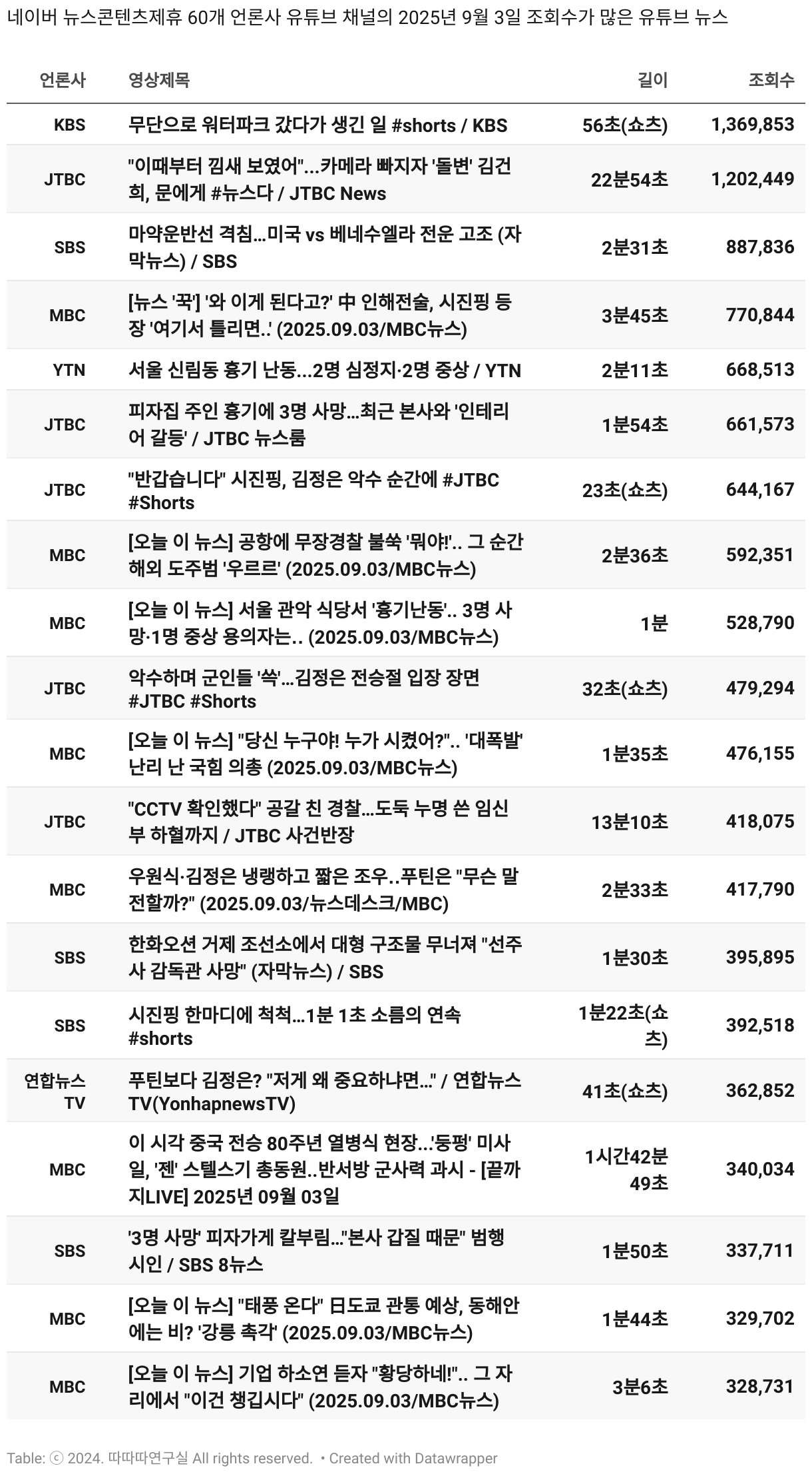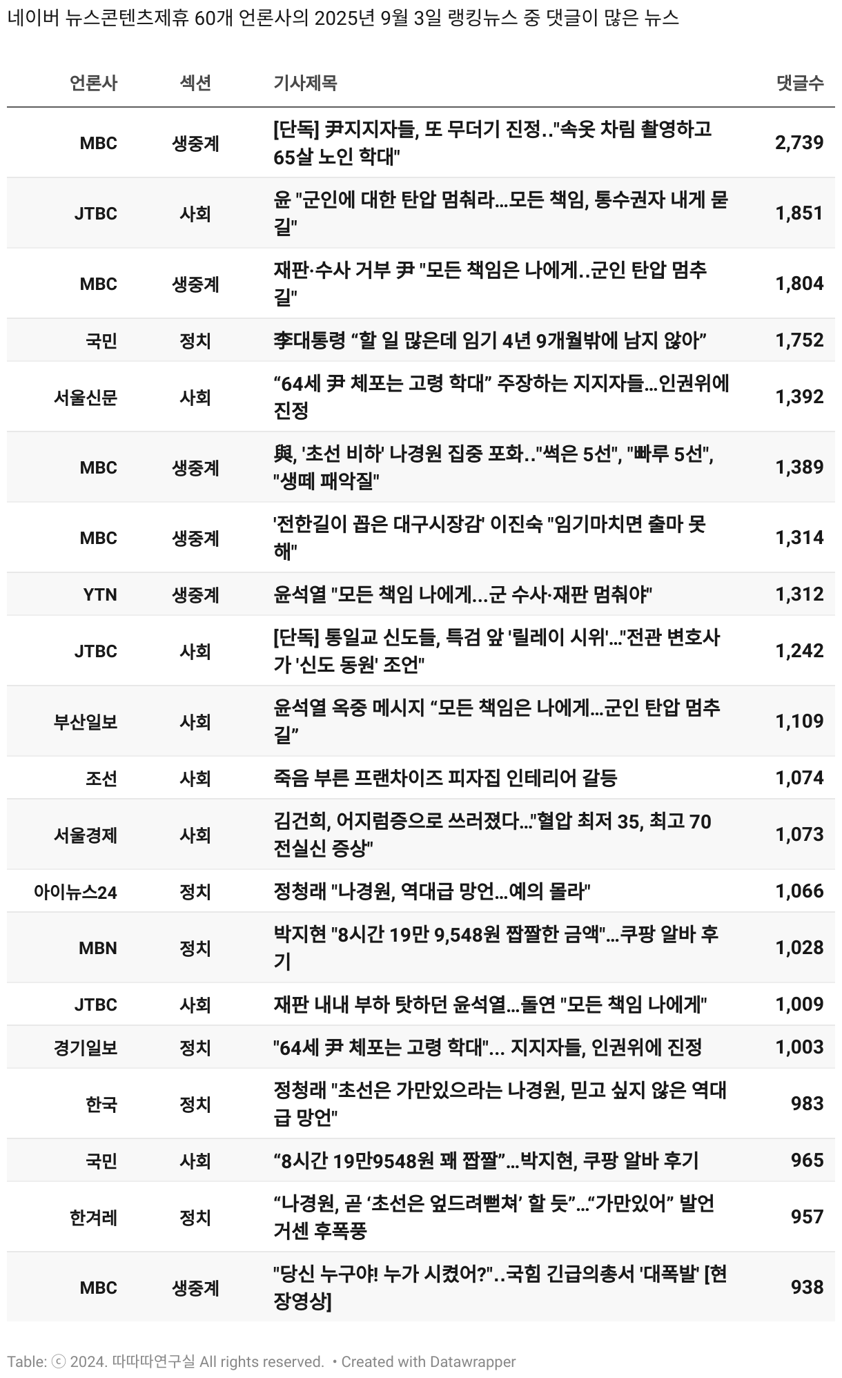 *데이터 수집 기간 : 2024년 6월 10일 *데이터 수집 대상 : 네이버 뉴스콘텐츠제휴 60개 언론사. 종합일간지 10개(경향신문, 국민일보, 동아일보, 문화일보, 서울신문, 세계일보, 조선일보, 중앙일보, 한겨레신문, 한국일보), 방송/통신사 14개(뉴스1, 뉴시스, 연합뉴스, 연합뉴스TV, 채널A, 한국경제TV, JTBC, KBS, MBC, MBN, SBS, SBS BIZ, TV조선, YTN), 경제지 11개(매일경제, 머니투데이, 비즈워치, 서울경제, 아시아경제, 이데일리, 조선비즈, 조세일보, 파이낸셜뉴스, 한국경제(유튜브제외), 헤럴드경제) 인터넷 8개(노컷뉴스, 더팩트, 데일리안, 머니S, 미디어오늘, 아이뉴스24, 오마이뉴스, 프레시안), IT 5개(디지털데일리,디지털타임스, 블로터, 전자신문, 지디넷코리아), 지역 12개(강원도민일보, 강원일보, 경기일보, 국제신문, 대구MBC, 대전일보, 매일신문, 부산일보, 전주MBC, CJB청주방송, JIBS, kbc광주방송)