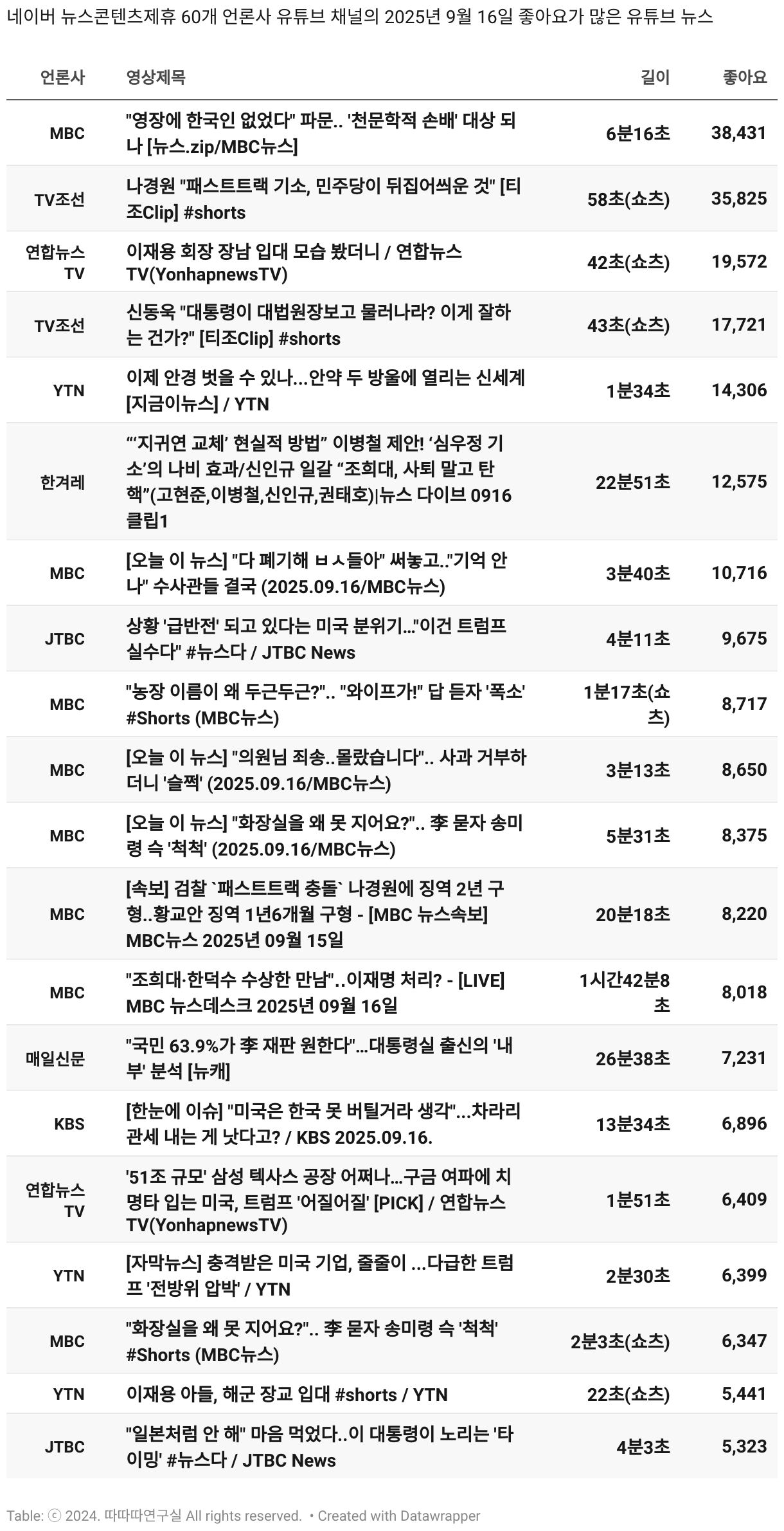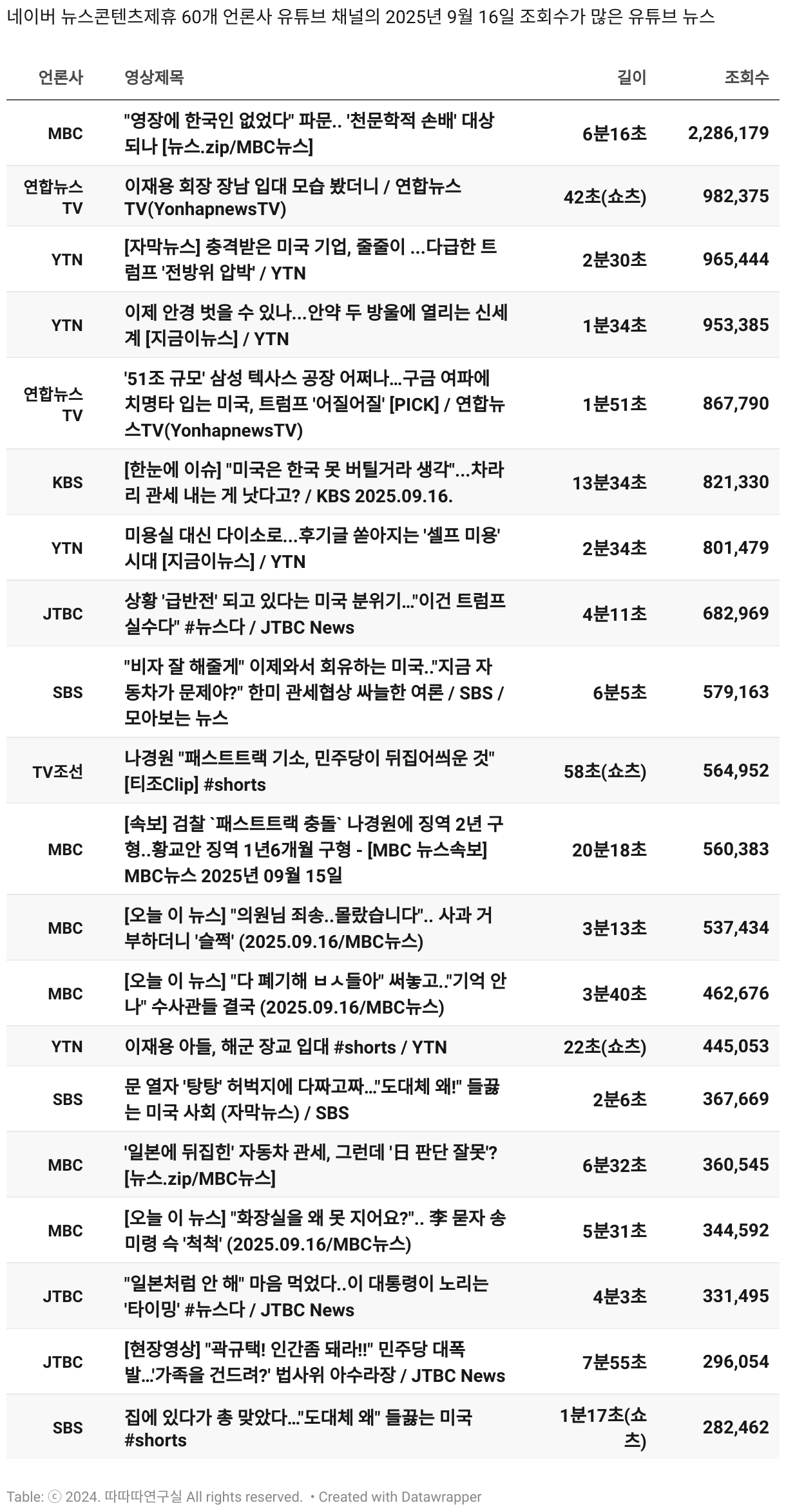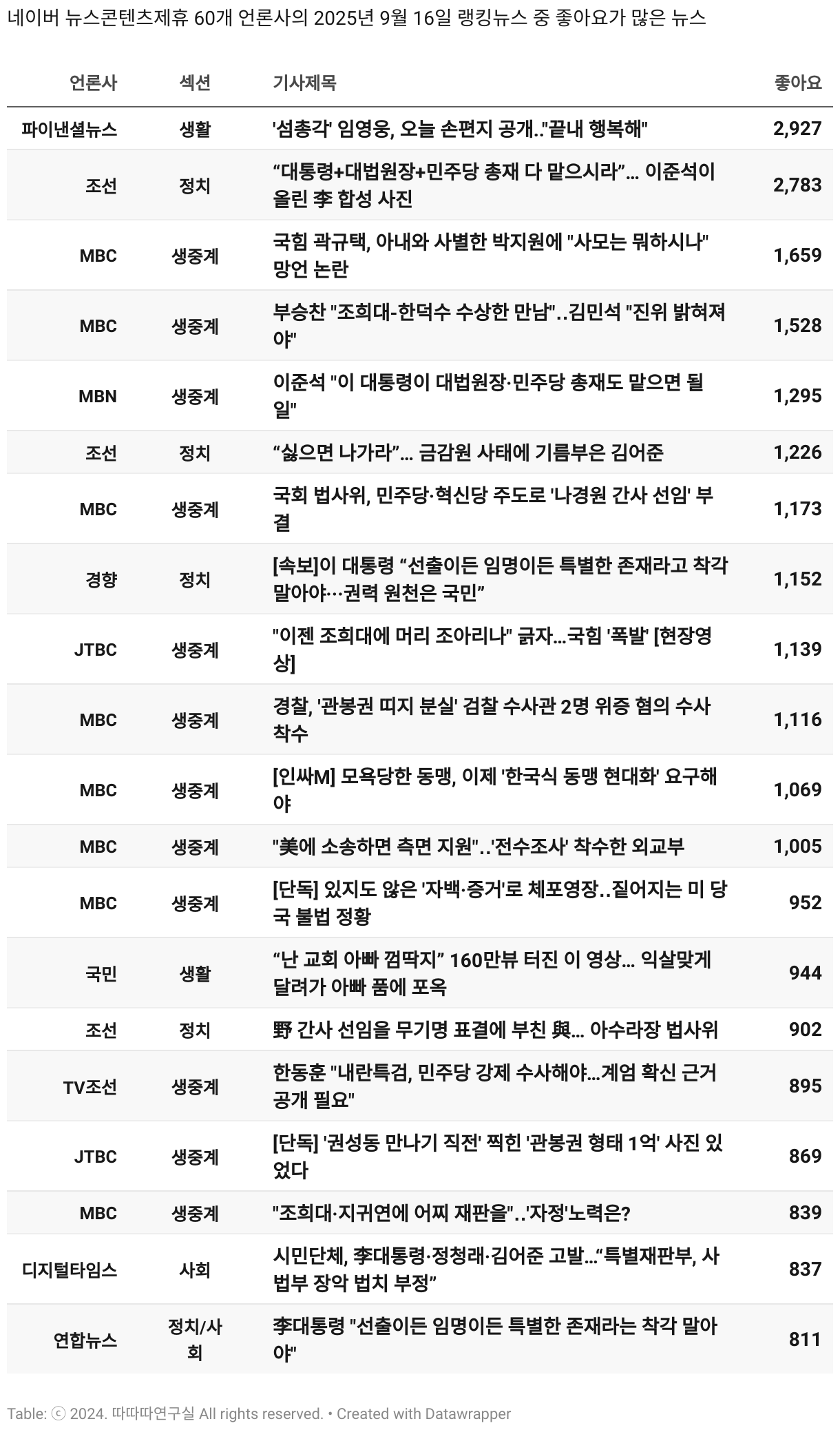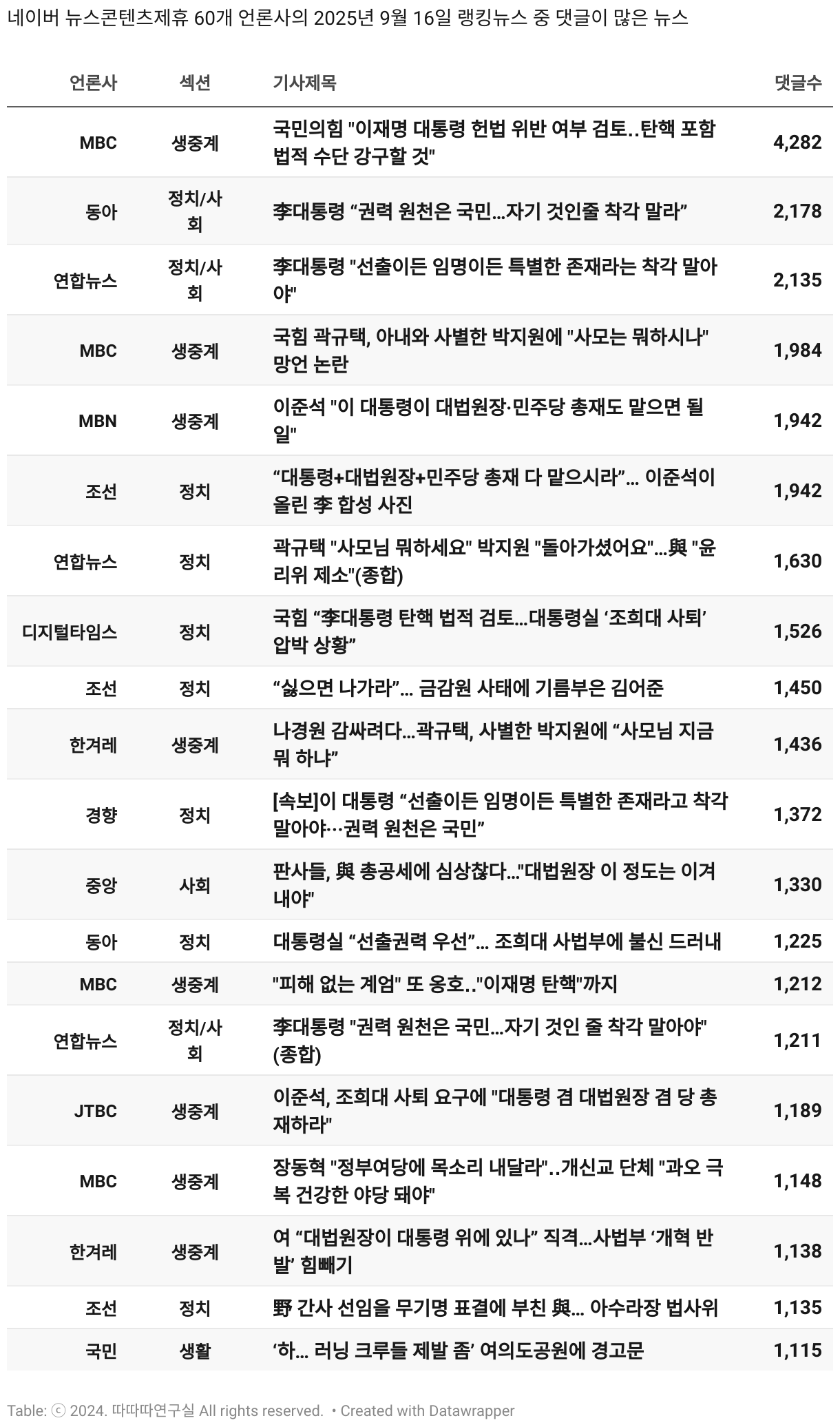*데이터 수집 기간 : 2024년 6월 10일 *데이터 수집 대상 : 네이버 뉴스콘텐츠제휴 60개 언론사. 종합일간지 10개(경향신문, 국민일보, 동아일보, 문화일보, 서울신문, 세계일보, 조선일보, 중앙일보, 한겨레신문, 한국일보), 방송/통신사 14개(뉴스1, 뉴시스, 연합뉴스, 연합뉴스TV, 채널A, 한국경제TV, JTBC, KBS, MBC, MBN, SBS, SBS BIZ, TV조선, YTN), 경제지 11개(매일경제, 머니투데이, 비즈워치, 서울경제, 아시아경제, 이데일리, 조선비즈, 조세일보, 파이낸셜뉴스, 한국경제(유튜브제외), 헤럴드경제) 인터넷 8개(노컷뉴스, 더팩트, 데일리안, 머니S, 미디어오늘, 아이뉴스24, 오마이뉴스, 프레시안), IT 5개(디지털데일리,디지털타임스, 블로터, 전자신문, 지디넷코리아), 지역 12개(강원도민일보, 강원일보, 경기일보, 국제신문, 대구MBC, 대전일보, 매일신문, 부산일보, 전주MBC, CJB청주방송, JIBS, kbc광주방송)