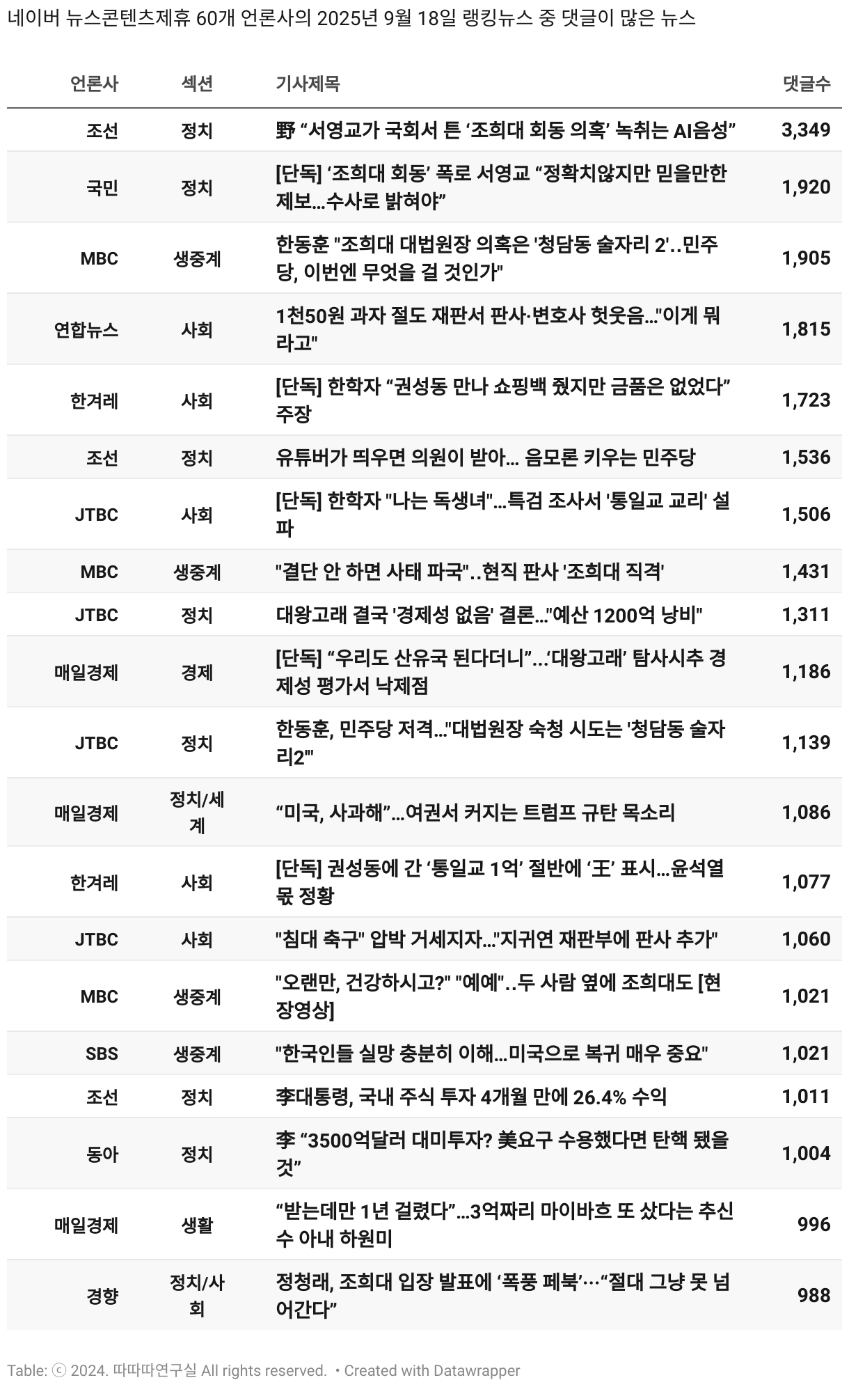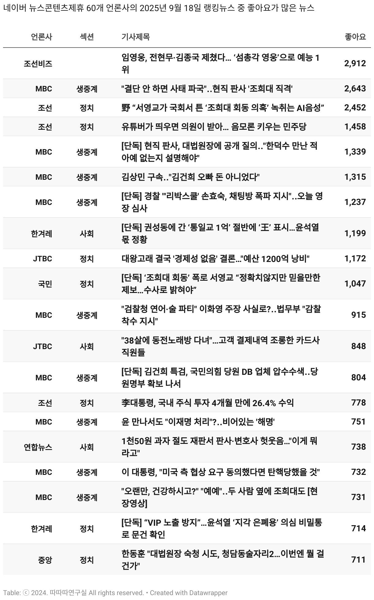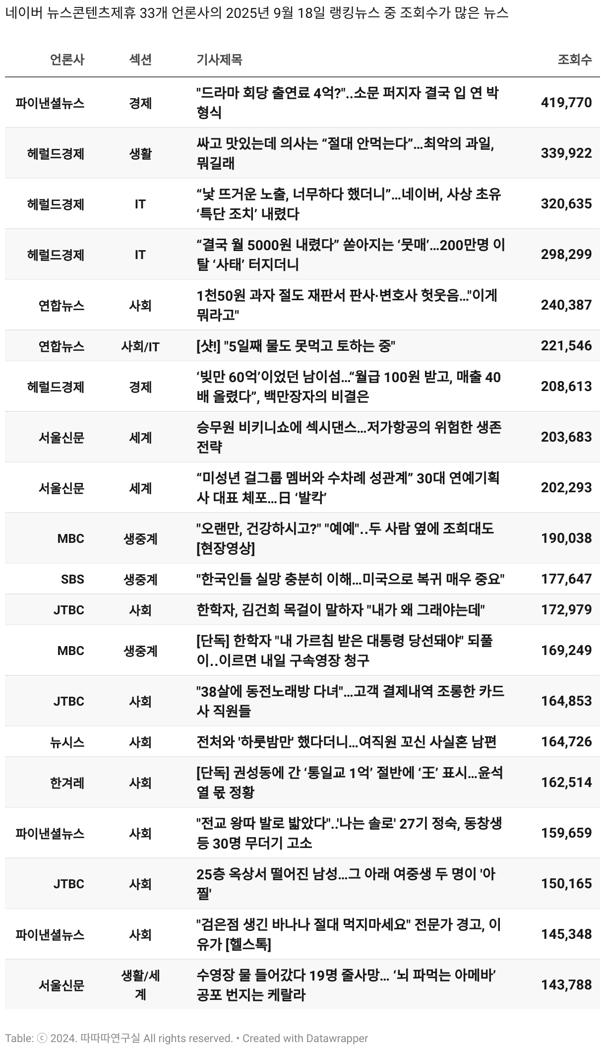 *데이터 수집 기간 : 2024년 6월 10일 *데이터 수집 대상 : 네이버 뉴스콘텐츠제휴 60개 언론사. 종합일간지 10개(경향신문, 국민일보, 동아일보, 문화일보, 서울신문, 세계일보, 조선일보, 중앙일보, 한겨레신문, 한국일보), 방송/통신사 14개(뉴스1, 뉴시스, 연합뉴스, 연합뉴스TV, 채널A, 한국경제TV, JTBC, KBS, MBC, MBN, SBS, SBS BIZ, TV조선, YTN), 경제지 11개(매일경제, 머니투데이, 비즈워치, 서울경제, 아시아경제, 이데일리, 조선비즈, 조세일보, 파이낸셜뉴스, 한국경제(유튜브제외), 헤럴드경제) 인터넷 8개(노컷뉴스, 더팩트, 데일리안, 머니S, 미디어오늘, 아이뉴스24, 오마이뉴스, 프레시안), IT 5개(디지털데일리,디지털타임스, 블로터, 전자신문, 지디넷코리아), 지역 12개(강원도민일보, 강원일보, 경기일보, 국제신문, 대구MBC, 대전일보, 매일신문, 부산일보, 전주MBC, CJB청주방송, JIBS, kbc광주방송)