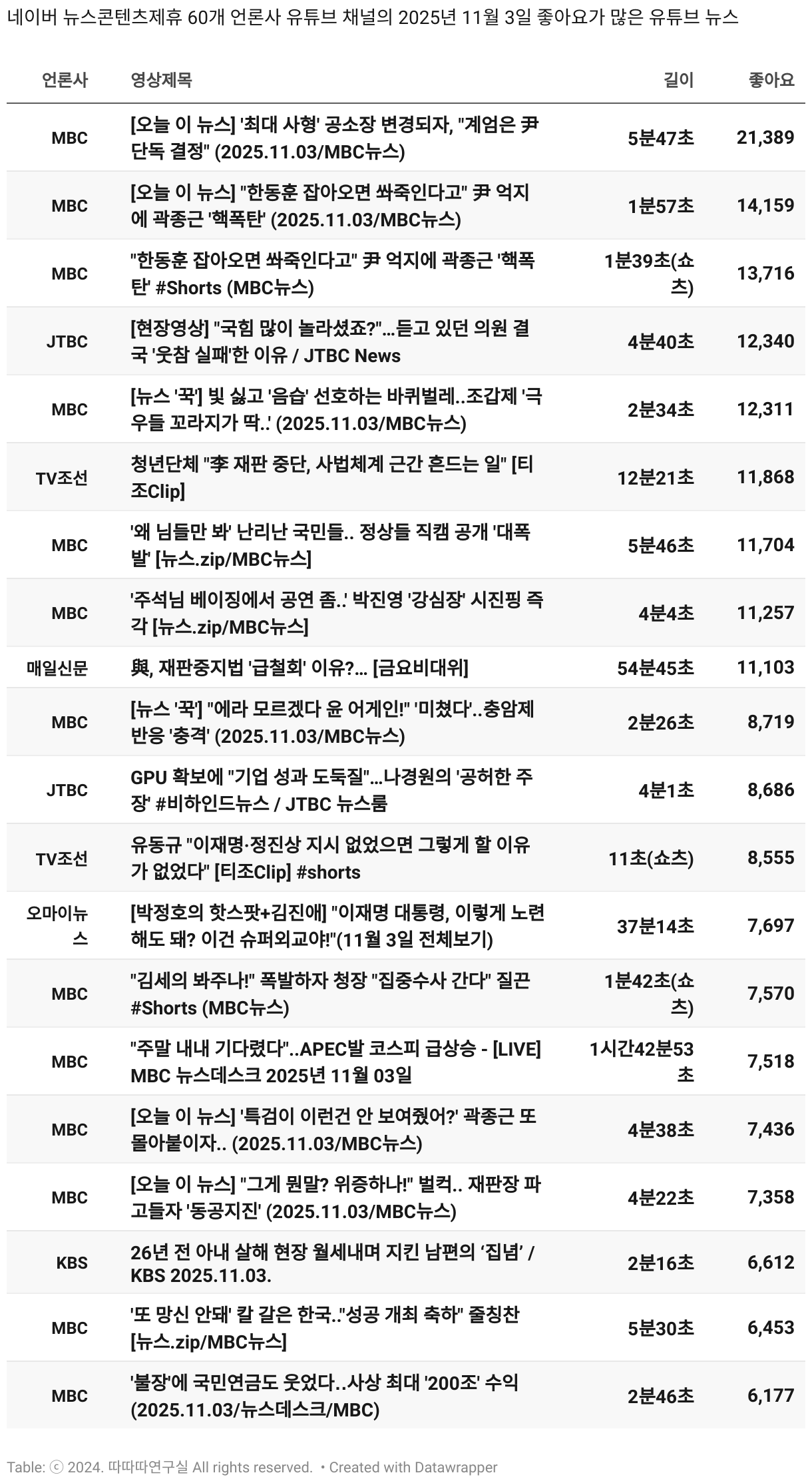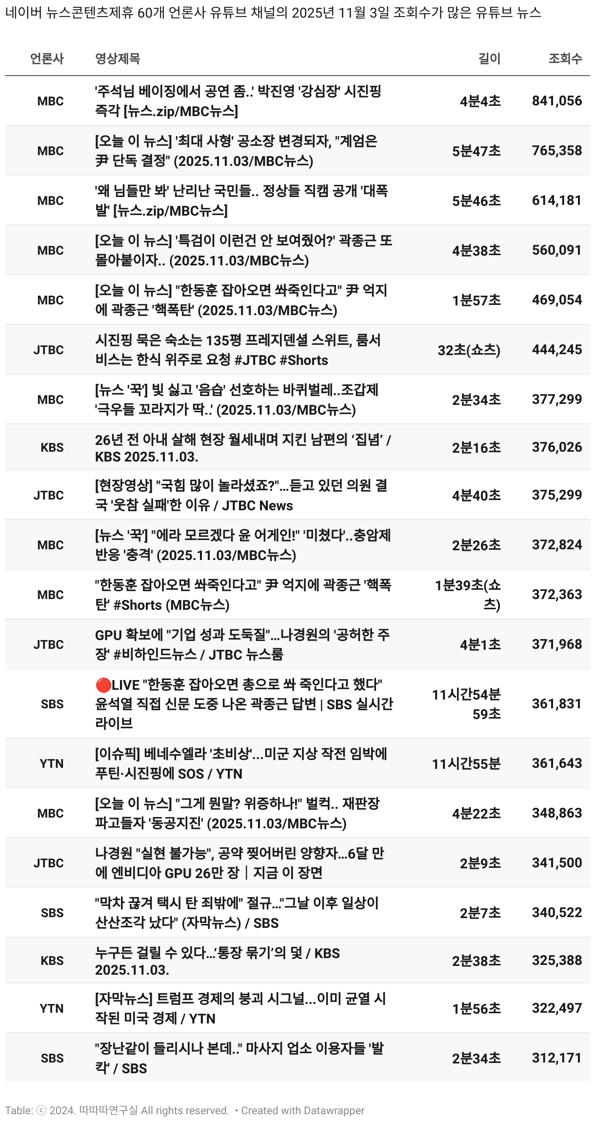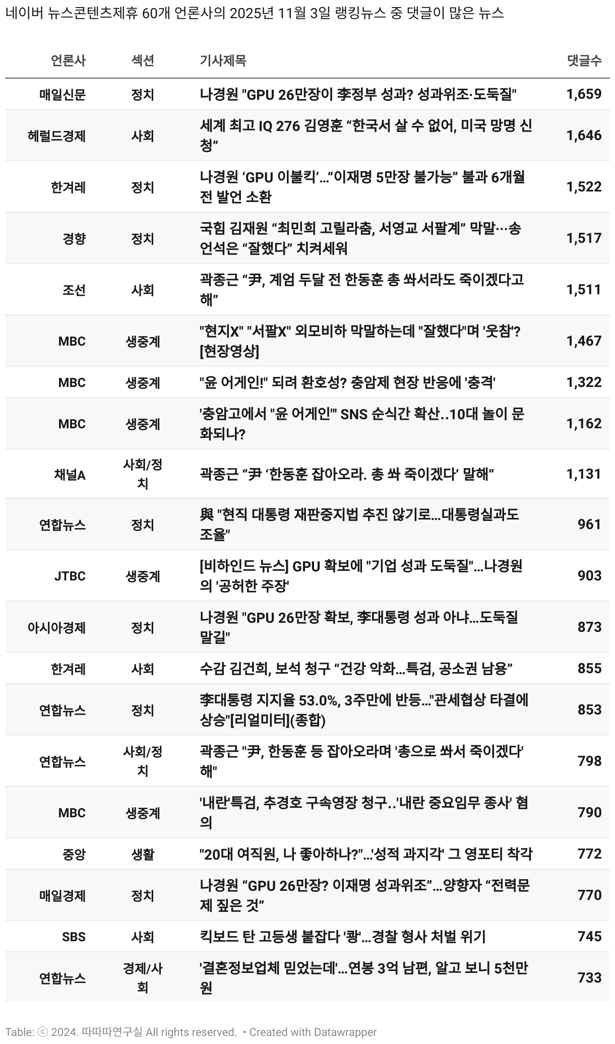 *데이터 수집 기간 : 2024년 6월 10일 *데이터 수집 대상 : 네이버 뉴스콘텐츠제휴 60개 언론사. 종합일간지 10개(경향신문, 국민일보, 동아일보, 문화일보, 서울신문, 세계일보, 조선일보, 중앙일보, 한겨레신문, 한국일보), 방송/통신사 14개(뉴스1, 뉴시스, 연합뉴스, 연합뉴스TV, 채널A, 한국경제TV, JTBC, KBS, MBC, MBN, SBS, SBS BIZ, TV조선, YTN), 경제지 11개(매일경제, 머니투데이, 비즈워치, 서울경제, 아시아경제, 이데일리, 조선비즈, 조세일보, 파이낸셜뉴스, 한국경제(유튜브제외), 헤럴드경제) 인터넷 8개(노컷뉴스, 더팩트, 데일리안, 머니S, 미디어오늘, 아이뉴스24, 오마이뉴스, 프레시안), IT 5개(디지털데일리,디지털타임스, 블로터, 전자신문, 지디넷코리아), 지역 12개(강원도민일보, 강원일보, 경기일보, 국제신문, 대구MBC, 대전일보, 매일신문, 부산일보, 전주MBC, CJB청주방송, JIBS, kbc광주방송)