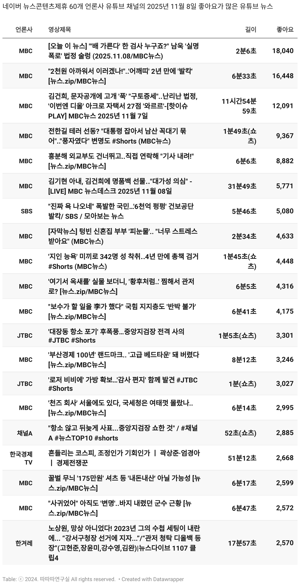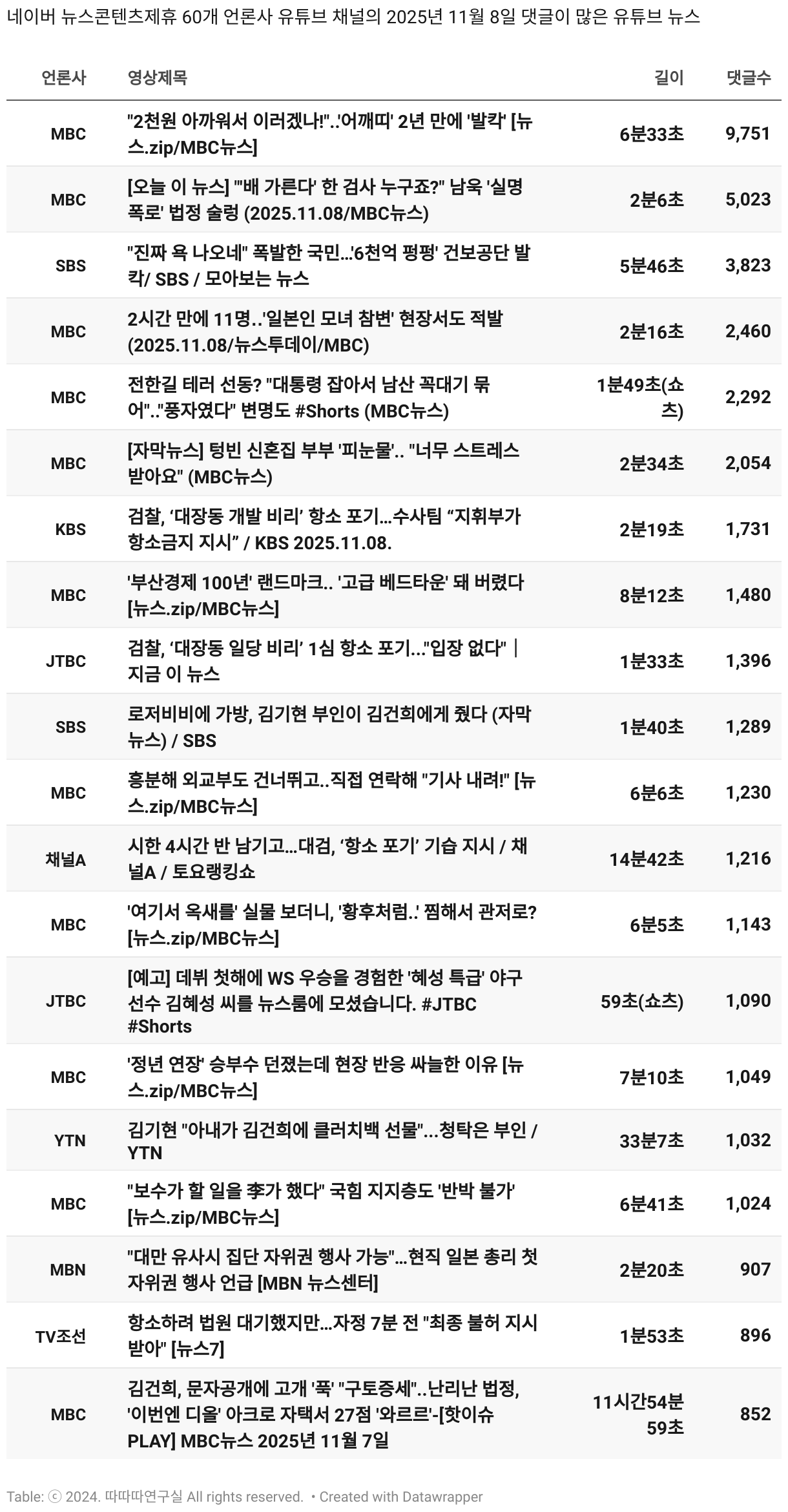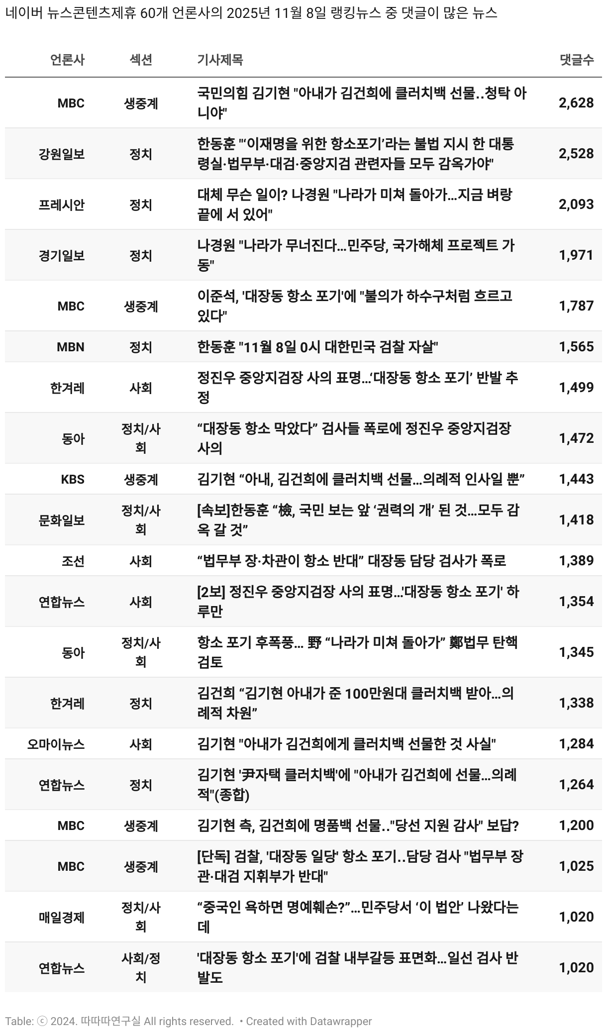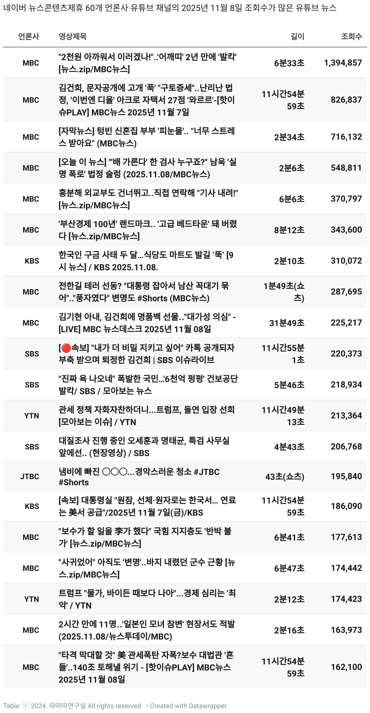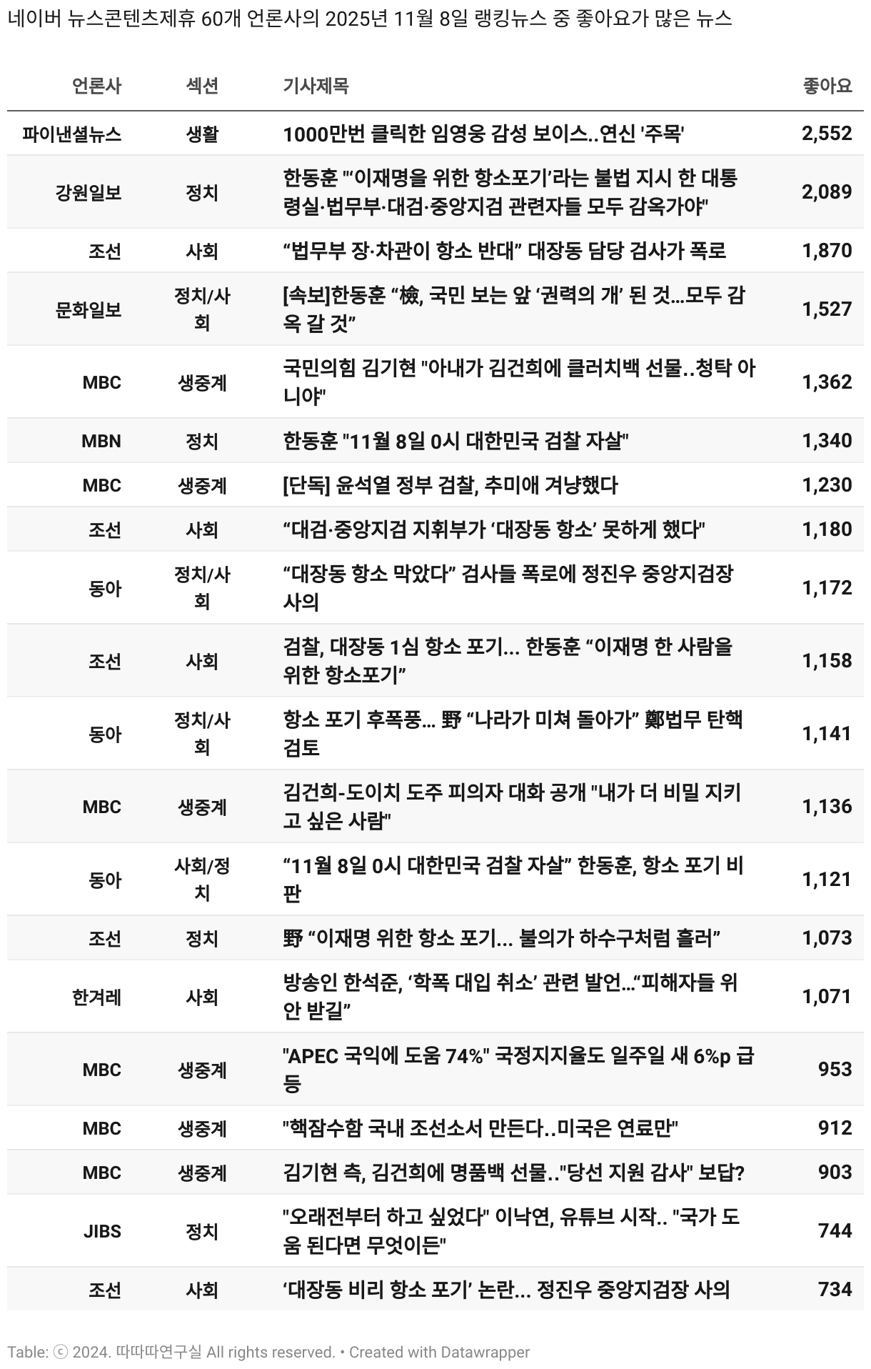 *데이터 수집 기간 : 2024년 6월 10일 *데이터 수집 대상 : 네이버 뉴스콘텐츠제휴 60개 언론사. 종합일간지 10개(경향신문, 국민일보, 동아일보, 문화일보, 서울신문, 세계일보, 조선일보, 중앙일보, 한겨레신문, 한국일보), 방송/통신사 14개(뉴스1, 뉴시스, 연합뉴스, 연합뉴스TV, 채널A, 한국경제TV, JTBC, KBS, MBC, MBN, SBS, SBS BIZ, TV조선, YTN), 경제지 11개(매일경제, 머니투데이, 비즈워치, 서울경제, 아시아경제, 이데일리, 조선비즈, 조세일보, 파이낸셜뉴스, 한국경제(유튜브제외), 헤럴드경제) 인터넷 8개(노컷뉴스, 더팩트, 데일리안, 머니S, 미디어오늘, 아이뉴스24, 오마이뉴스, 프레시안), IT 5개(디지털데일리,디지털타임스, 블로터, 전자신문, 지디넷코리아), 지역 12개(강원도민일보, 강원일보, 경기일보, 국제신문, 대구MBC, 대전일보, 매일신문, 부산일보, 전주MBC, CJB청주방송, JIBS, kbc광주방송)