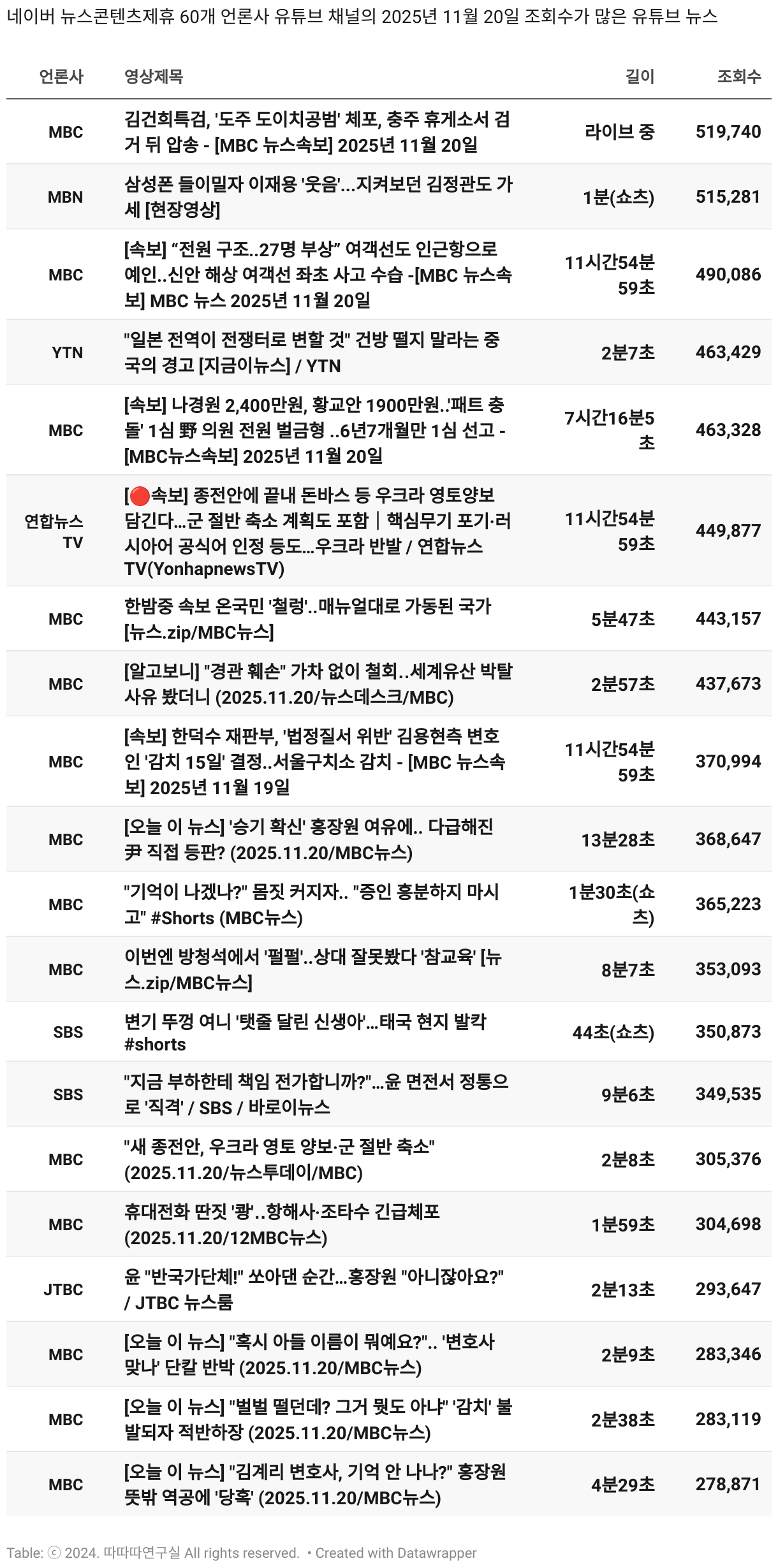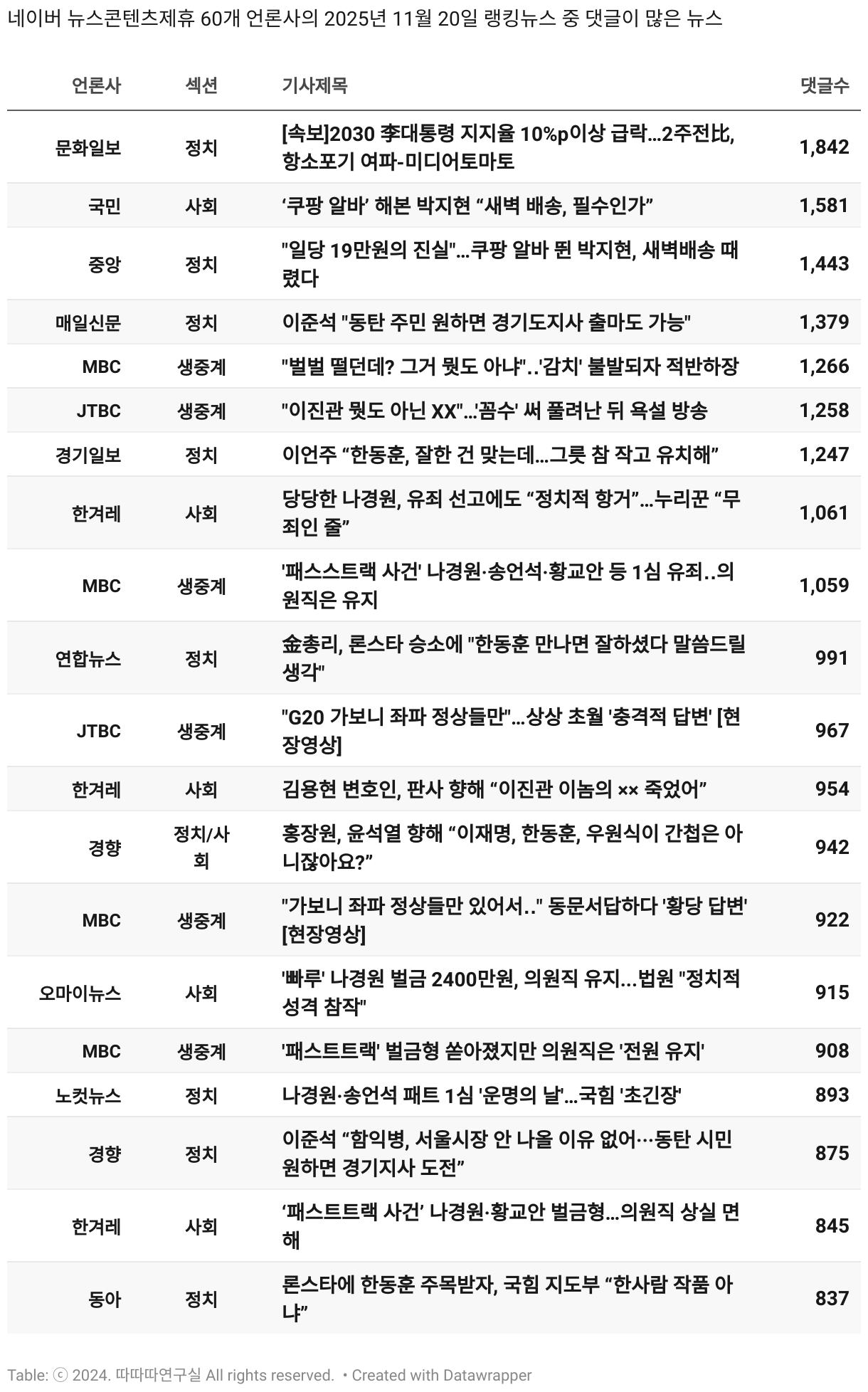 *데이터 수집 기간 : 2024년 6월 10일 *데이터 수집 대상 : 네이버 뉴스콘텐츠제휴 60개 언론사. 종합일간지 10개(경향신문, 국민일보, 동아일보, 문화일보, 서울신문, 세계일보, 조선일보, 중앙일보, 한겨레신문, 한국일보), 방송/통신사 14개(뉴스1, 뉴시스, 연합뉴스, 연합뉴스TV, 채널A, 한국경제TV, JTBC, KBS, MBC, MBN, SBS, SBS BIZ, TV조선, YTN), 경제지 11개(매일경제, 머니투데이, 비즈워치, 서울경제, 아시아경제, 이데일리, 조선비즈, 조세일보, 파이낸셜뉴스, 한국경제(유튜브제외), 헤럴드경제) 인터넷 8개(노컷뉴스, 더팩트, 데일리안, 머니S, 미디어오늘, 아이뉴스24, 오마이뉴스, 프레시안), IT 5개(디지털데일리,디지털타임스, 블로터, 전자신문, 지디넷코리아), 지역 12개(강원도민일보, 강원일보, 경기일보, 국제신문, 대구MBC, 대전일보, 매일신문, 부산일보, 전주MBC, CJB청주방송, JIBS, kbc광주방송)