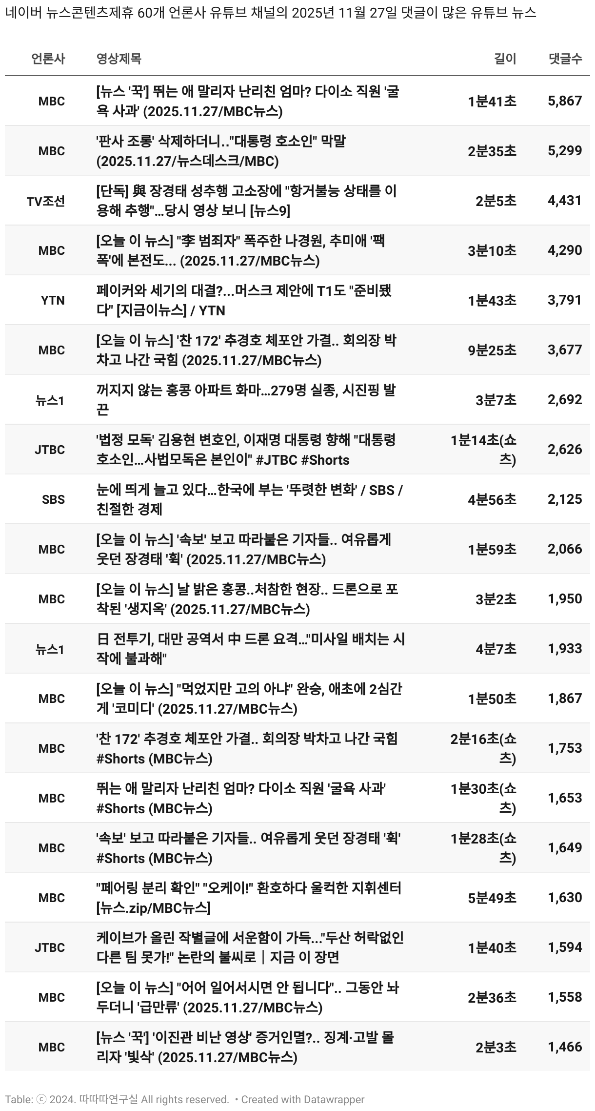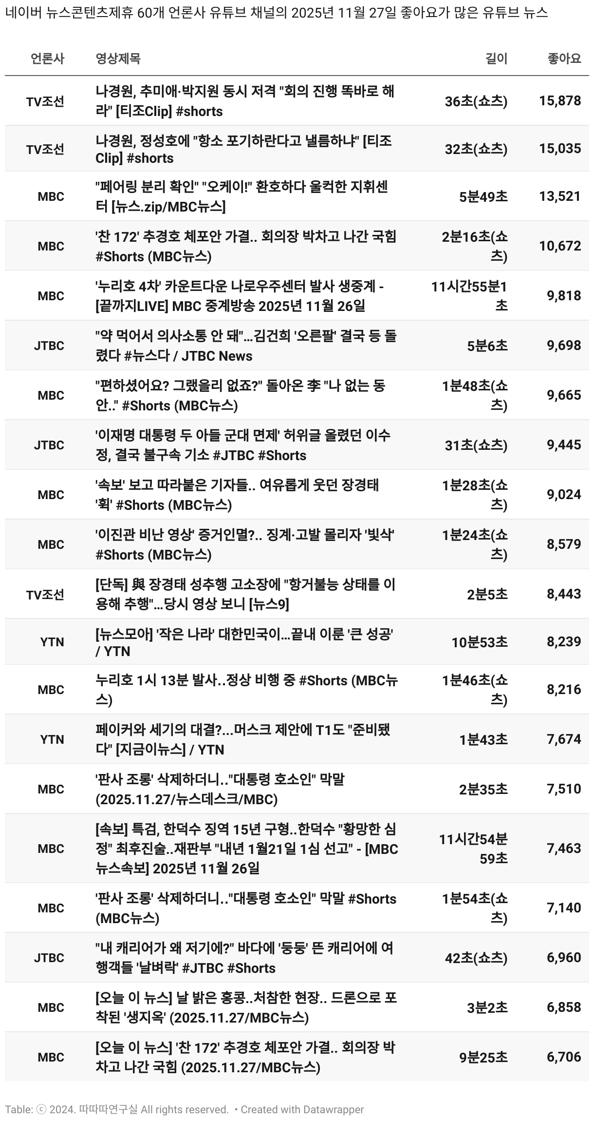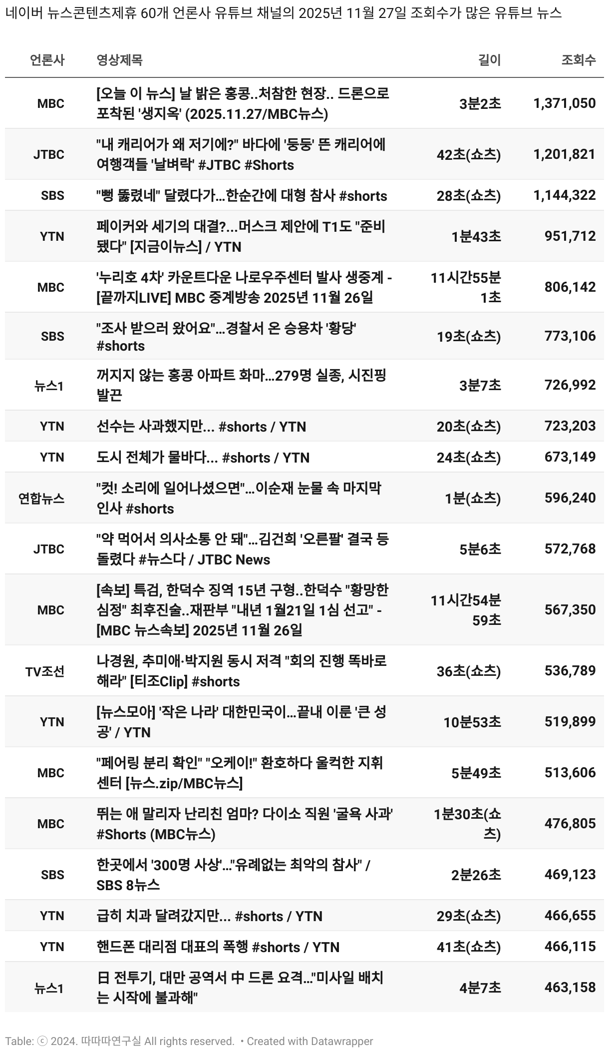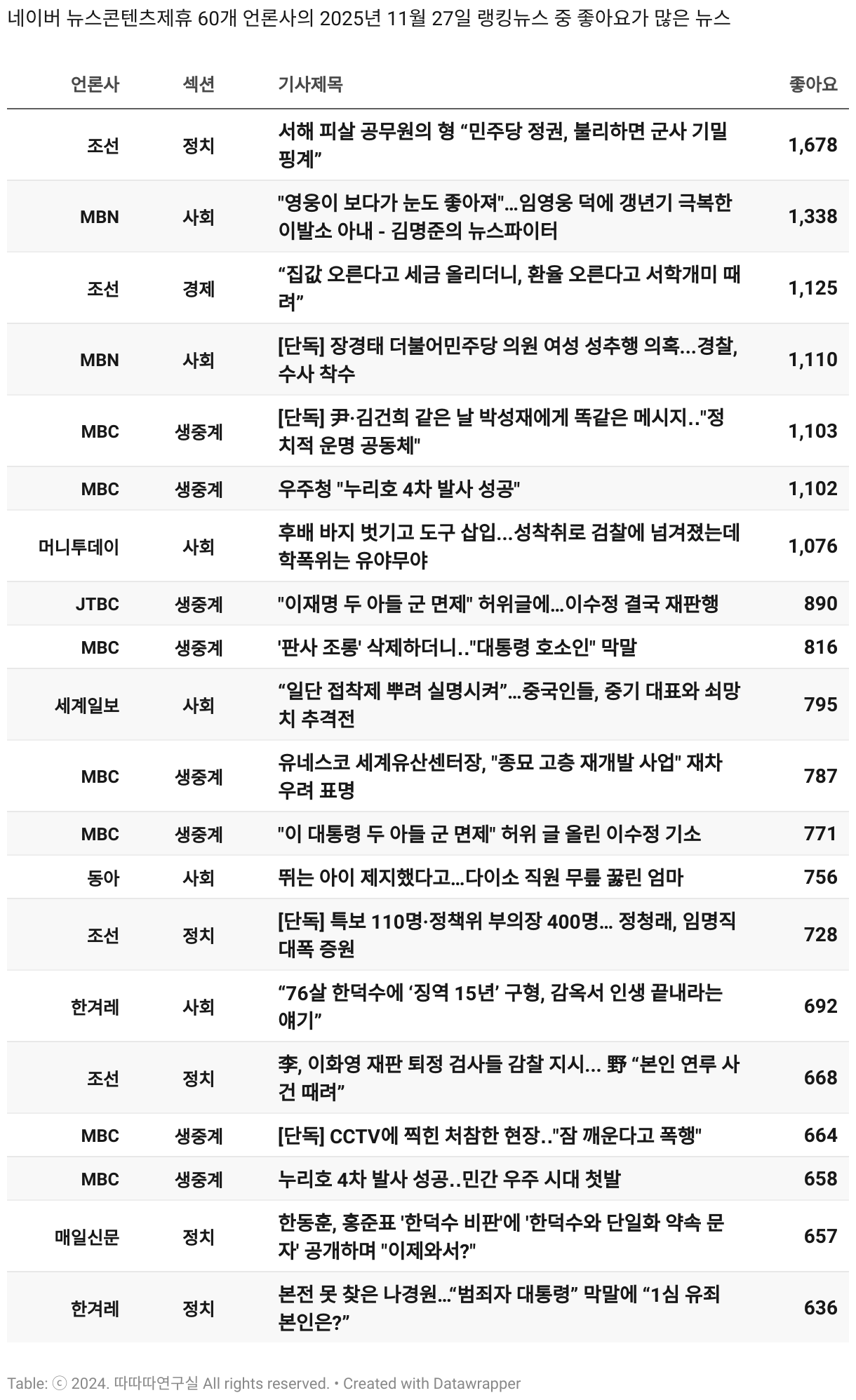 *데이터 수집 기간 : 2024년 6월 10일 *데이터 수집 대상 : 네이버 뉴스콘텐츠제휴 60개 언론사. 종합일간지 10개(경향신문, 국민일보, 동아일보, 문화일보, 서울신문, 세계일보, 조선일보, 중앙일보, 한겨레신문, 한국일보), 방송/통신사 14개(뉴스1, 뉴시스, 연합뉴스, 연합뉴스TV, 채널A, 한국경제TV, JTBC, KBS, MBC, MBN, SBS, SBS BIZ, TV조선, YTN), 경제지 11개(매일경제, 머니투데이, 비즈워치, 서울경제, 아시아경제, 이데일리, 조선비즈, 조세일보, 파이낸셜뉴스, 한국경제(유튜브제외), 헤럴드경제) 인터넷 8개(노컷뉴스, 더팩트, 데일리안, 머니S, 미디어오늘, 아이뉴스24, 오마이뉴스, 프레시안), IT 5개(디지털데일리,디지털타임스, 블로터, 전자신문, 지디넷코리아), 지역 12개(강원도민일보, 강원일보, 경기일보, 국제신문, 대구MBC, 대전일보, 매일신문, 부산일보, 전주MBC, CJB청주방송, JIBS, kbc광주방송)