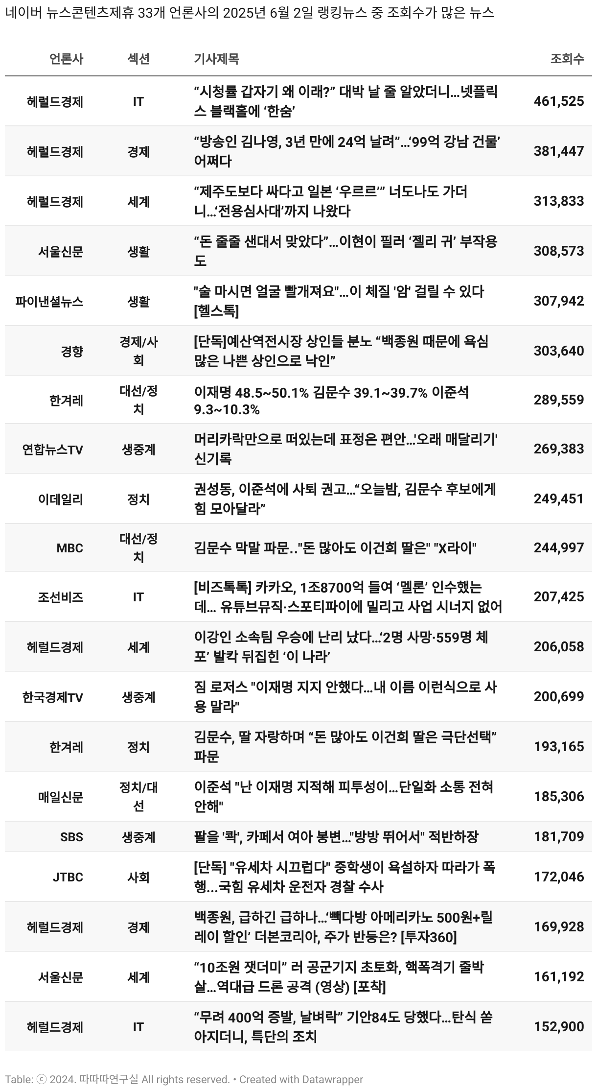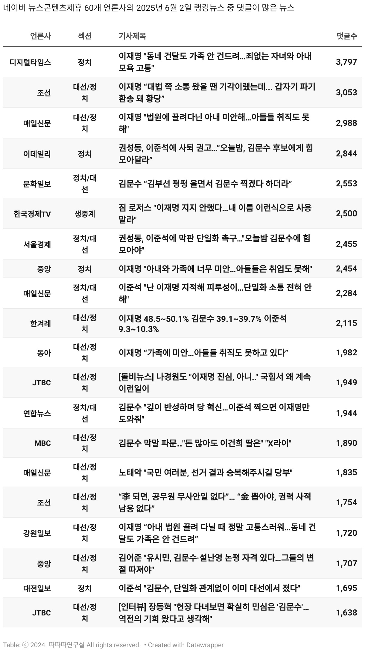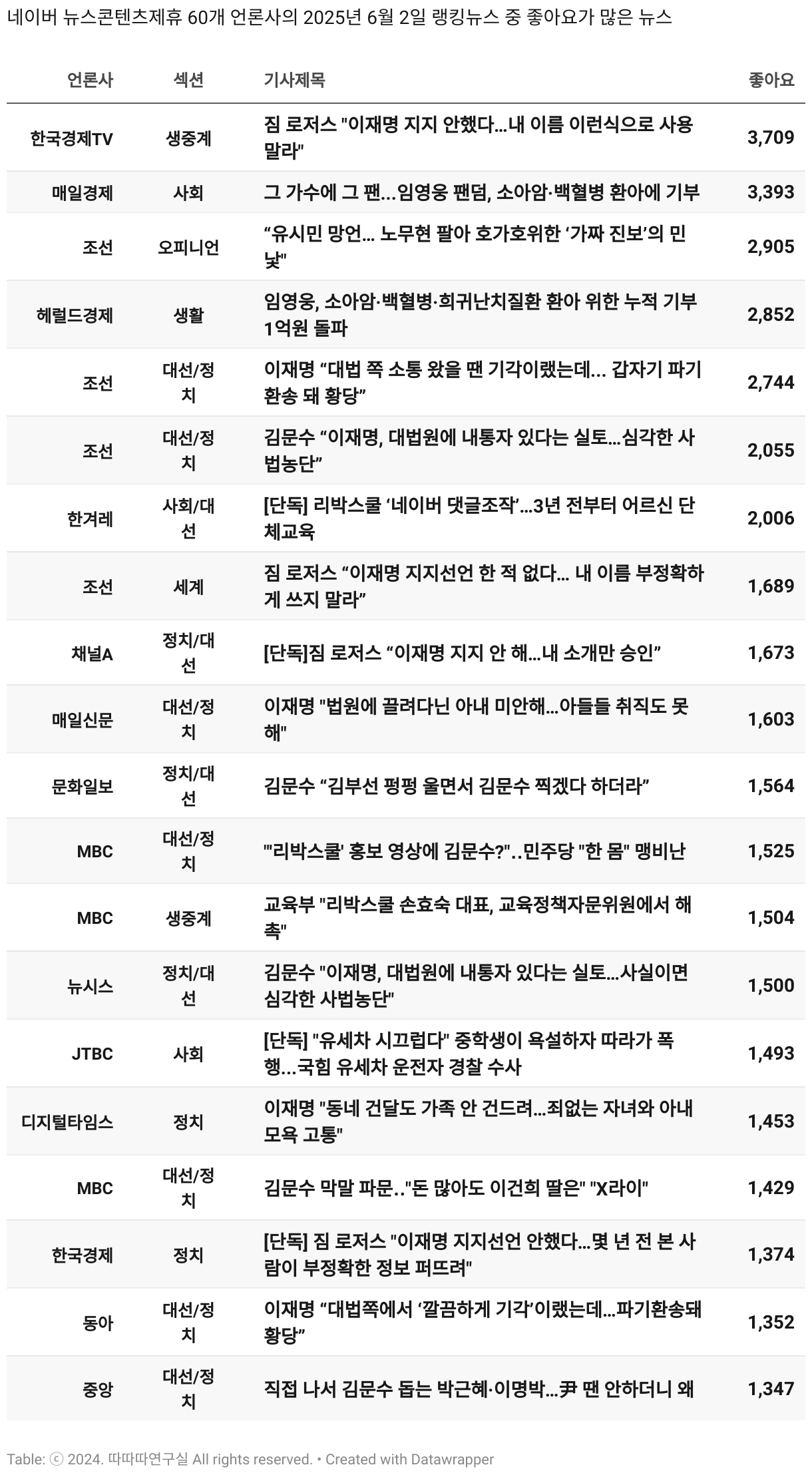 *데이터 수집 기간 : 2024년 6월 10일 *데이터 수집 대상 : 네이버 뉴스콘텐츠제휴 60개 언론사. 종합일간지 10개(경향신문, 국민일보, 동아일보, 문화일보, 서울신문, 세계일보, 조선일보, 중앙일보, 한겨레신문, 한국일보), 방송/통신사 14개(뉴스1, 뉴시스, 연합뉴스, 연합뉴스TV, 채널A, 한국경제TV, JTBC, KBS, MBC, MBN, SBS, SBS BIZ, TV조선, YTN), 경제지 11개(매일경제, 머니투데이, 비즈워치, 서울경제, 아시아경제, 이데일리, 조선비즈, 조세일보, 파이낸셜뉴스, 한국경제(유튜브제외), 헤럴드경제) 인터넷 8개(노컷뉴스, 더팩트, 데일리안, 머니S, 미디어오늘, 아이뉴스24, 오마이뉴스, 프레시안), IT 5개(디지털데일리,디지털타임스, 블로터, 전자신문, 지디넷코리아), 지역 12개(강원도민일보, 강원일보, 경기일보, 국제신문, 대구MBC, 대전일보, 매일신문, 부산일보, 전주MBC, CJB청주방송, JIBS, kbc광주방송)