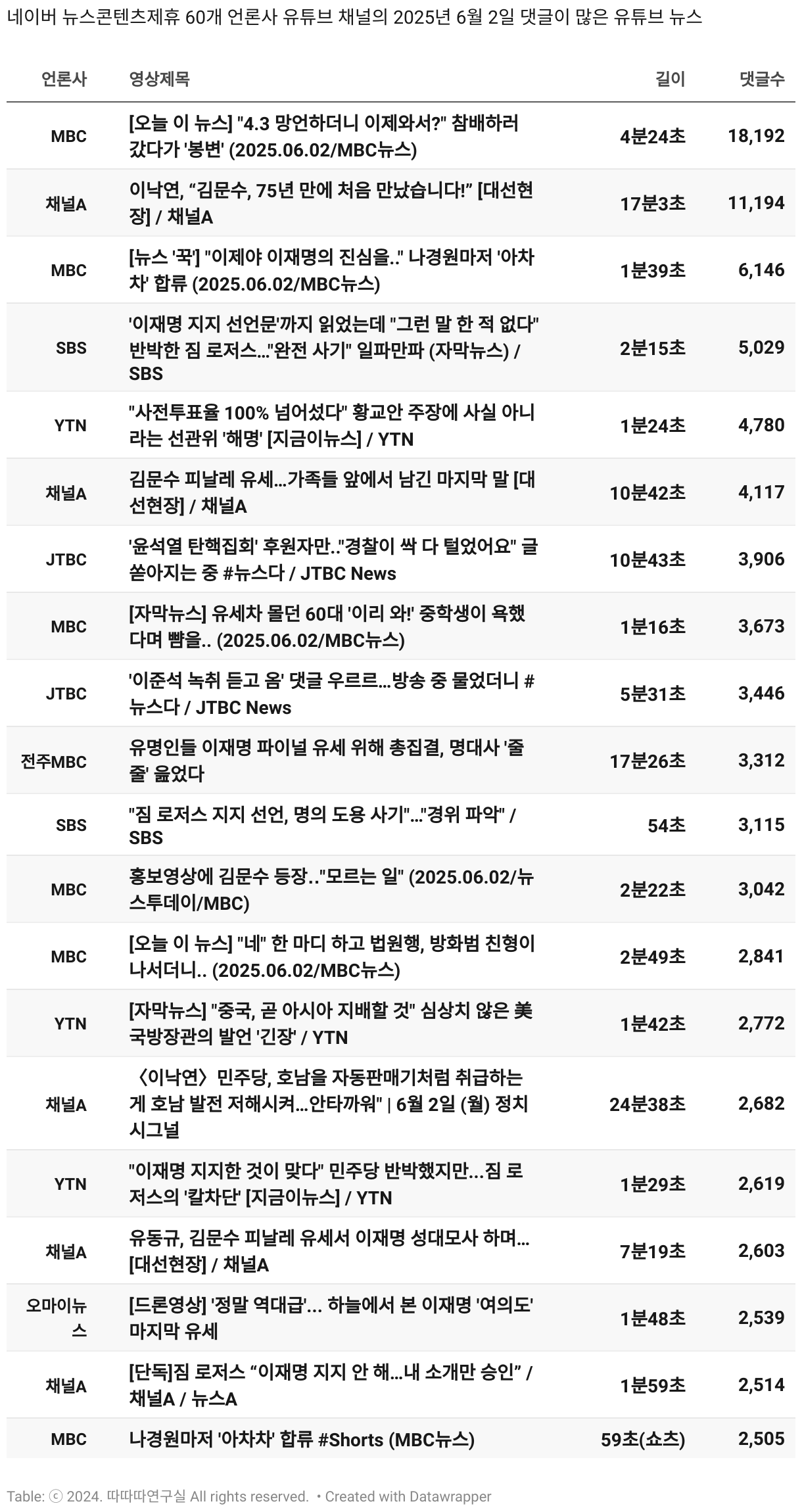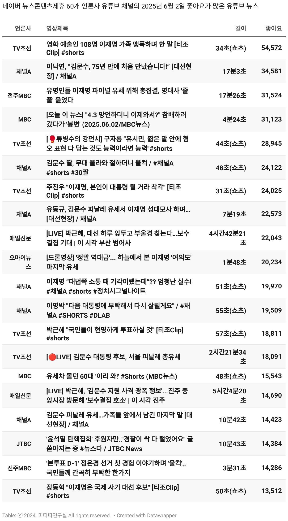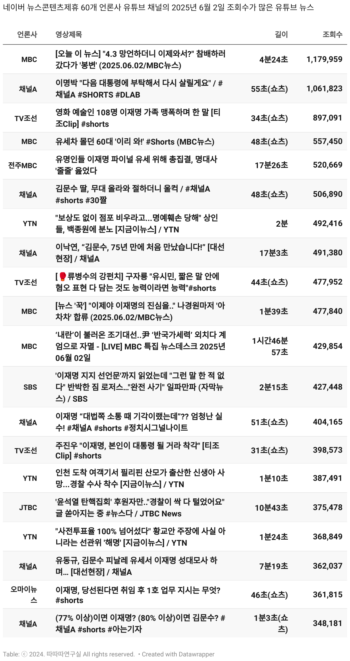 *데이터 수집 기간 : 2024년 6월 10일 *데이터 수집 대상 : 네이버 뉴스콘텐츠제휴 60개 언론사. 종합일간지 10개(경향신문, 국민일보, 동아일보, 문화일보, 서울신문, 세계일보, 조선일보, 중앙일보, 한겨레신문, 한국일보), 방송/통신사 14개(뉴스1, 뉴시스, 연합뉴스, 연합뉴스TV, 채널A, 한국경제TV, JTBC, KBS, MBC, MBN, SBS, SBS BIZ, TV조선, YTN), 경제지 11개(매일경제, 머니투데이, 비즈워치, 서울경제, 아시아경제, 이데일리, 조선비즈, 조세일보, 파이낸셜뉴스, 한국경제(유튜브제외), 헤럴드경제) 인터넷 8개(노컷뉴스, 더팩트, 데일리안, 머니S, 미디어오늘, 아이뉴스24, 오마이뉴스, 프레시안), IT 5개(디지털데일리,디지털타임스, 블로터, 전자신문, 지디넷코리아), 지역 12개(강원도민일보, 강원일보, 경기일보, 국제신문, 대구MBC, 대전일보, 매일신문, 부산일보, 전주MBC, CJB청주방송, JIBS, kbc광주방송)