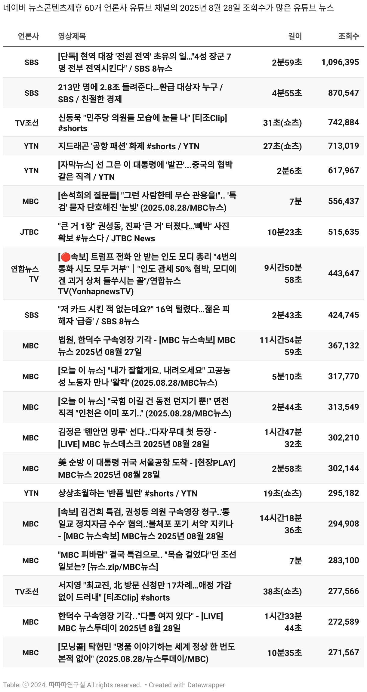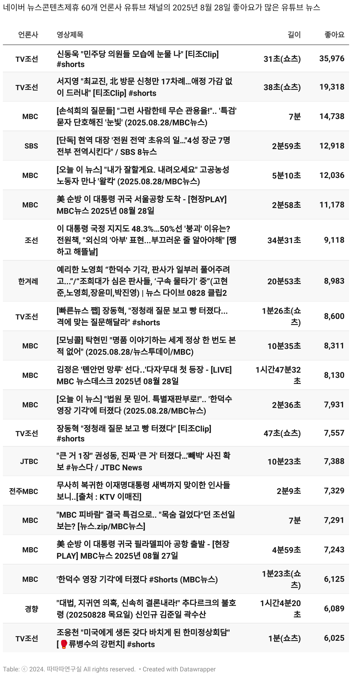 *데이터 수집 기간 : 2024년 6월 10일 *데이터 수집 대상 : 네이버 뉴스콘텐츠제휴 60개 언론사. 종합일간지 10개(경향신문, 국민일보, 동아일보, 문화일보, 서울신문, 세계일보, 조선일보, 중앙일보, 한겨레신문, 한국일보), 방송/통신사 14개(뉴스1, 뉴시스, 연합뉴스, 연합뉴스TV, 채널A, 한국경제TV, JTBC, KBS, MBC, MBN, SBS, SBS BIZ, TV조선, YTN), 경제지 11개(매일경제, 머니투데이, 비즈워치, 서울경제, 아시아경제, 이데일리, 조선비즈, 조세일보, 파이낸셜뉴스, 한국경제(유튜브제외), 헤럴드경제) 인터넷 8개(노컷뉴스, 더팩트, 데일리안, 머니S, 미디어오늘, 아이뉴스24, 오마이뉴스, 프레시안), IT 5개(디지털데일리,디지털타임스, 블로터, 전자신문, 지디넷코리아), 지역 12개(강원도민일보, 강원일보, 경기일보, 국제신문, 대구MBC, 대전일보, 매일신문, 부산일보, 전주MBC, CJB청주방송, JIBS, kbc광주방송)
