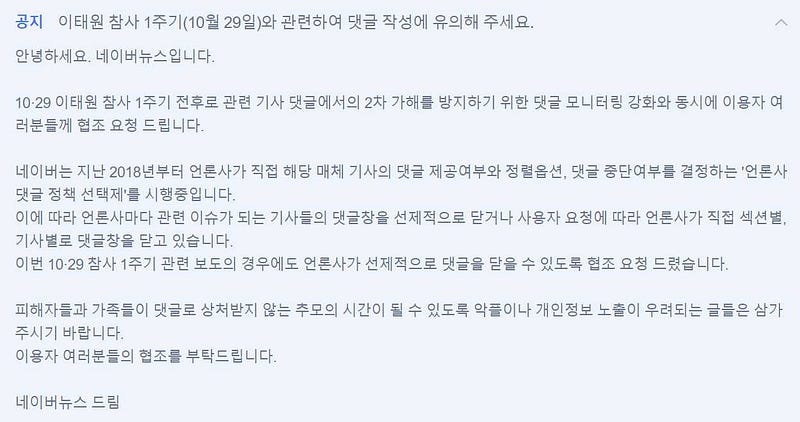 네이버 뉴스와 댓글에 2차 가해가 얼마나 많았는지 이 공지가 스스로 방증하고 있다. 네이버 뉴스는 정쟁을 부추긴 기사와 참사를 비난하고 조롱하는 악성 댓글을 아직까지 방치하고 있는데, 네이버 측이 언론사에 댓글창 닫기 협조를 구해도 언론사가 우이독경이면 속수무책일 수밖에 없다. 예컨대 조선일보의 <“청춘 150명 날려, 2새끼 퇴진!” 상가에 현수막 내건 野당원>(2022.11.4), 중앙일보의 <세월호 때와 다르다…이태원 참사에 尹·與지지율 추락 없는 이유>(2022.11.6)라는 기사 제목과 내용은 네이버 뉴스로서는 다소 문제가 있다. 두 기사는 참사를 정치적으로 엮어 풀려는 의도가 분명한 제목인데다 특히 조선일보 기사 제목은 욕설이 포함되어 전 연령이 이용하는 네이버에 서비스되기엔 부적절해 보인다. 특히 두 기사에 달린 수천 개의 댓글은 심각한 수준이다. 네이버 뉴스가 표현의 자유를 핑계로 모든 선택을 언론사에만 맡긴다면, 악성 댓글은 영원히 사라지지 않을 수 있다.
