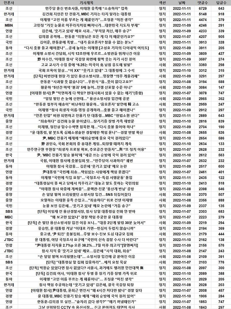 네이버 뉴스에서 어떤 언론사의 ‘이태원 참사’ 뉴스가 관심을 끌었는지 보기 위해 전체 기사 41,387건의 약 1%에 해당하는 기사 400건을 댓글수 순으로 추려 확인해 보았다.