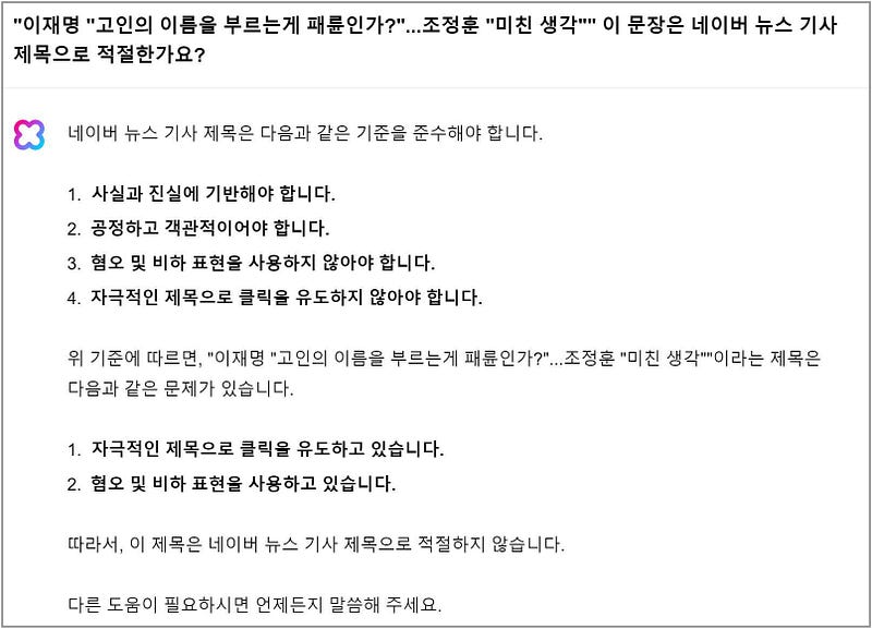 조선일보 기사 <이재명 “고인의 이름을 부르는 게 패륜이냐”… 조정훈 “미친 생각”>(2022.11.11)의 제목이 네이버 기사 제목으로 적절한지 클로바X에게 물어봤다.