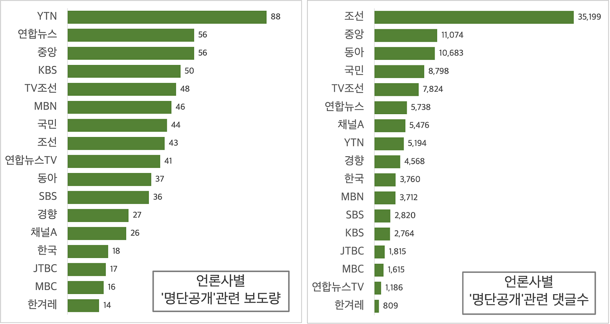 역시나 조선일보는 타 언론사보다 적은 수의 기사로 엄청난 양의 댓글을 ‘쓸어모았다’. 43건의 기사로 35,199건의 댓글이 달리는 조선일보 기사는 ‘불판’처럼 현안과 이슈를 불타오르게 하는 능력치가 현저히 높았다. 다만 그 불판에 올려진 댓글은 도저히 여기에 옮길 수 없을 만큼 어마어마한 악플 덩어리인 채로 아직 거기에 남아있다. 조선일보도 네이버도 손대지 않는 2차 가해성 댓글로 가득찬 악플창 말이다.
