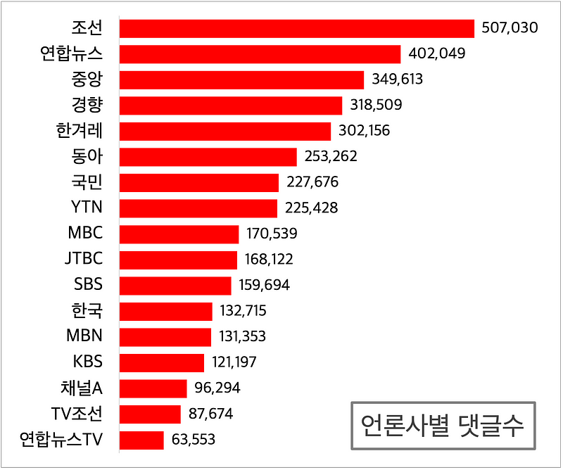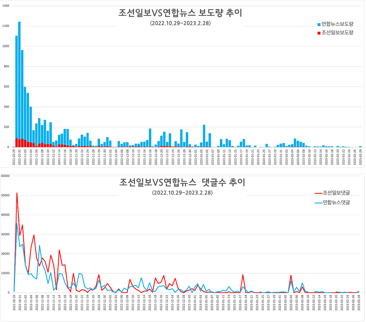 이태원 참사 뉴스에 댓글이 가장 많았던 언론사는 조선일보로 댓글수는 무려 50만 7천여 건이었다. 이는 전체 언론사 이태원 뉴스 댓글의 약 14%에 해당한다. 조선일보는 두 번째로 댓글이 많았던 연합뉴스보다 10만 5천여 건이나 많았다. 이태원 참사 뉴스 댓글의 언론사별 누적 합계는 연합뉴스 402,049건, 중앙일보 349,613건, 경향신문 318,509건, 한겨레신문 302,156건, 동아일보 253,262건, 국민일보 227,676건, YTN 225,428건 순이었다.