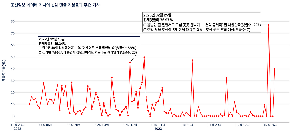 가령 위의 그림처럼 수집된 데이터 중 2023년 2월 25일자 조선일보 기사 댓글은 같은날 네이버 17개 언론사의 기사에 달린 댓글수의 약 77%를 차지한다. 그중에서도 <불법인 줄 알면서도 도심 곳곳 알박기… ‘천막 공화국’ 된 대한민국>이라는 기사는 수집된 데이터의 같은 날 기사 중 가장 많은 댓글을 받은 기사이다. 언론사들도 이태원 참사 이슈를 잘 다루지 않던 시기에 조선일보가 갑작스러운 이 기사를 낸 의도는 명확하다. 이태원 분향소를 ‘알박기’라며 맥락에 맞지 않는 표현으로 조롱하고, 또 다른 기사 <주말 서울 도심에 6개 단체 대규모 집회…도심 곳곳 혼잡 예상>와 이야기를 연결하는 것이다. ‘도심’,‘혼잡’,‘정체’,‘극심’,‘불편’,‘집회’ 등은 주말 조선일보 기사에 잘 등장하는 단어들로, 이태원 참사 유가족을 혼잡함을 가중시키는 주체로 지목해 부정적인 인상을 준다. 이 기사 2건에 달린 목불인견의 댓글들을 보고 있노라면 조선일보의 댓글 수집은 어쨌든 성공한 셈이다.