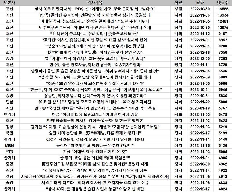 수집한 17개 언론사 전체 기사 중 댓글수 상위 기사 30건에 조선일보 기사는 16건이나 있었다. 댓글수 상위 10건 중 9건은 조선일보 기사였다. 섹션별로 ‘정치’ 19건, 사회 10건, 생활 1건이었다. 이태원 참사 관련 조선일보의 정치 섹션 기사가 네이버 뉴스 독자의 관심을 크게 끌었다고 볼 수 있다.