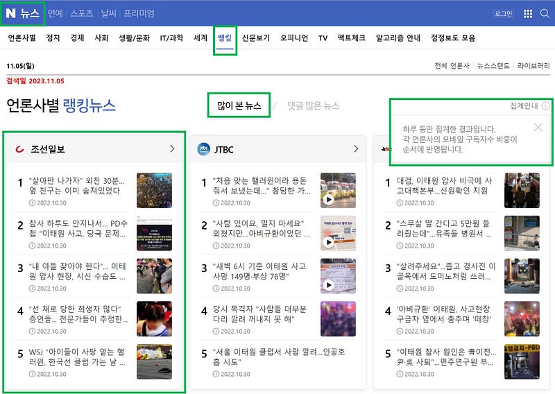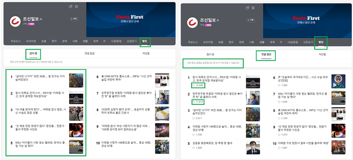우리는 2022년 10월 30일 하루 동안 많이 본 조선일보 1,2위 기사와 댓글 많은 기사 1,2위를 네이버 뉴스 홈페이지를 통해 확인해 보았다. 많이 본 기사 1위는 <“살아만 나가자” 외친 30분… 옆 친구는 이미 숨져있었다>였고, 2위 기사는 <참사 하루도 안지나서… PD수첩 “이태원 사고, 당국 문제점 제보받아요”>였다. 댓글 많은 기사 1위는 많이 본 뉴스 2위 기사였고, 2위 기사는 <민주연구원 부원장 “이태원 참사 원인은 靑이전 탓” 글 올렸다 삭제>였다.