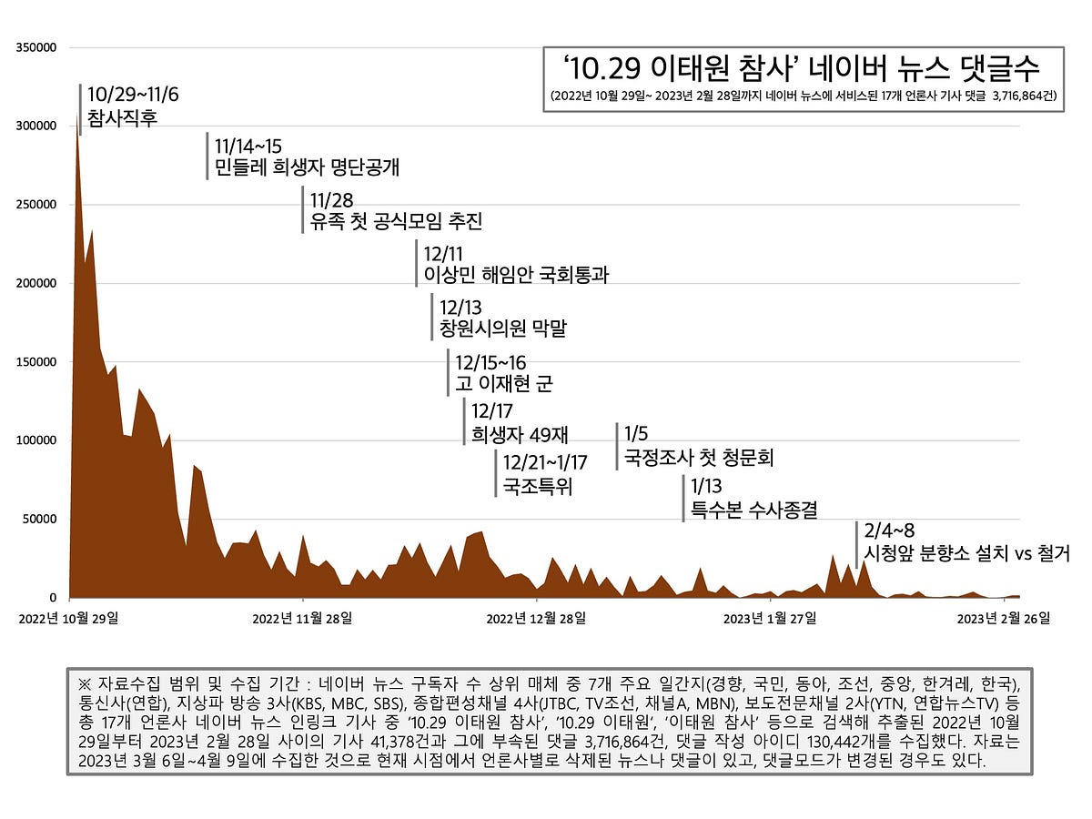 ‘이태원’ 관련 키워드로 수집한 참사 직후부터 2월 말까지 17개 언론사 네이버 인링크 기사에 달린 댓글은 총 3,716,864건이었다. 댓글수 추이를 보면 이태원 참사와 관련된 특정 이슈가 있을 때 댓글 반응이 있었던 지점이 있다.