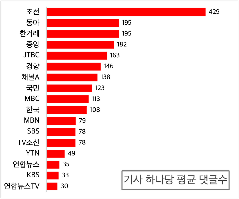 기사당 평균 댓글수 분석 결과 조선일보는 기사당 평균 429건, 동아일보와 한겨레신문은 각각 195건, 중앙일보는 182건이다. 모든 기사에 평균 댓글수가 달리는 건 아니다. 댓글이 하나도 없는 이른바 ‘무플’ 기사도 있고 많게는 수천 건이 넘는 댓글이 달리기도 한다. 보도량 대비 댓글수는 네이버 댓글을 효율적으로 활용한 언론사를 찾는 하나의 방법 정도로 이해하면 좋겠다.