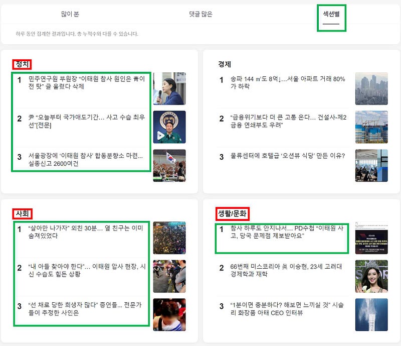 이날 조선일보의 ‘많이 본 뉴스’와 ‘댓글 많은 뉴스’는 적어도 상당한 관계가 있었다고 추정할 수 있다. 어떤 섹션에 기사인지도 확인했다. 데이터 중 가장 댓글이 가장 많이 달린 장상진 기자의 <“살아만 나가자” 외친 30분… 옆 친구는 이미 숨져있었다>는 생뚱맞게 ‘생활/문화’ 섹션으로 분류되어 있었다. 많이 본 뉴스 1,3,4위 기사는 ‘사회’ 섹션이었고, ‘정치’ 섹션에 댓글 많은 뉴스 두 건이 포함되어 있었다.