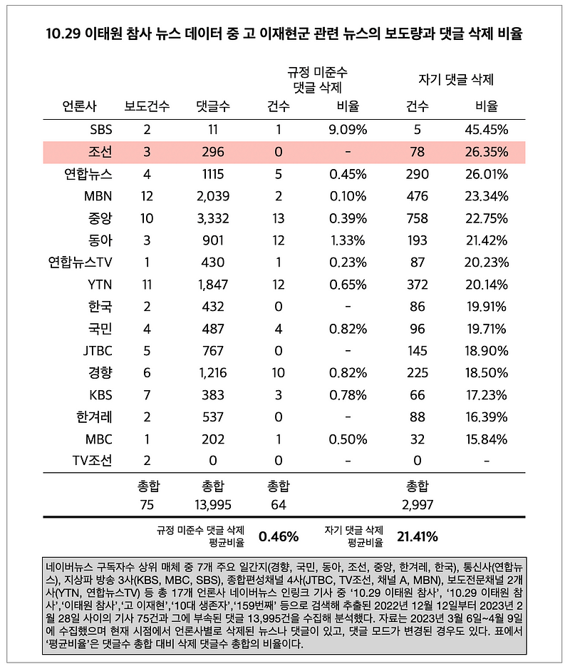 각 언론사의 이태원 참사 기사에 달린 댓글 전체를 분석한 결과, 댓글 작성자 스스로 댓글을 삭제한,‘자기 삭제 비율’이 24.14%로 상대적으로 높은 언론사는 조선일보였다. 네이버뉴스 조선일보 독자들은 기사 댓글을 썼다가 지우는 경향이 타 언론사보다 높다는 의미로 해석할 수 있다. 특히 고 이재현 군 관련 조선일보 기사에 댓글을 단 사람들은 더 많이 댓글을 삭제했는데, ‘자기삭제비율’이 26.35%로 상당히 높은 편이라 할 수 있다. 네이버뉴스가 삭제한 ‘규정 미준수 삭제 비율’은 언론사 평균 0.37%에 불과해 큰 차이가 없었다. 동아일보, 조선일보, 중앙일보, MBC의 ‘규정 미준수 삭제 비율’은 0.4%를 넘어 평균치를 상회했다.