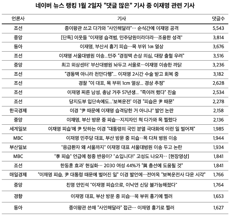 네이버 뉴스 언론사별 랭킹뉴스를 활용해 1월 2일 하루 ‘이재명 대표 피습’ 기사 중 댓글 많은 보도 20건을 추출해보았다. ‘조선일보’ 7건, ‘중앙일보’ 4건으로 11건이나 되었다. ‘조선일보’와 ‘중앙일보’ 기사에 유독 댓글이 몰려있다. 실시간으로 뉴스 댓글을 작성하는 매우 적극적인 독자들이 많다는 것을 의미할 것이다.