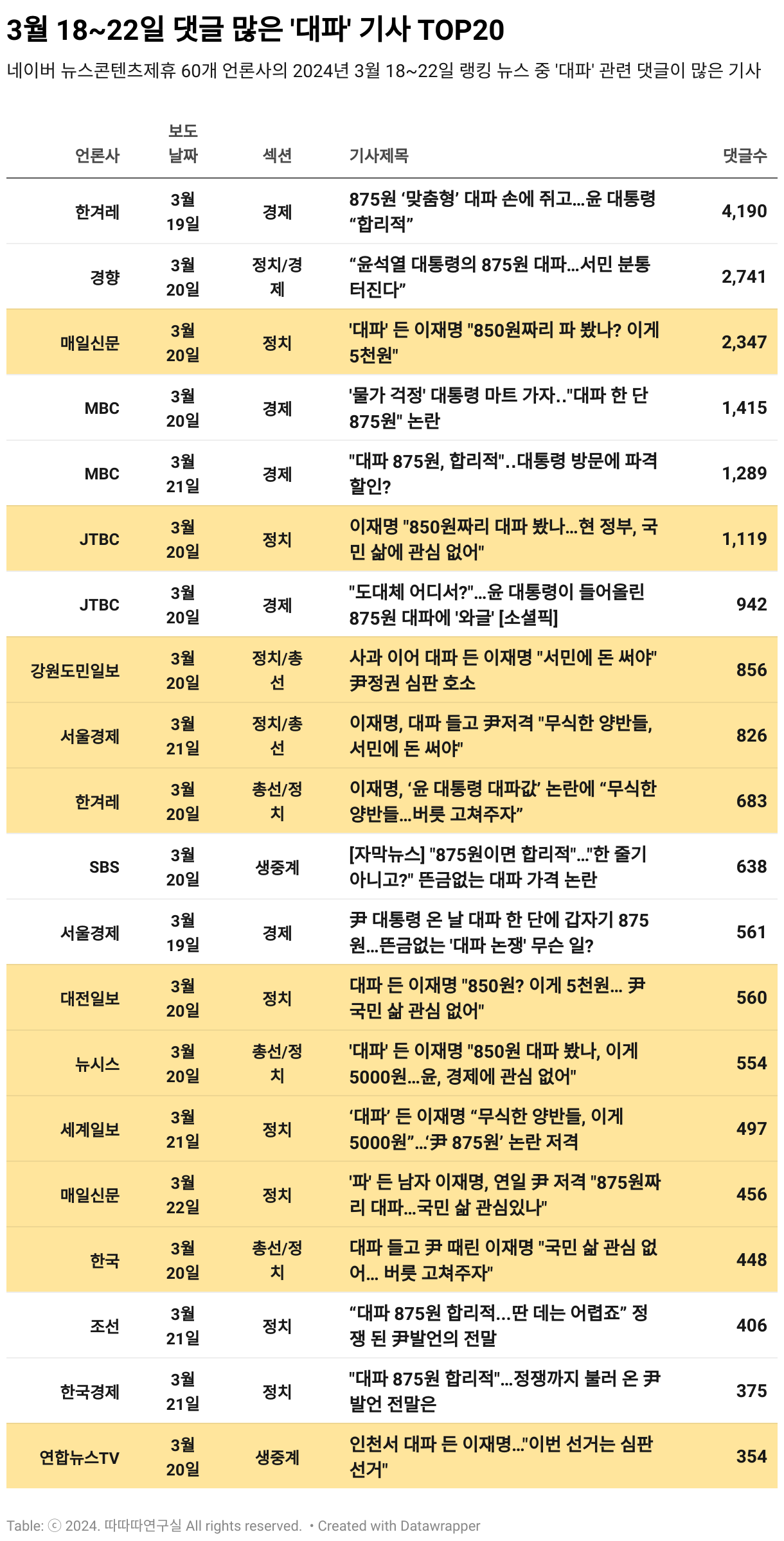이재명을 기사 제목에 넣어야 흥한다는 걸 여실히 보여주는 ‘대파게이트’(아래 표). 실제로 댓글 많은 ‘대파게이트’ 기사 20건 중 11건에 이재명 대표가 포함되어 있다. 언론 다수가 이재명 대표의 말실수로 보이게끔 따옴표 제목에 어떻게든 욱여 넣었으나, 그가 ‘대파게이트’의 주인공이 될리는 만무하다. 도대체 어디에서 875원에 구입할 수 있단 말인가. 최초에 尹이 남긴 대파향이 너무 강하다. 그래서 尹의 ‘대파게이트’일 뿐. 대파와 이재명으로 흥해보겠다는 기자님들의 노고가 가상하다.